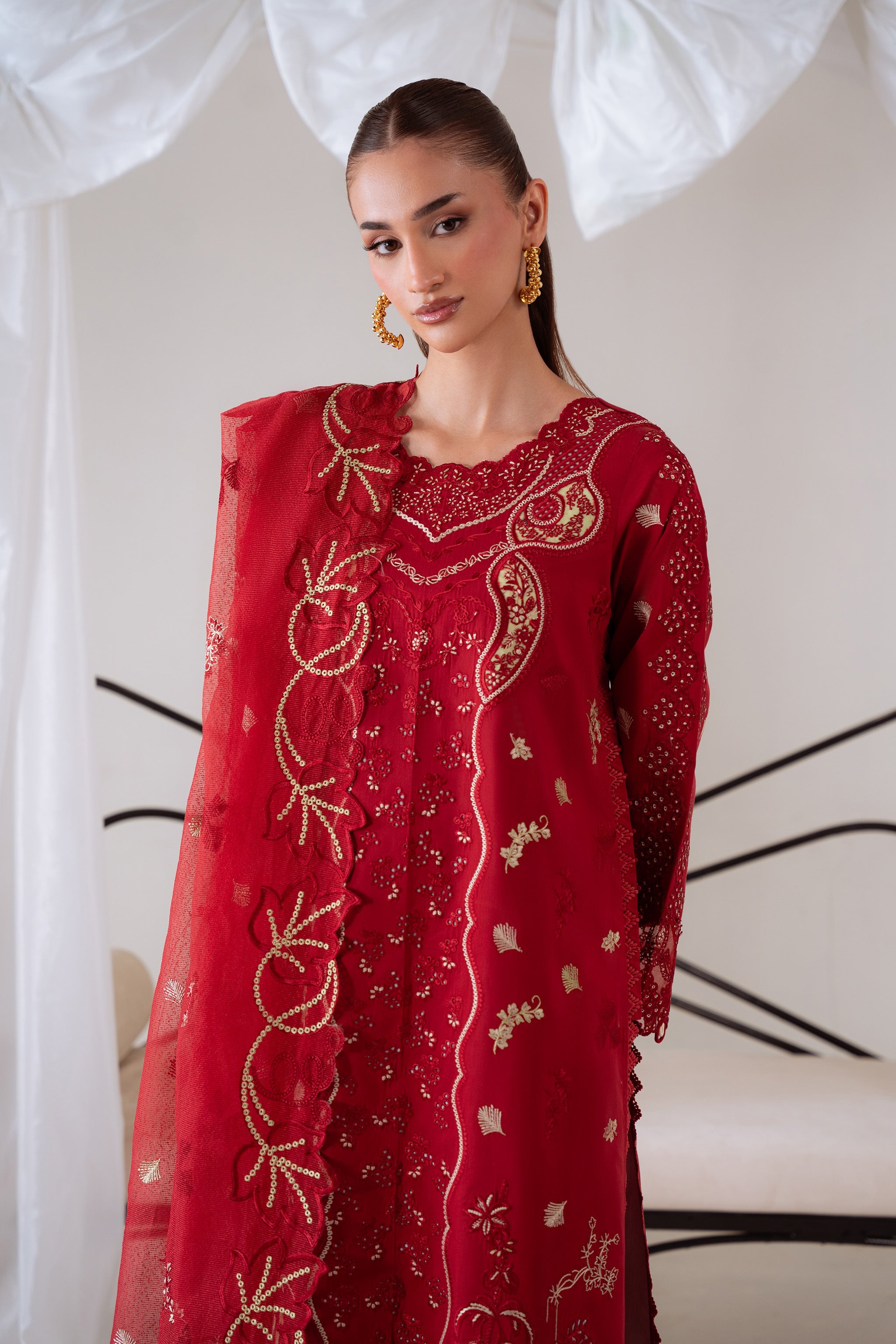 Summary: Step into sophistication with the Aabyaan Miraal Pakistani suit in a captivating red. Crafted from luxurious Viscose, this outfit is designed for the Fall/Winter season, offering both comfort and a graceful drape. The kameez is a masterpiece of craftsmanship, featuring exquisite Laser Chikankari embroidery on the front and sleeves, with beautifully detailed borders enhancing the daman. The rich red color makes this ethnic wear a perfect choice for celebratory functions, particularly as elegant wedding wear. This festive ensemble ensures you make a memorable impression at any grand event, embodying traditional Pakistani artistry.