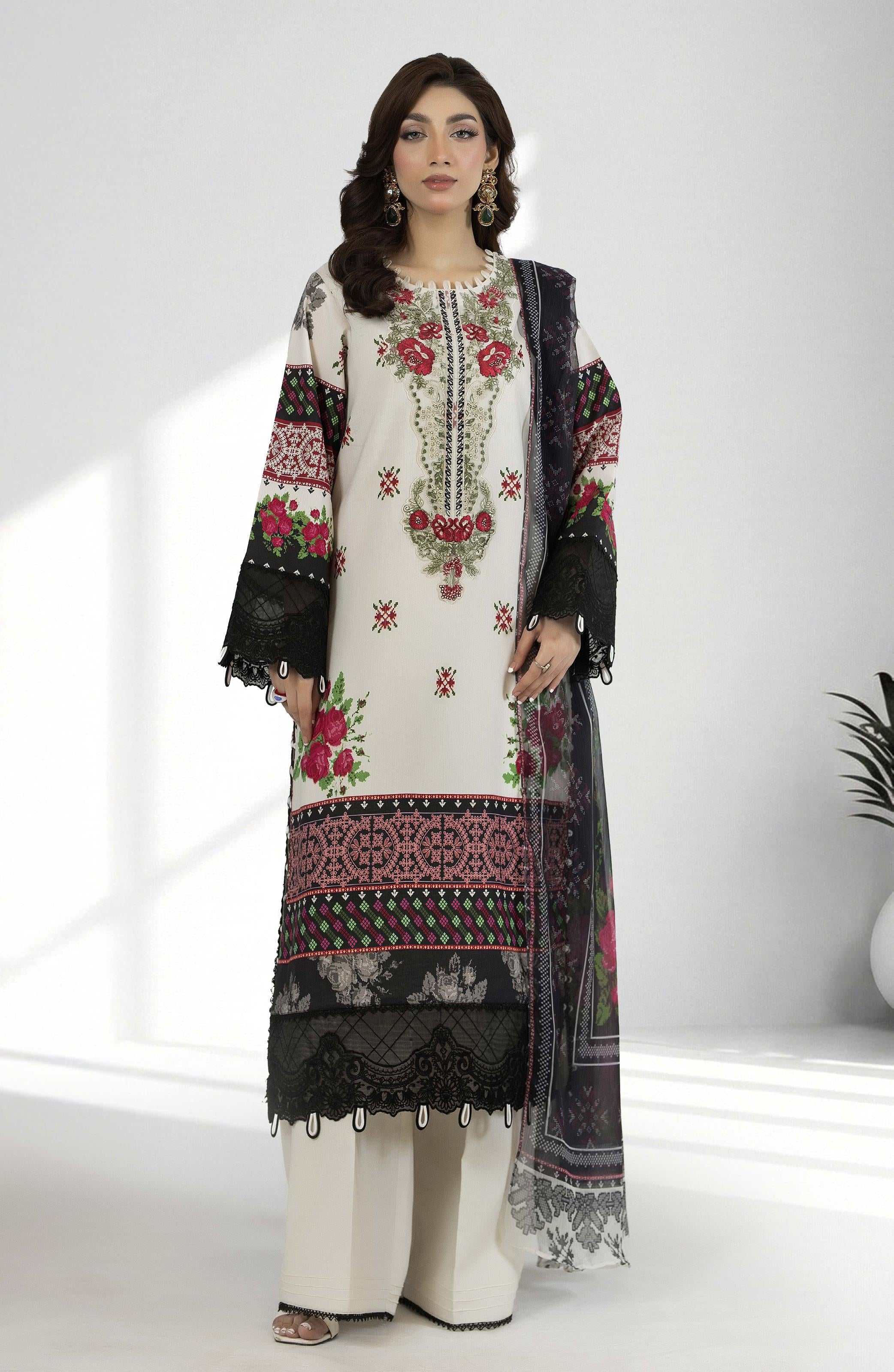 Summary: Embrace timeless elegance with this off-white Pakistani suit from the Adan's Libas Lawn Prints Spring/Summer '26 collection. The ensemble features a beautifully designed digital printed lawn shirt, renowned for its lightweight and breathable feel, making it an ideal choice for warm weather. This sophisticated Pakistani dress combines classic style with contemporary prints and embroidered details, creating a stunning visual appeal. Paired with a flowing Bamber Chiffon dupatta, this unstitched outfit is perfect for creating a personalized look. As a versatile piece of ethnic wear, it's perfect for formal gatherings or festive celebrations.