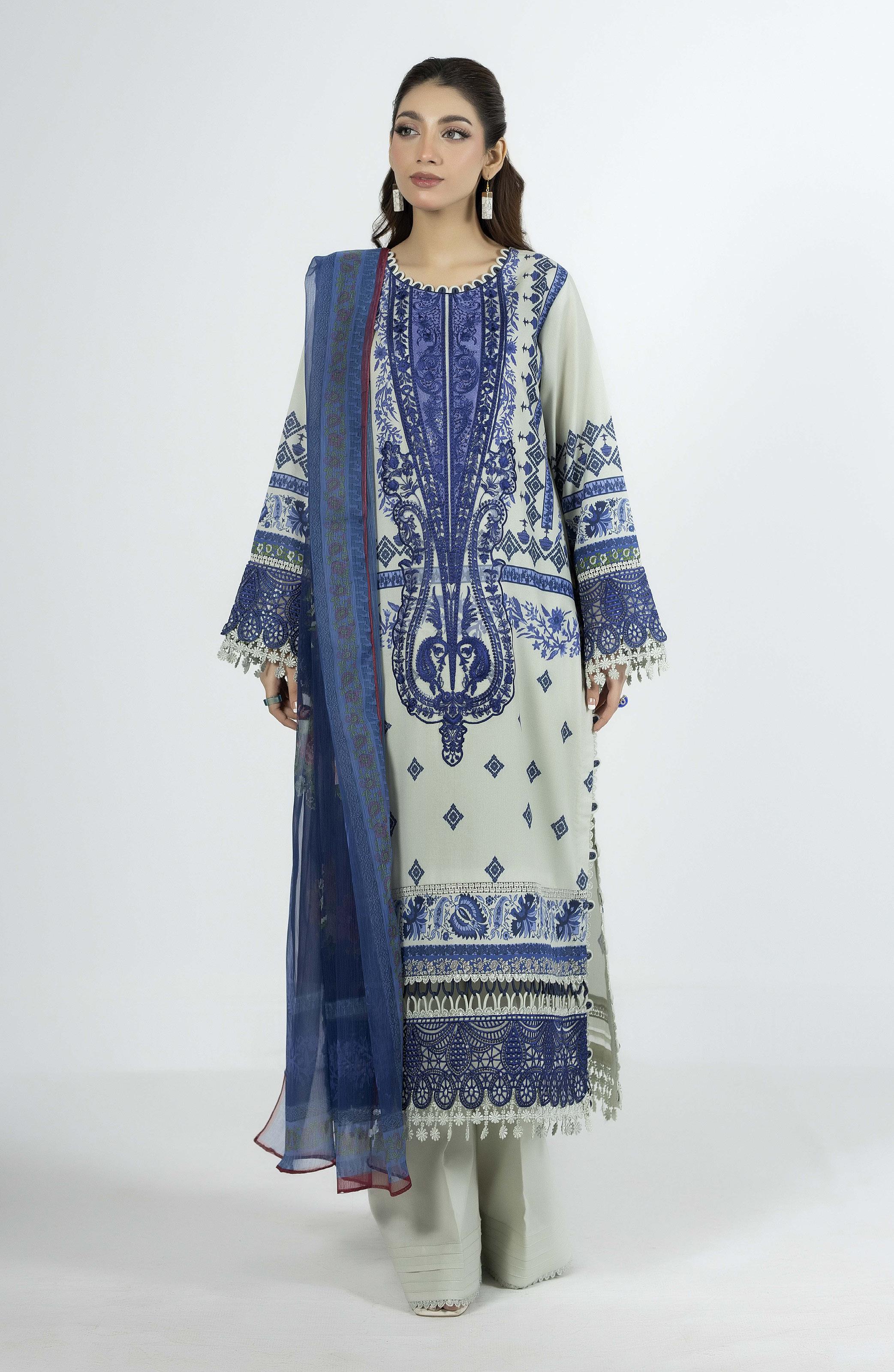 Summary: Step into summer with this exquisite Pakistani suit from Adan's Libas. The kameez, featured in a serene light grey, is tailored from premium lawn, a fabric celebrated for its breathability, making it a staple for Spring/Summer ethnic wear. This Pakistani Lawn Dress is adorned with striking blue digital prints, offering a modern yet traditional aesthetic. The ensemble is completed with a flowy Bamber Chiffon dupatta that adds a touch of grace. This versatile summer outfit is perfect for creating a sophisticated look for daily wear, festive gatherings, or an elegant Eid celebration.