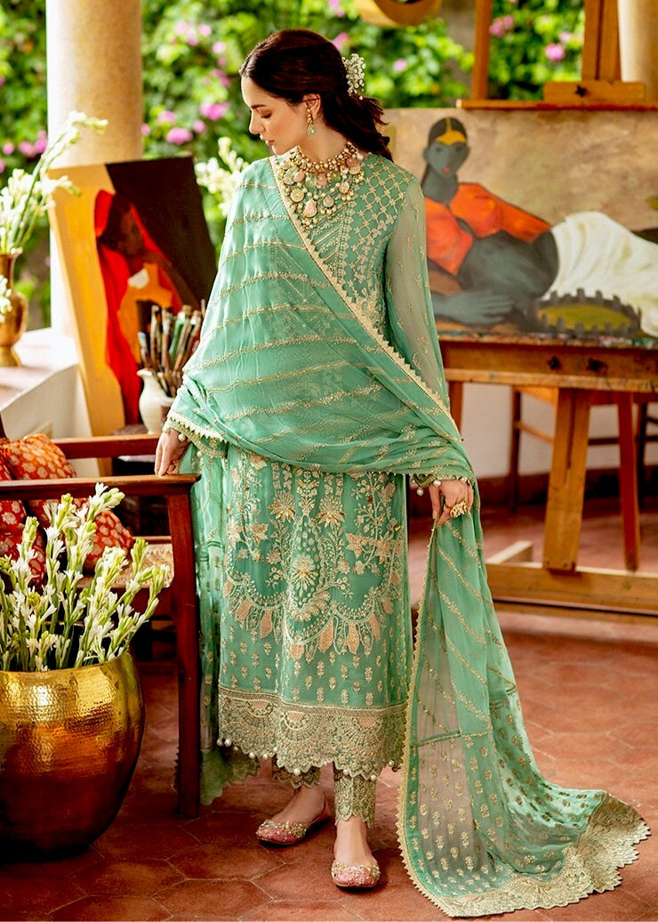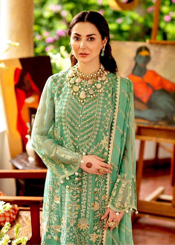 Fabric: Spend the fall season in comfort and style, with Johartaal from the Shehnai collection. Hania Amir is wearing this beautiful ensemble with ultimate grace. Its shining golden embroidery jumps out from the lighter background, making this the perfect piece for festive occasions. Embroidered chiffon Front: (1 meter) Embroidered chiffon back: (1meter) Embroidered chiffon sleeves: (0.75 yard) Embroidered organza border for front/back: (2 meter) Embroidered organza border for front: (1 meter) Embroidered chiffon dupatta: (2 yard) Embroidered chiffon two side border for dupatta: (2.5 meter) Embroidered Raw silk trousers:(2.5 yard) Embroidered organza border for trousers: (1 meter) |