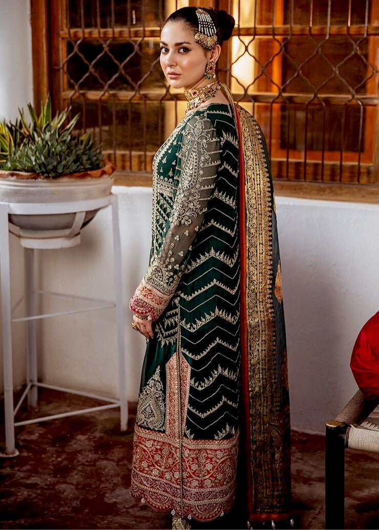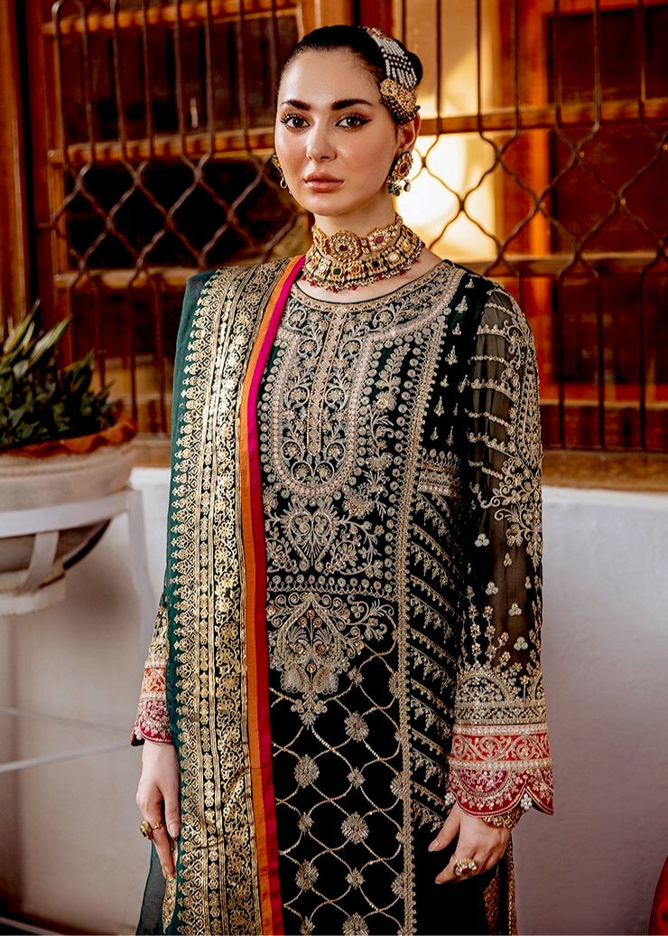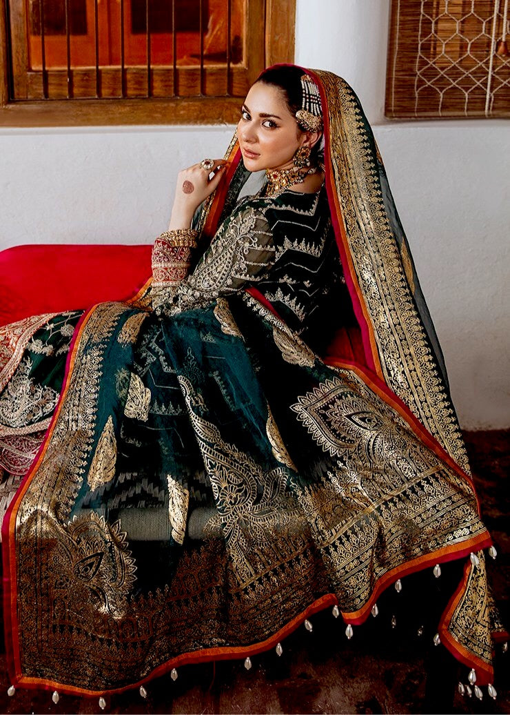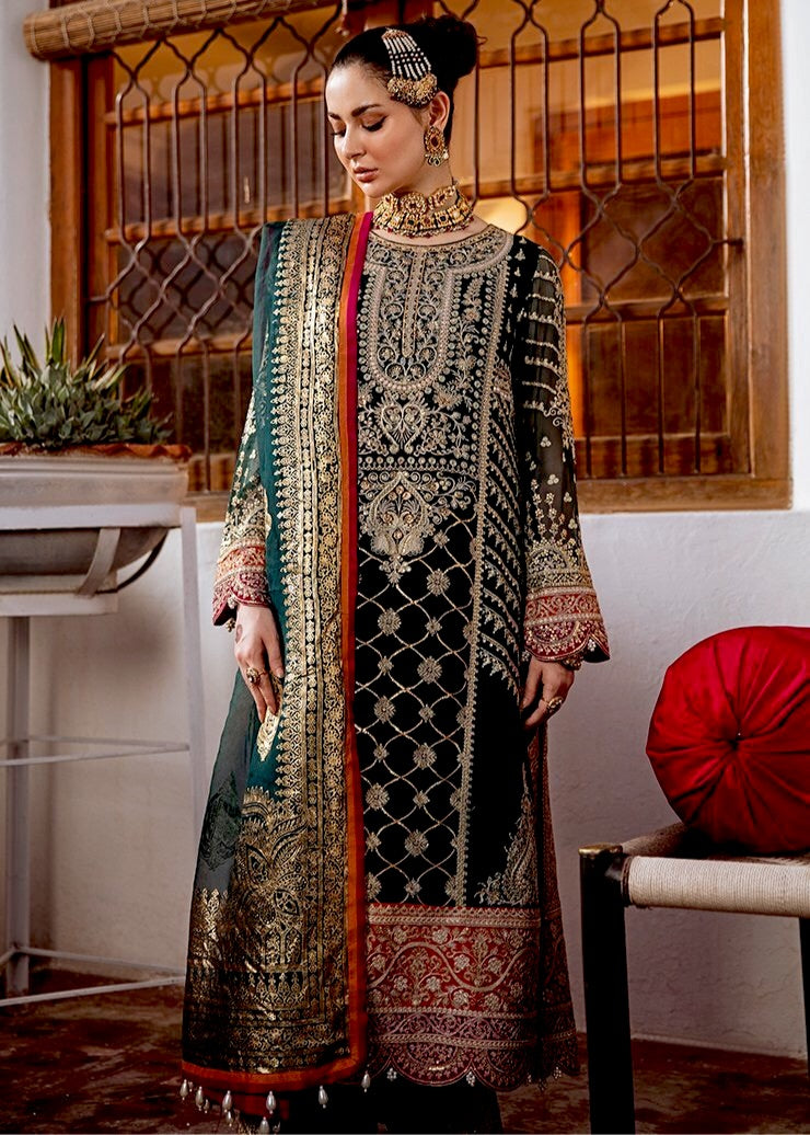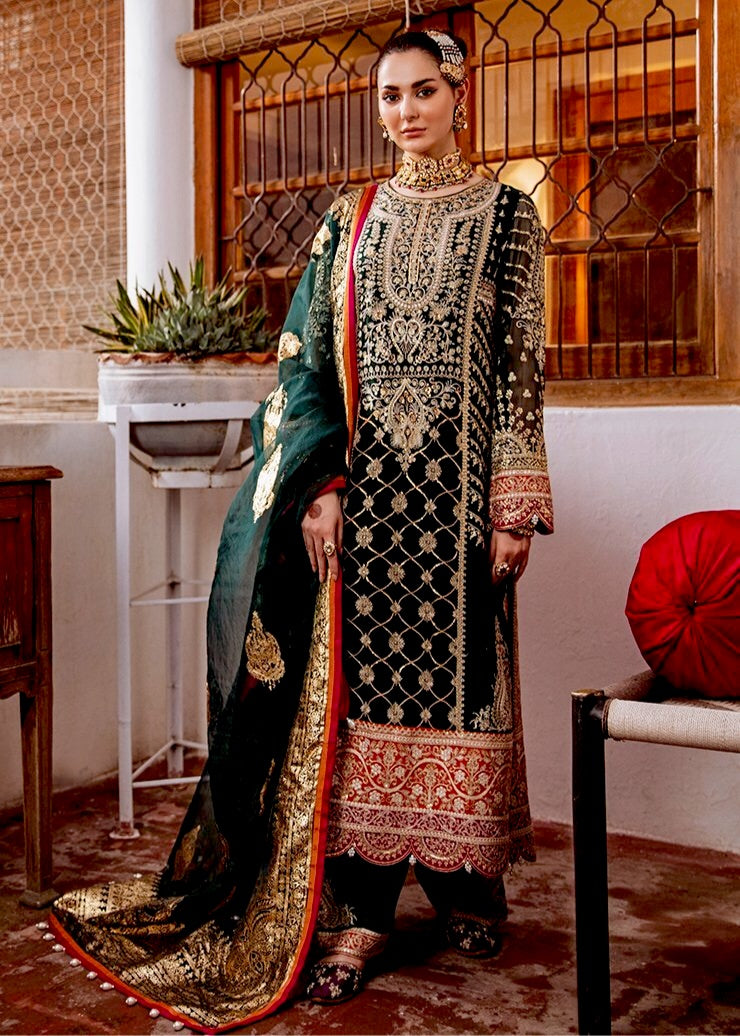 Fabric: Raatkumari features a dark background reminiscent of a beautiful forest canopy, with golden embroidery weaving its way through. All these elements in this matchless dress worn by the elegant Hania Amir combine to create a lasting impact. Embroidered chiffon Front center panel: (13 inches) Embroidered chiffon Front side panels: (13 inches) (2 pieces) Side borders: (2 meter) Embroidered chiffon back: (1meter) Embroidered chiffon sleeves: (0.75 yard) Embroidered raw silk border for sleeves: (1 meter) Embroidered Raw silk border for front/back: (2 meter) Embroidered Raw silk border for front/back: (2 meter) Paste printed organza dupatta: (2 yard) Embroidered Raw silk trousers patch:(2 pieces) Raw silk trousers: (2.5 yard) Raw silk trouser border: (1 meter) |