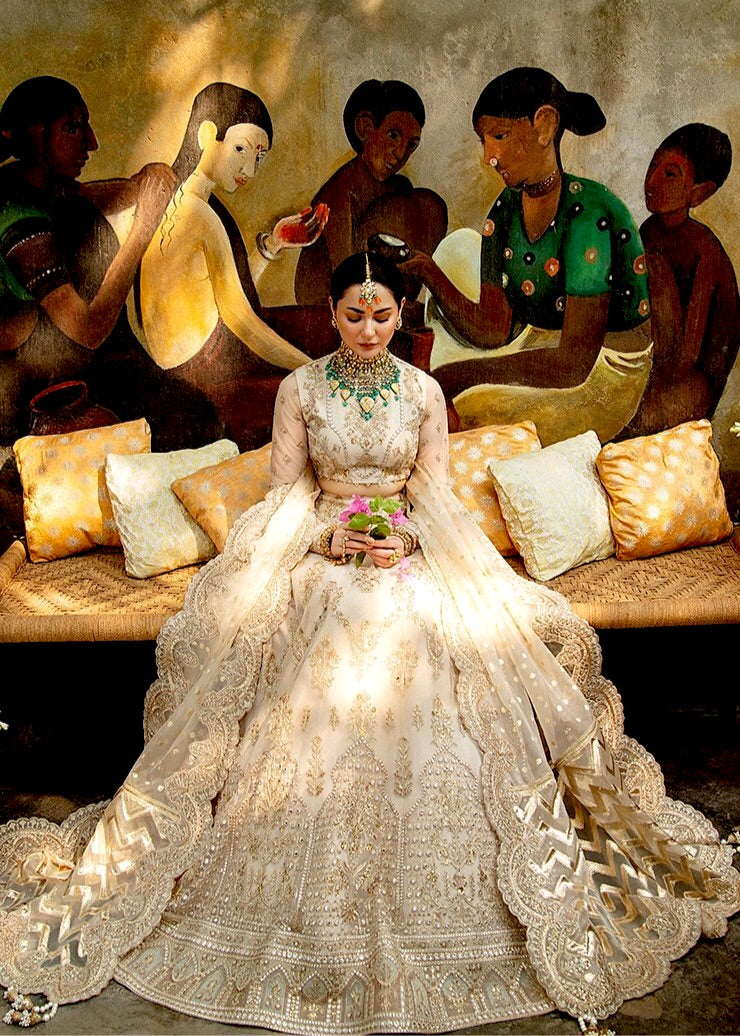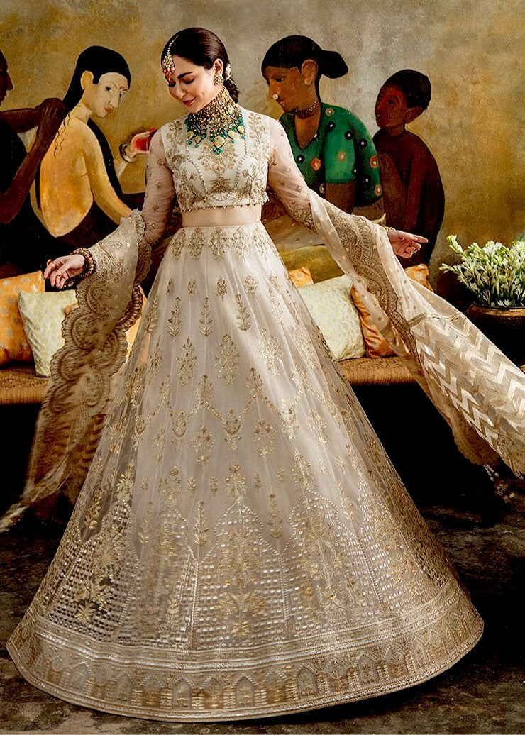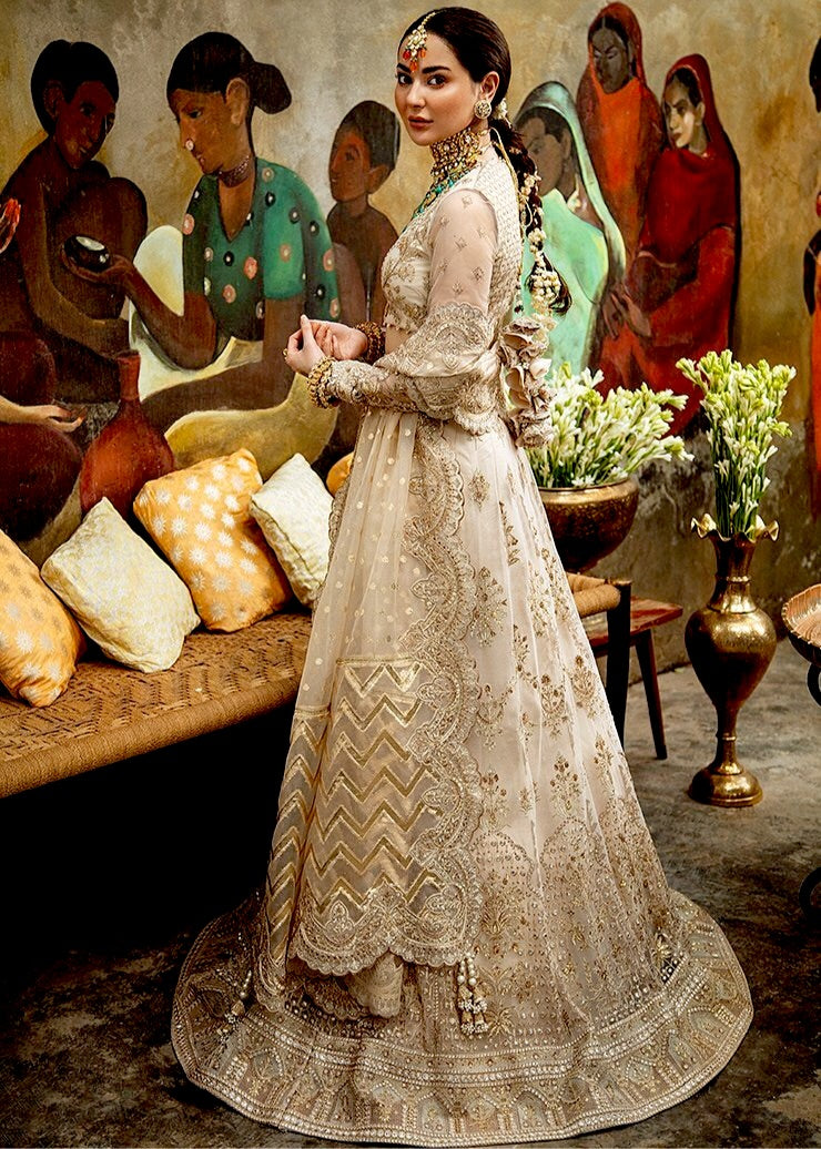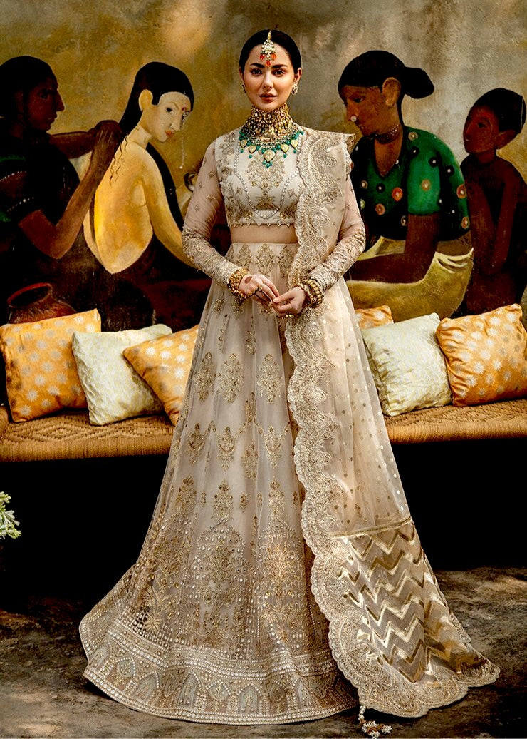 Sharar is a true treasure, reminiscent of a perfect, unmarred pearl, yet somehow made even more radiant through the golden embroidery. Hania Amir recommends it as A must-have from the Shehnai Collection.