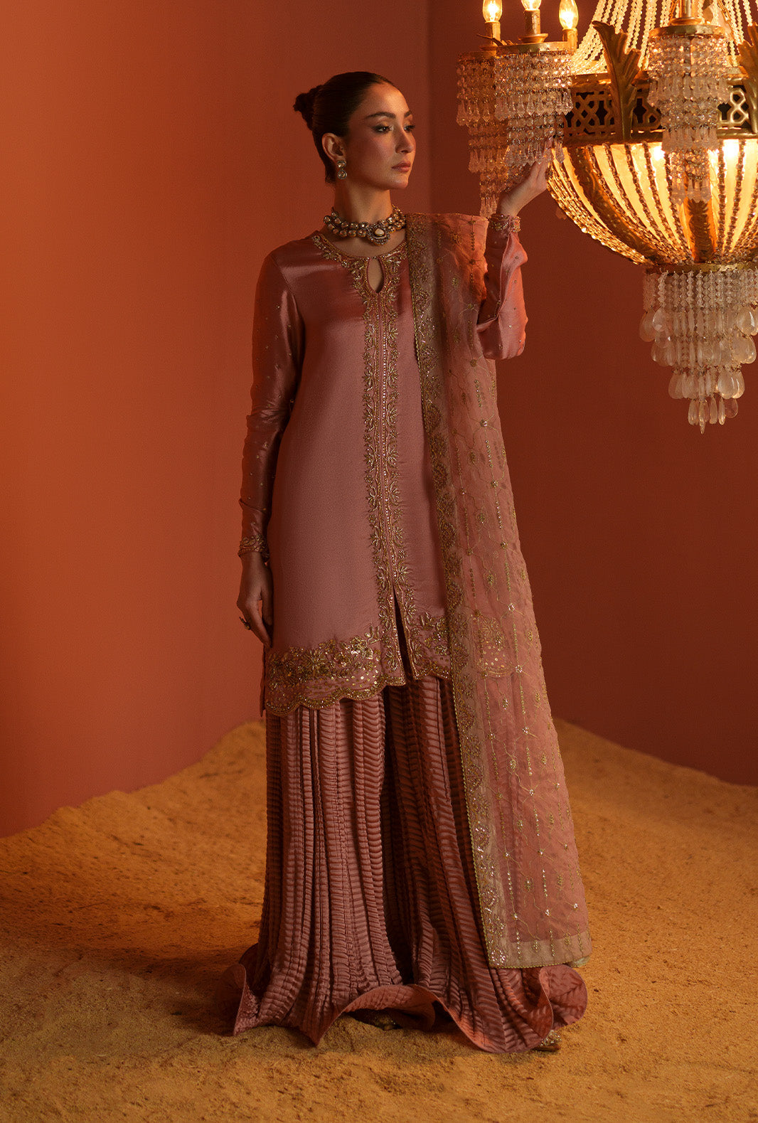 Summary: Discover refined elegance with this exquisite pink Pakistani suit, a standout piece from our luxury ethnic wear collection. Masterfully crafted from lustrous Sheesha silk, this formal wear features a beautifully tailored shirt adorned with intricate, golden embroidery along the neckline and hemline for a majestic look. It is perfectly paired with a flowing, crushed silk sharara that adds graceful movement and volume. The light, breathable silk fabric makes this Pakistani summer dress perfectly suited for Spring/Summer events. Ideal for evening soirees, wedding guest attire, or festive Eid celebrations. Elevate your wardrobe with this stunning festive outfit. Shop online today!