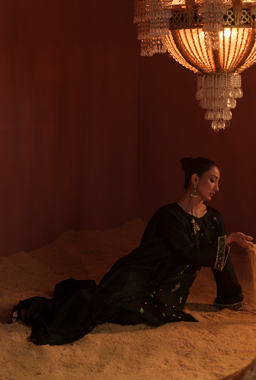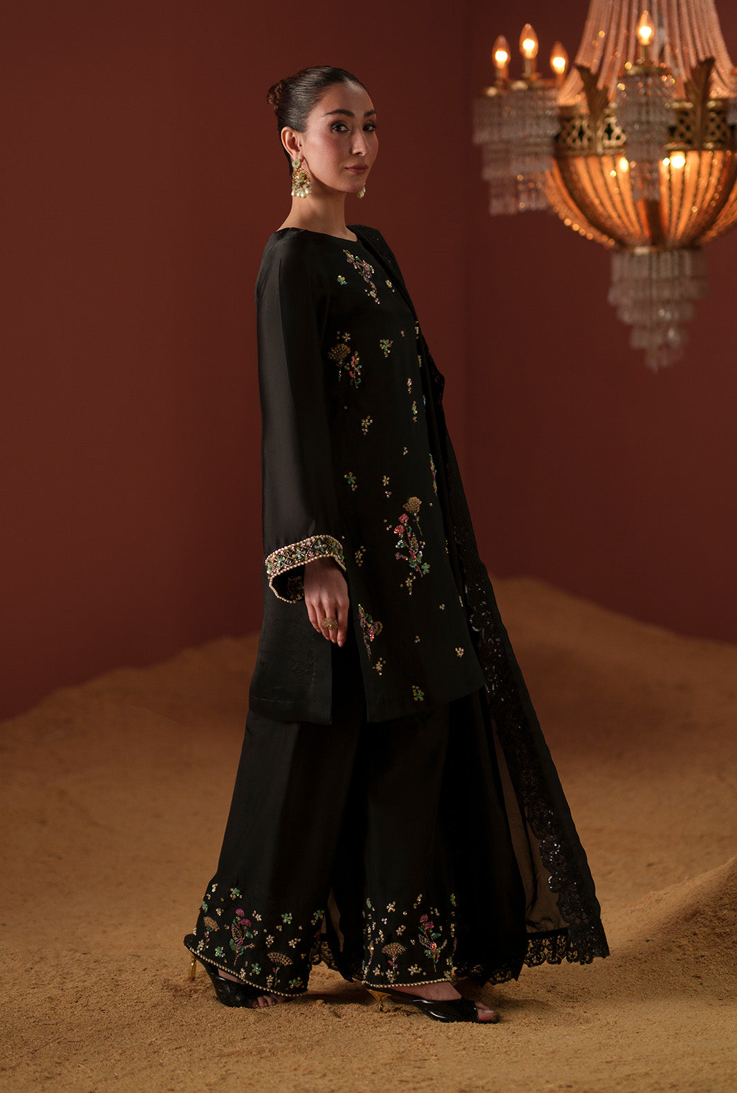 Summary: Elevate your evening wardrobe with this exquisite black Pakistani suit, crafted from luxurious silk. The main kameez features a sophisticated straight silhouette adorned with delicate floral embroidery scattered across the front, offering a refined, elegant look. Perfect for the spring/summer season, the breathable yet rich silk fabric drapes beautifully, making it an ideal choice for formal gatherings and evening events. This black silk dress seamlessly blends traditional craftsmanship with modern party wear aesthetics. Complete your festive clothing collection with this stunning ethnic wear ensemble. Shop online to secure this timeless piece for your next special occasion or elegant dinner.