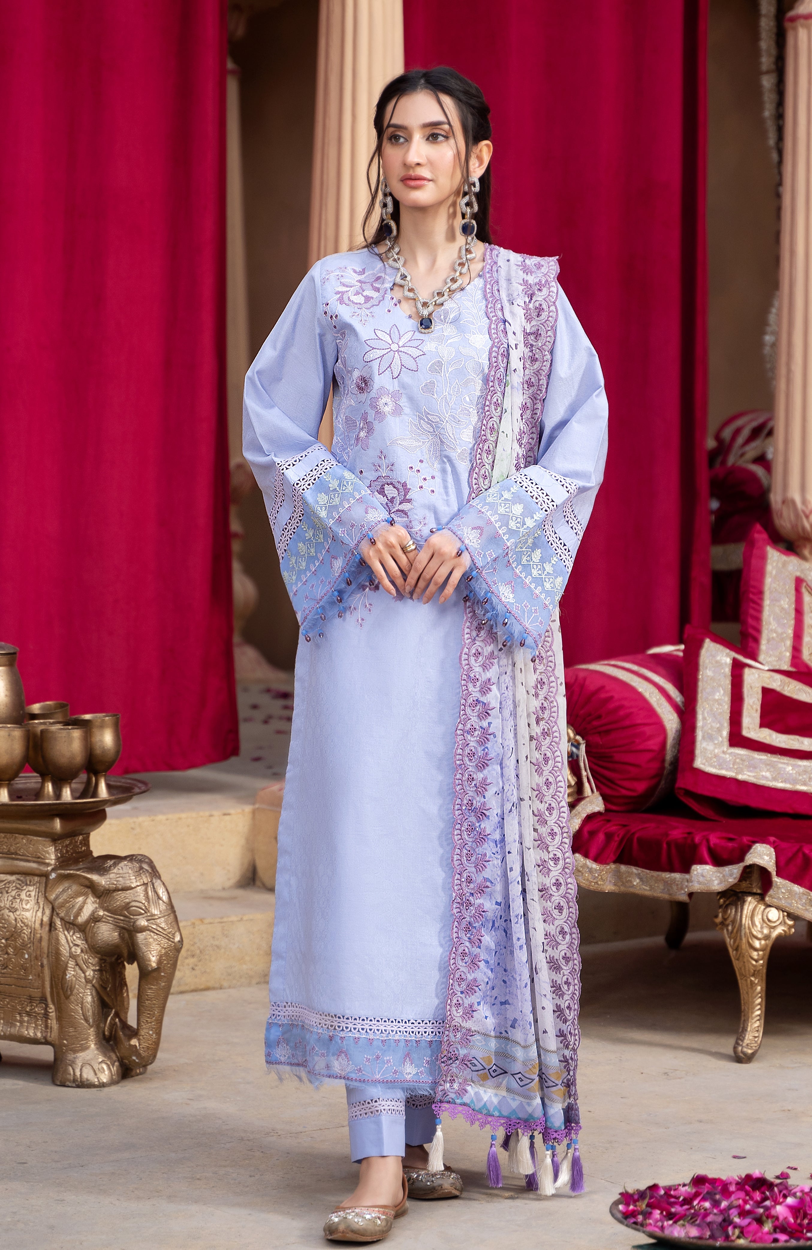 Fabric: Fabric Details: • Shirt Front on Dyed Self-Jacquard • Shirt Back on Dyed Self-Jacquard • Sleeves on Dyed Self-Jacquard • Digital Printed Chiffon Dupatta • Dyed Cambric Trouser Embroidery Details: • Embroidered Chikankari Shirt Front with Cross Stitch and Kashmiri Tanka. • Embroidered Chikankari Daman Border on Organza. • Embroidered Chikankari Sleeves Border on Organza. • Embroidered Chikankari Back. • Embroidered Scalloped Chikankari Dupatta. |