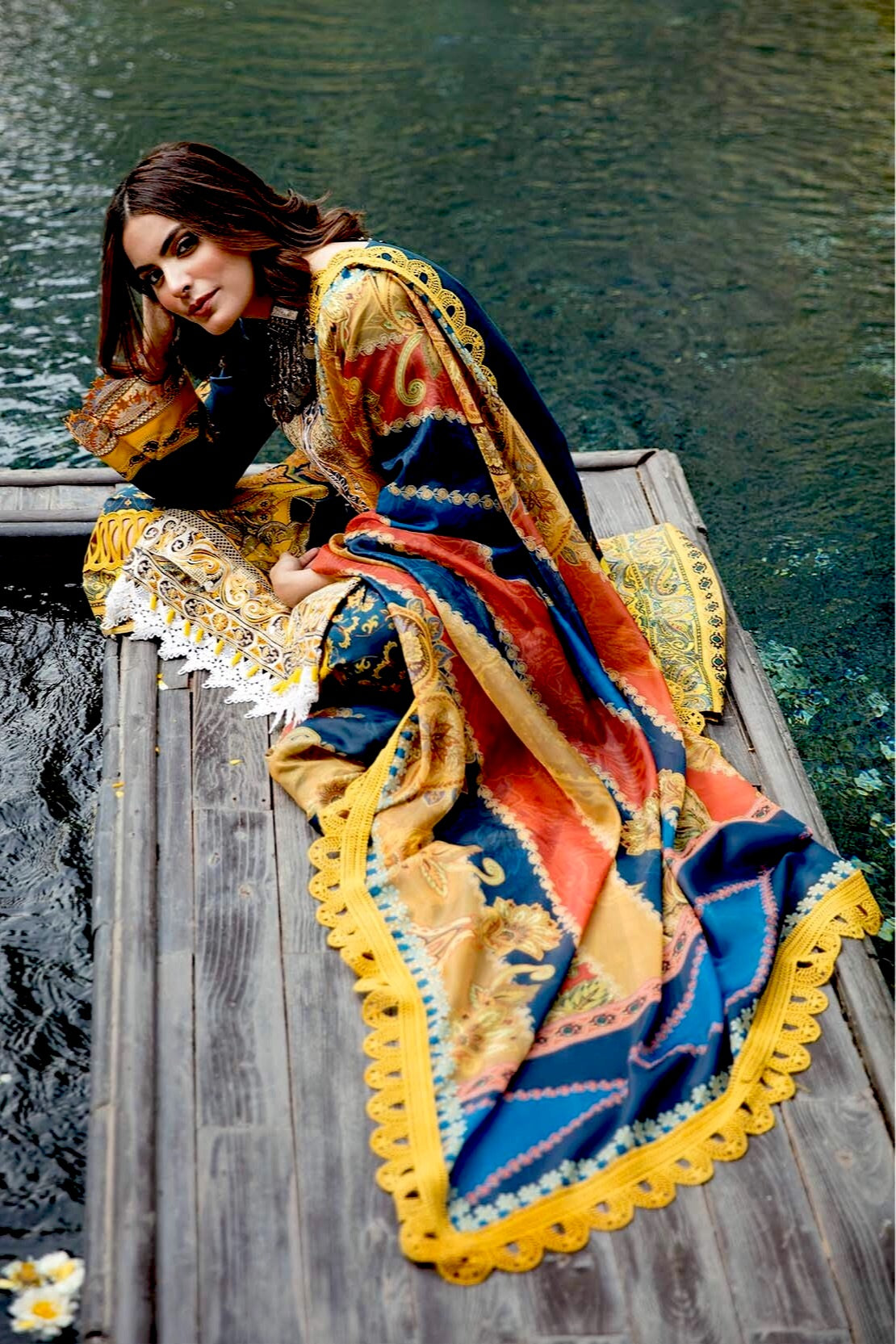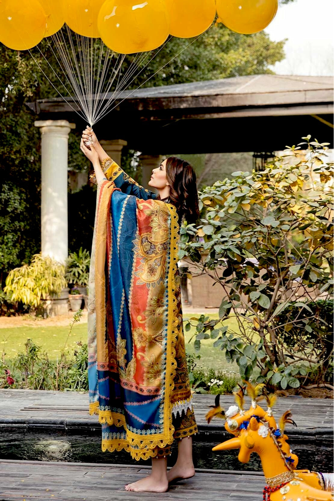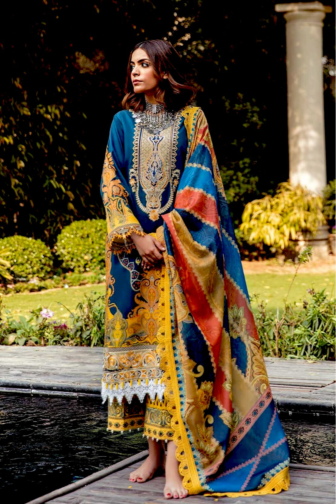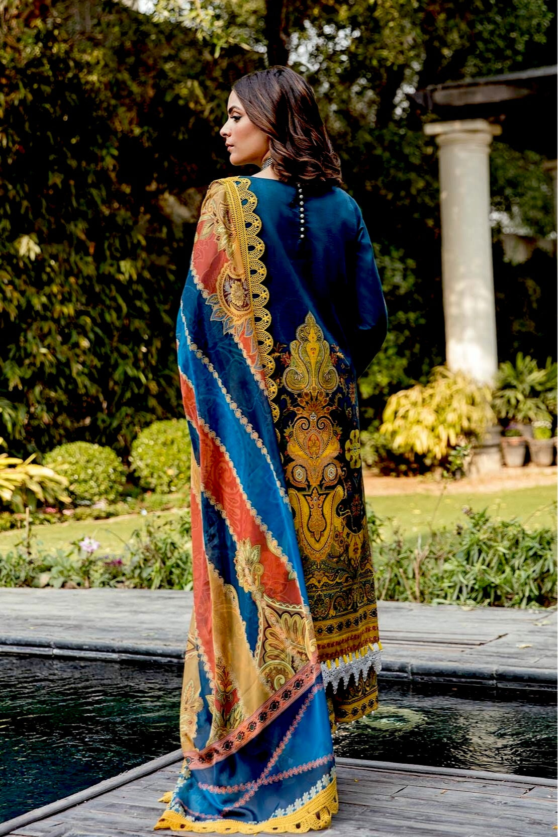 Fabric: The artfully composed Jashan is a true display of festive, a right shade of refreshing blue canvas featuring celebratory embroideries, an exaggerated print with a neckline patch provided with an intricate border and paired with printed trousers and a stunning silk printed tonal dupatta. Product Details Digitally Printed 1.18m Lawn Shirt (Front) Digitally Printed 1.18m Lawn Shirt (Back) Digitally Printed 0.68m Lawn Shirt (Sleeves) Digitally Printed 2.5m Lawn Trouser Printed 2.5m Silk Dupatta Embroidered Neckline Embroidered Border |