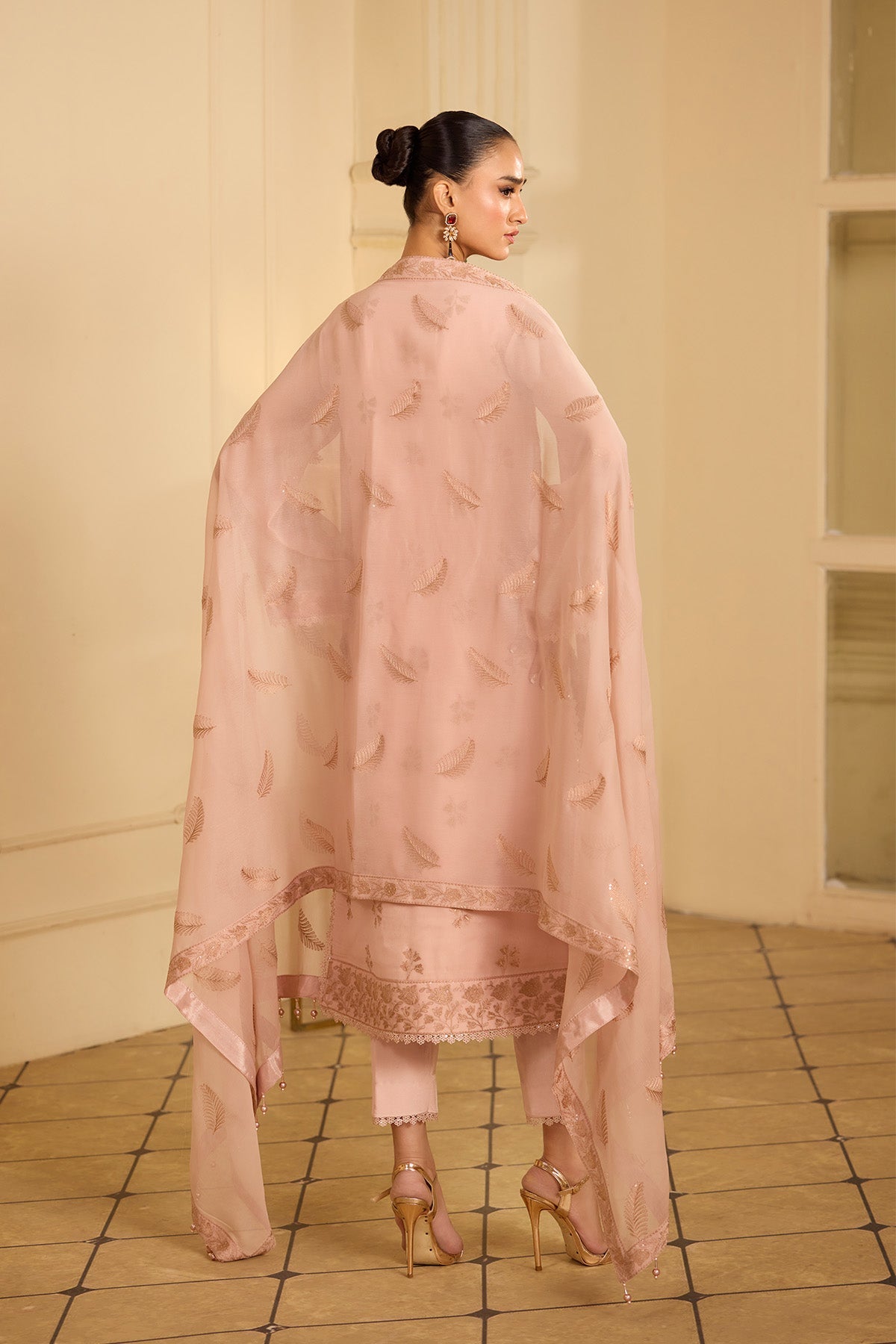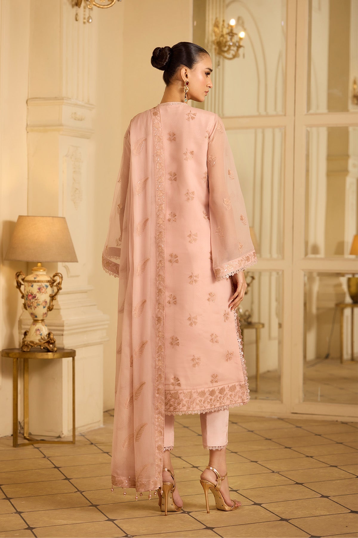 Summary: Step into elegance with this beautiful peach Pakistani suit from the Alizeh Luxury Festive Formals collection. Crafted from lightweight chiffon, this stunning unstitched dress material is perfect for Spring and Summer celebrations. The main kameez features intricate embroidery across the front, back, and sleeves, creating a refined look for festive clothing. Paired with a matching embroidered chiffon dupatta and dyed raw silk trousers, this Pakistani dress blends traditional charm with modern grace. The soft peach tone makes it an ideal choice for daytime events, Eid celebrations, or elegant formal wear. Shop online to elevate your ethnic wear wardrobe!