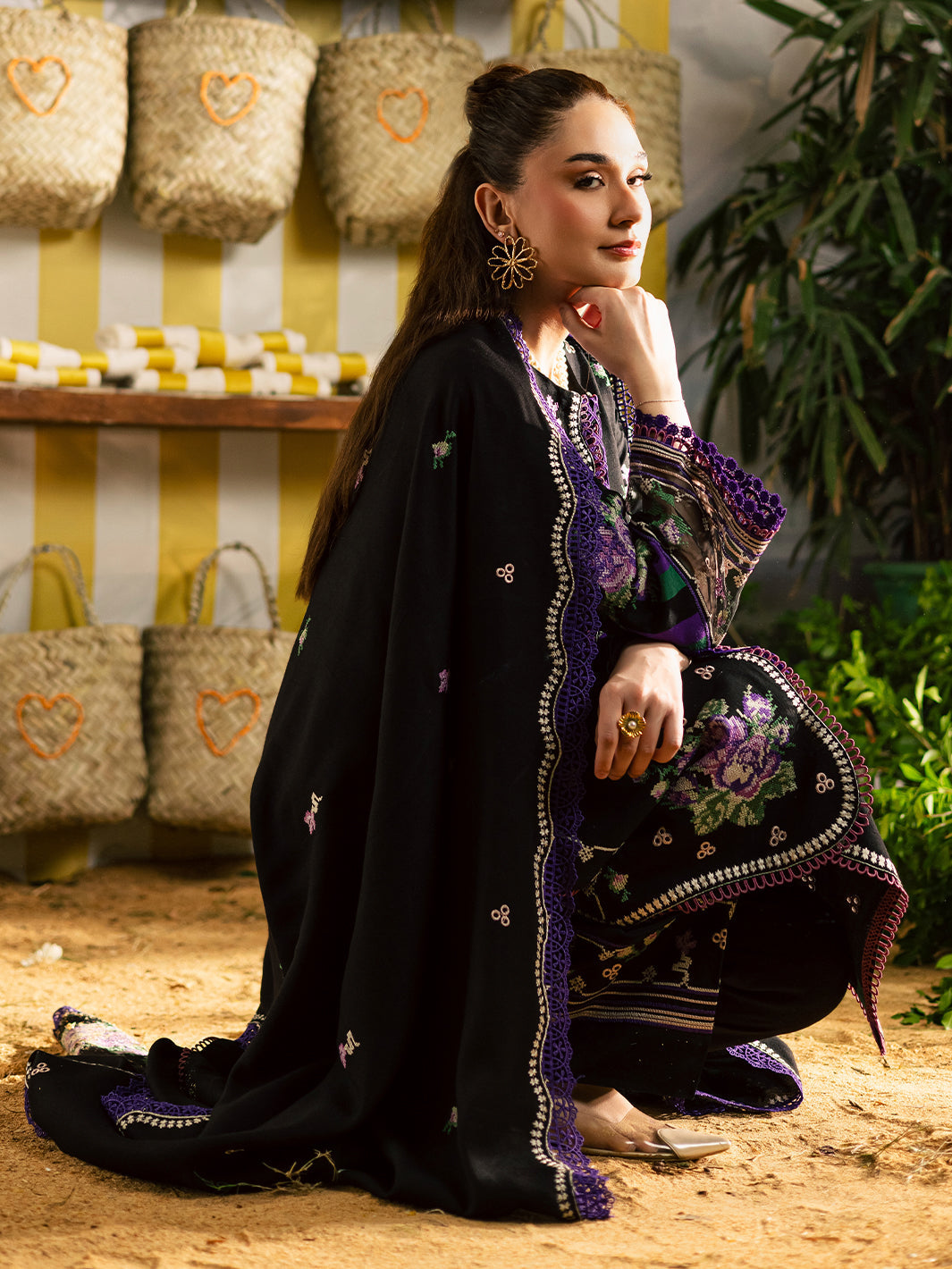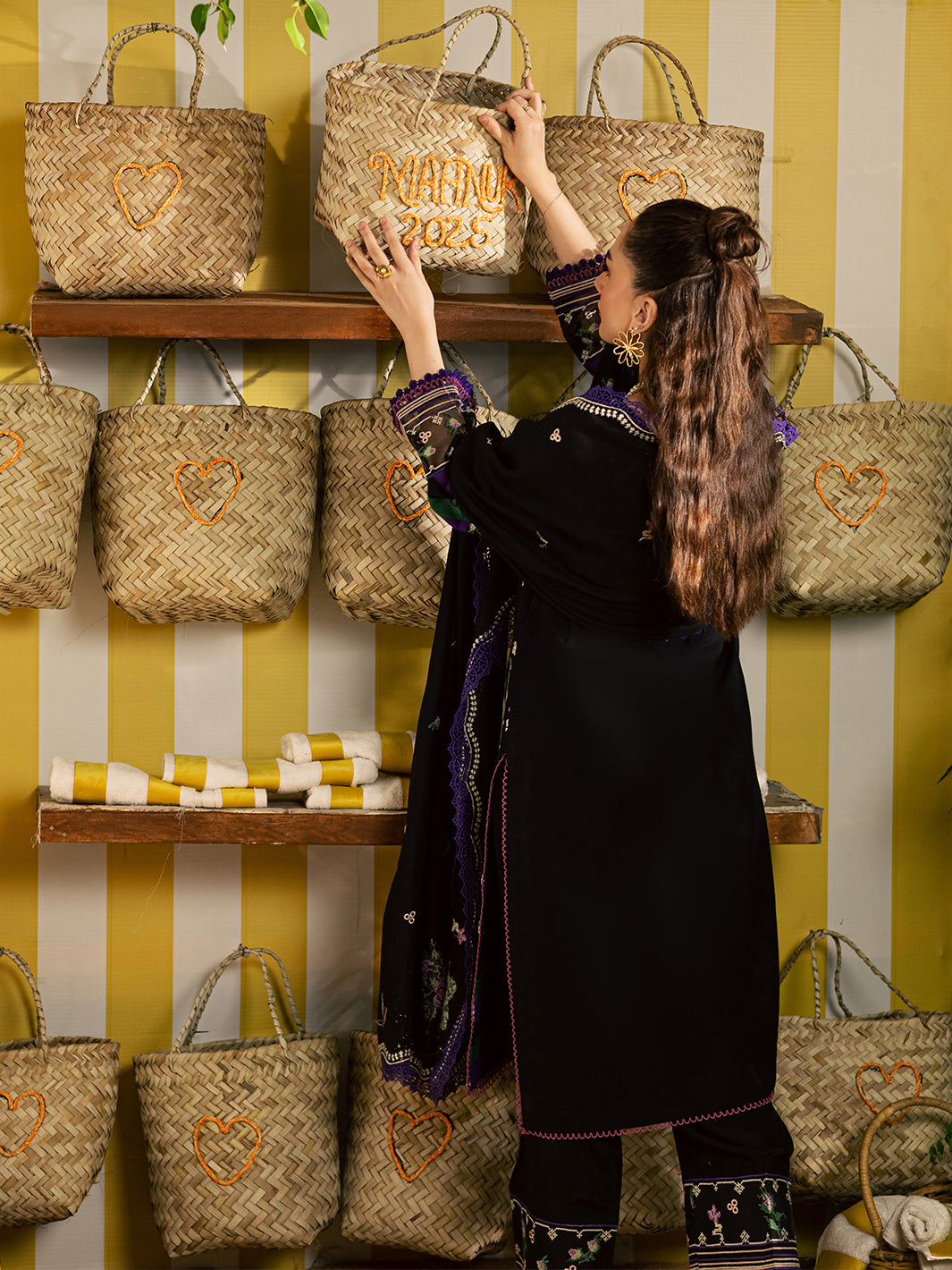 Summary: Embrace the elegance of this stunning black Pakistani suit from Mahnur's Fall/Winter collection. Crafted from premium slub linen, this unstitched dress offers a luxurious feel and graceful drape, making it perfect for cooler weather. The kameez stands out with its intricate and vibrant floral embroidery in rich shades of purple and green, artfully placed along the neckline and down the front. This sophisticated ethnic wear is an excellent choice for formal events and evening parties. This Pakistani dress combines traditional artistry with modern design, making it a must-have for your festive wardrobe. Ideal for formal dinners or wedding guest attire.
