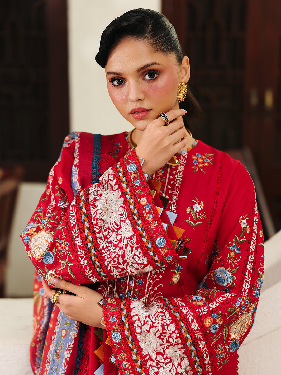 Summary: Embrace timeless elegance with this stunning red Pakistani suit from Bin Ilyas's Lumina Lawn collection. Crafted from breathable lawn fabric, this summer outfit is designed for both comfort and style. The kameez features exquisite embroidery across the front panel and flared sleeves, enhanced with delicate organza lace detailing. This vibrant red lawn dress is a perfect piece of ethnic wear, exuding grace and sophistication. An ideal choice for formal gatherings, Eid celebrations, or as a wedding guest outfit, this festive wear ensures you make a memorable statement.
