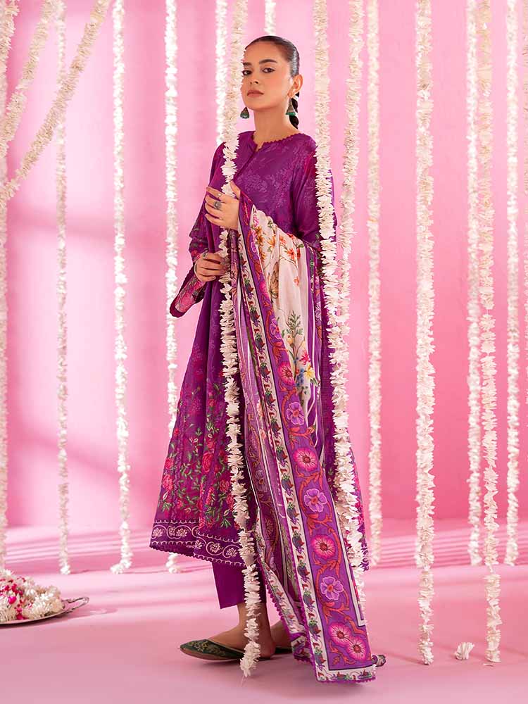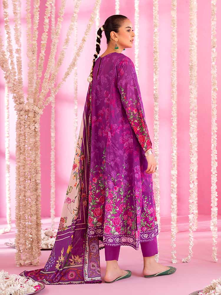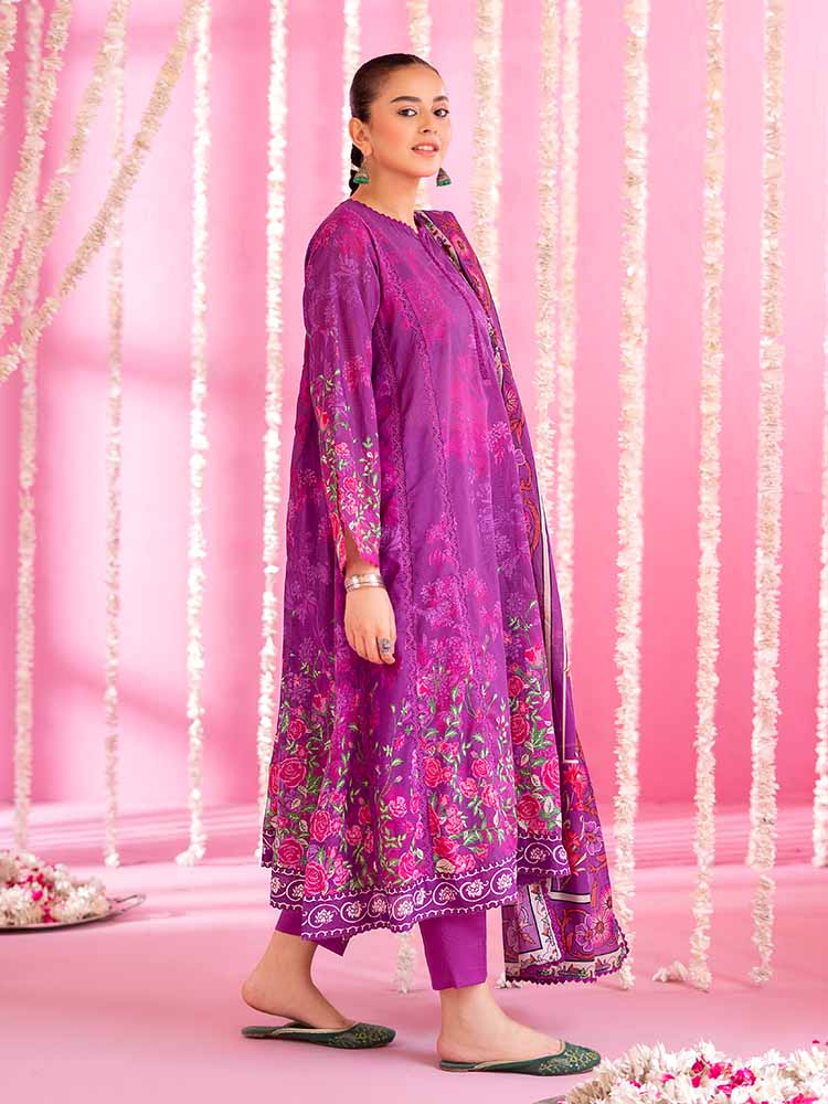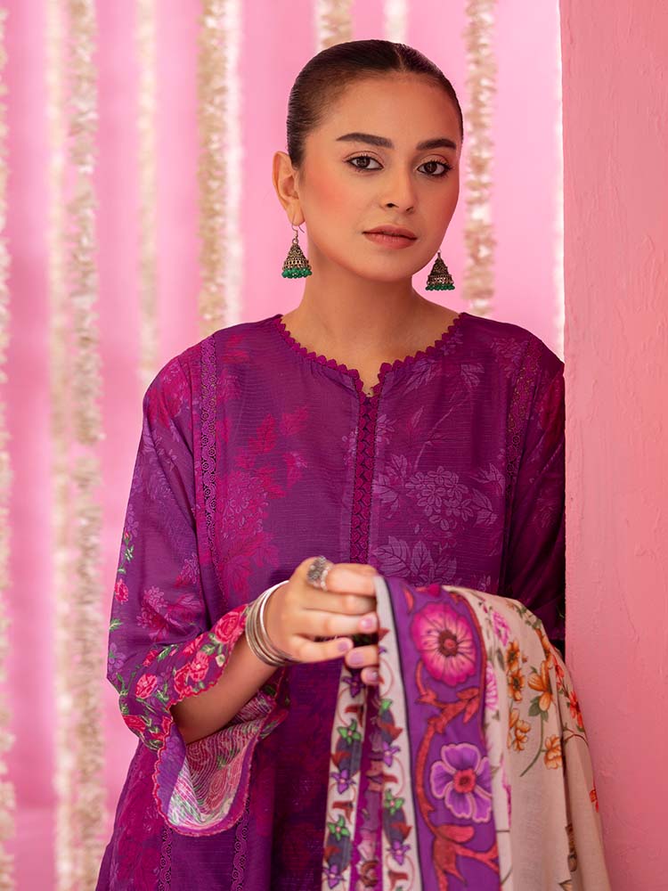 Summary: Embrace festive elegance with this stunning purple Pakistani Lawn suit from Binaas. The kameez is crafted from premium 'Lawn Bana Dora' fabric, renowned for its lightweight and breathable feel, making it a perfect summer outfit. It features a vibrant digital floral print in shades of pink and red against the rich purple base, designed with a classic long silhouette and elegant full sleeves. This unstitched Pakistani dress is ideal for festive occasions, summer weddings, or Eid celebrations. As a quintessential piece of ethnic wear, this festive clothing combines traditional grace with modern digital artistry, making it an ideal choice for any stylish affair.