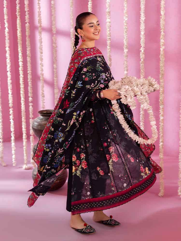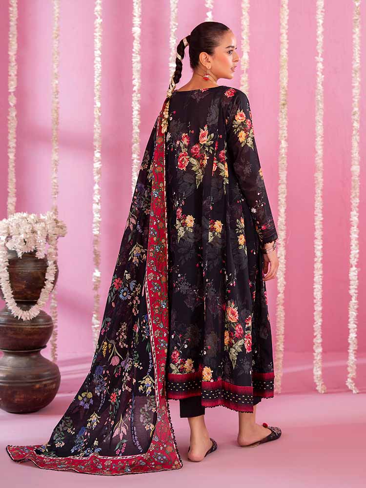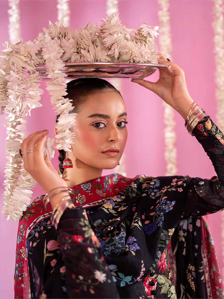 Summary: Embrace timeless elegance with this stunning black Pakistani suit from Binaas's Gulab Rang collection. The kameez is crafted from premium Digital Printed Lawn Bana Dora, a lightweight and breathable fabric perfect for the Spring/Summer season. This ethnic wear features a classic straight cut with a sophisticated digital floral print, making it a versatile choice for various occasions. The deep black base provides a dramatic canvas for the vibrant floral motifs. As a quintessential Pakistani Lawn Dress, it offers unparalleled comfort and style, ideal for festive gatherings, Eid celebrations, or elegant evening parties. A perfect addition to your festive wardrobe.