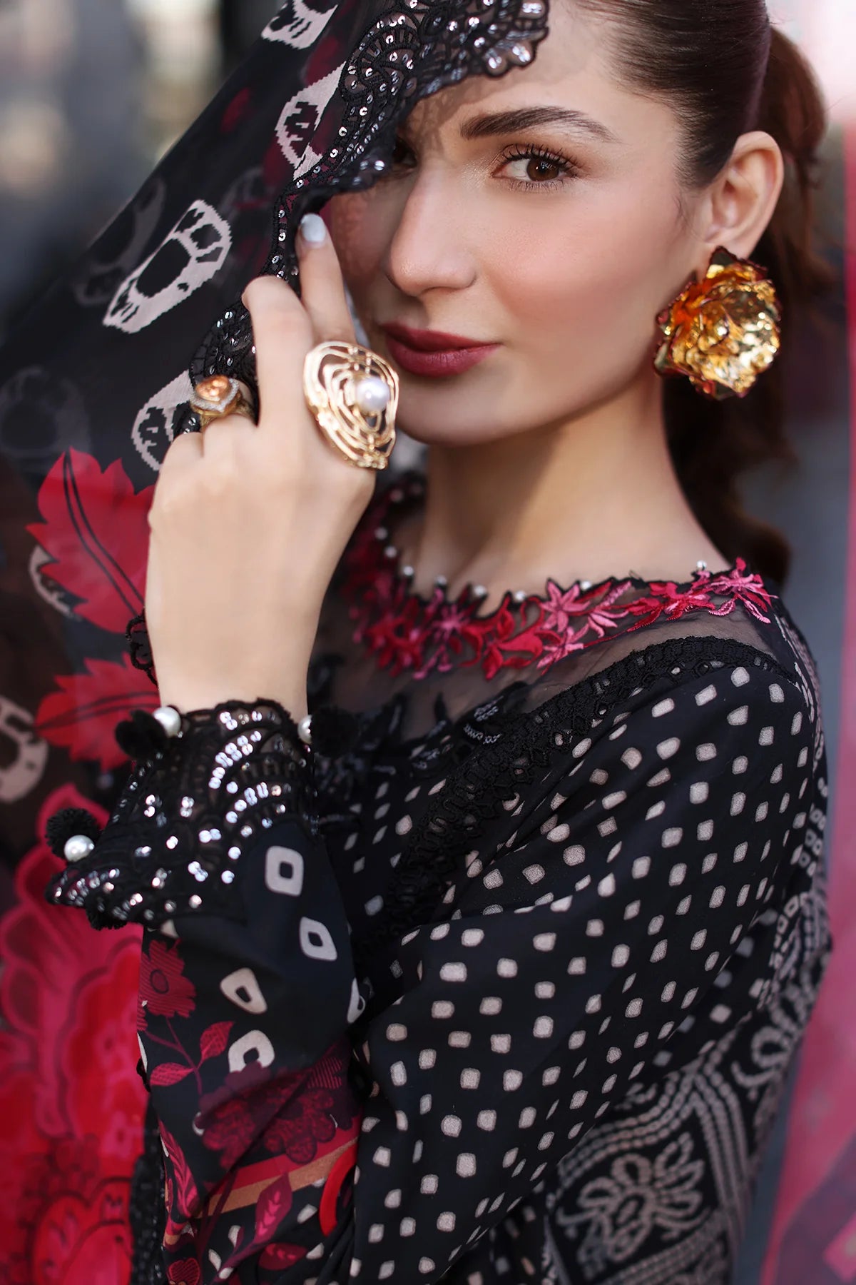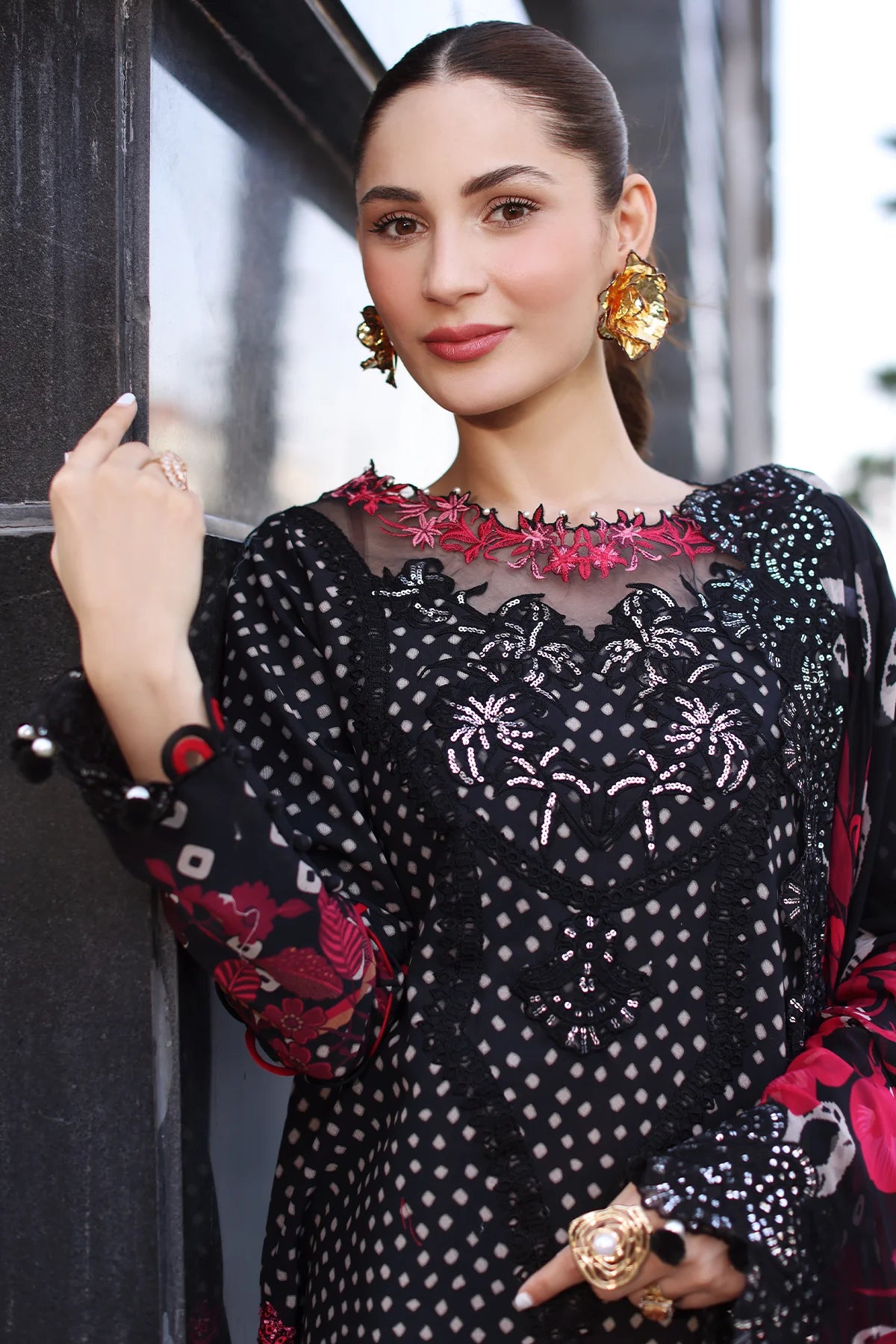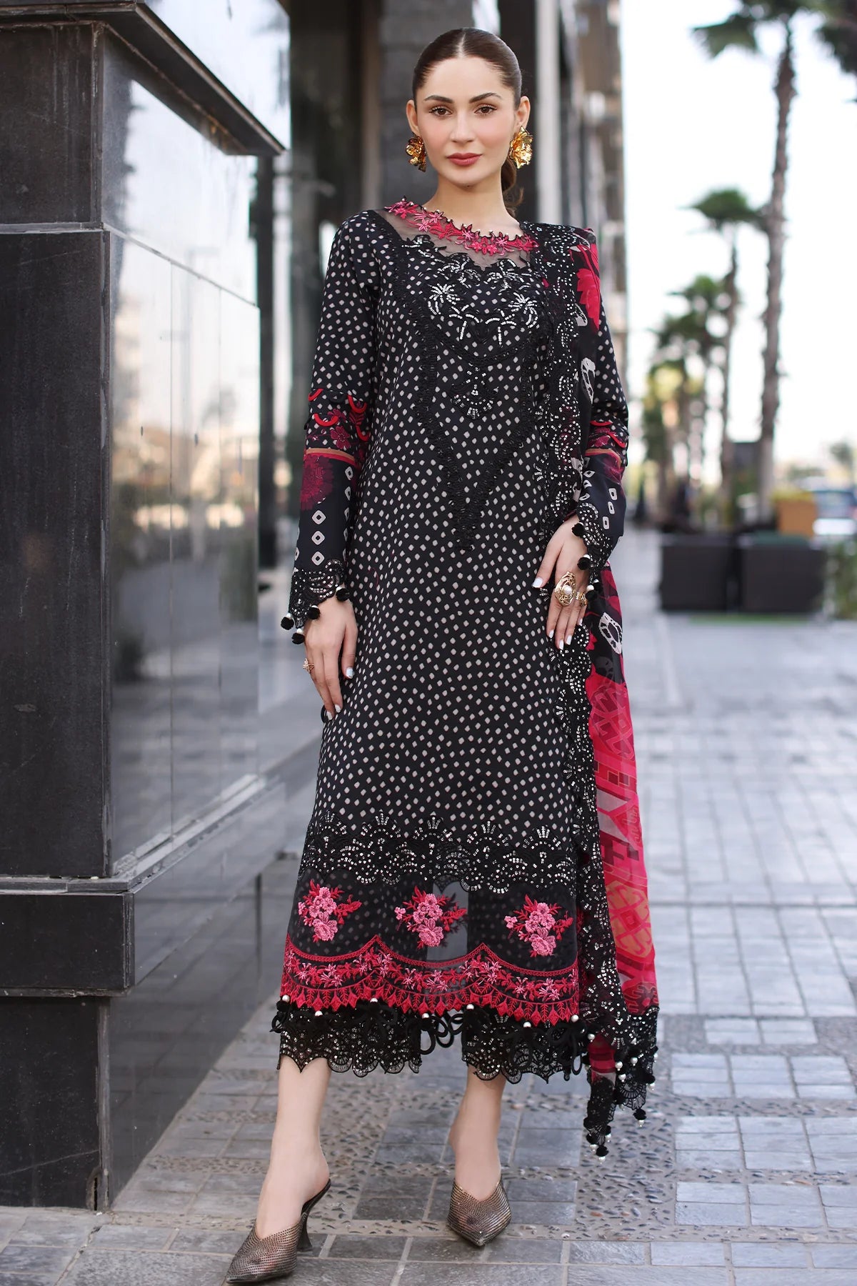Summary: Embrace timeless elegance with the Charizma Swissmiss Swiss Voile Lawn Suit in black (CSM5-01). This exquisite three-piece ensemble is crafted from high-quality Swiss voile, a lightweight and breathable fabric perfect for the spring/summer season. The shirt features an intricate embroidered printed design on the front, back, and sleeves, adding a touch of sophistication to your look. It also comes with an embroidered front neck, back daman patti, sleeves and back motifs, chok and trouser patti. Complementing the shirt is a dyed cotton trouser and a beautifully embroidered printed chiffon dupatta, offering a graceful drape and a pop of color. This unstitched suit allows you to customize the fit and style to your preference. This sophisticated design makes it an ideal choice for parties and special occasions. Experience the perfect blend of comfort, style, and craftsmanship with Charizma. Buy this stunning Pakistani suit today and elevate your wardrobe.