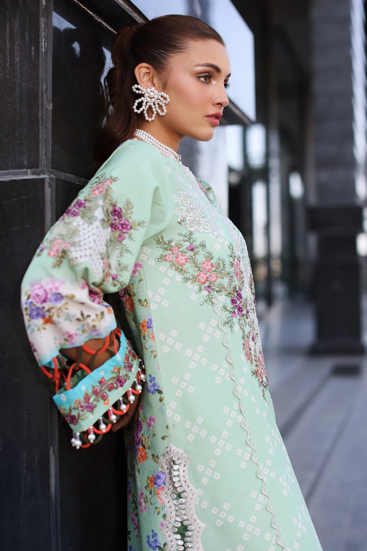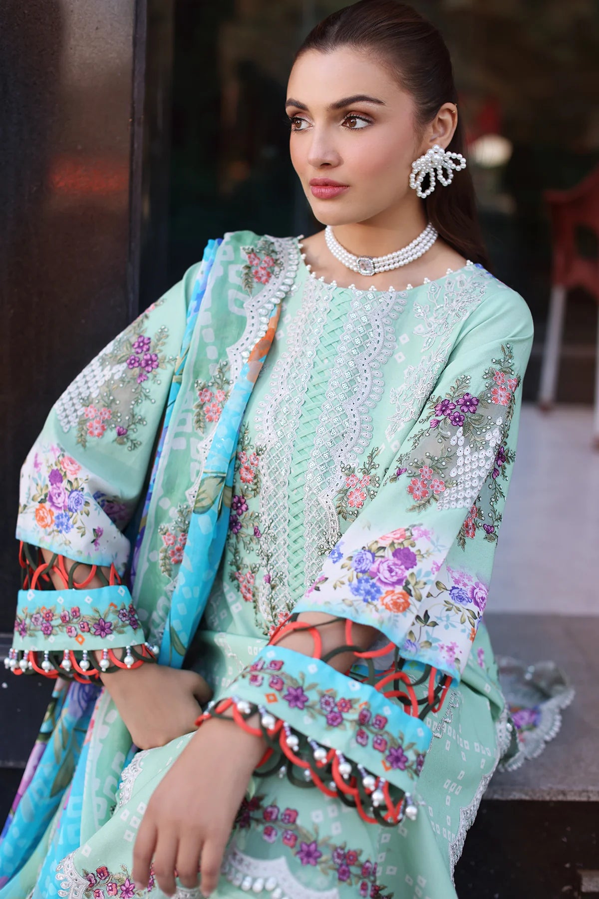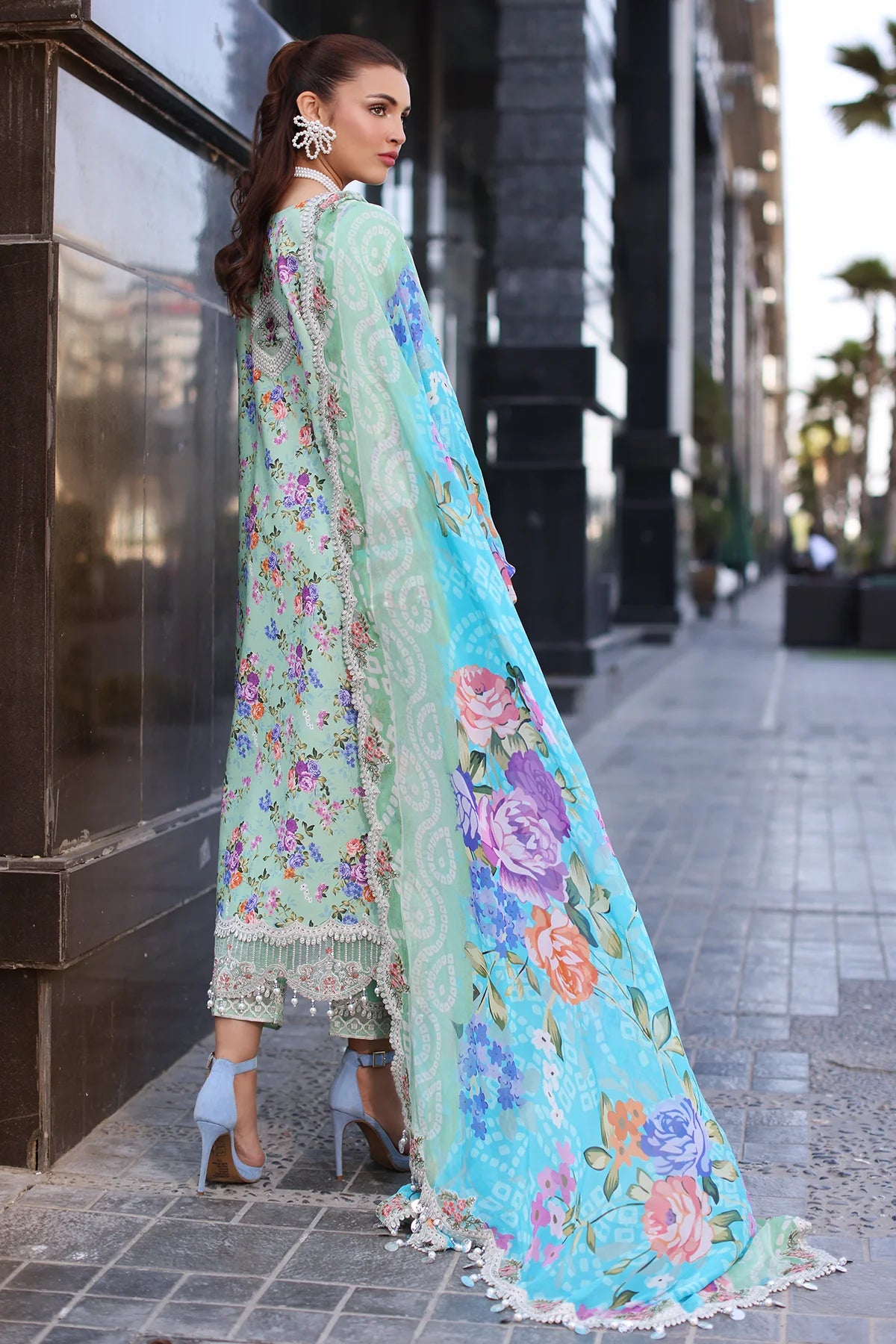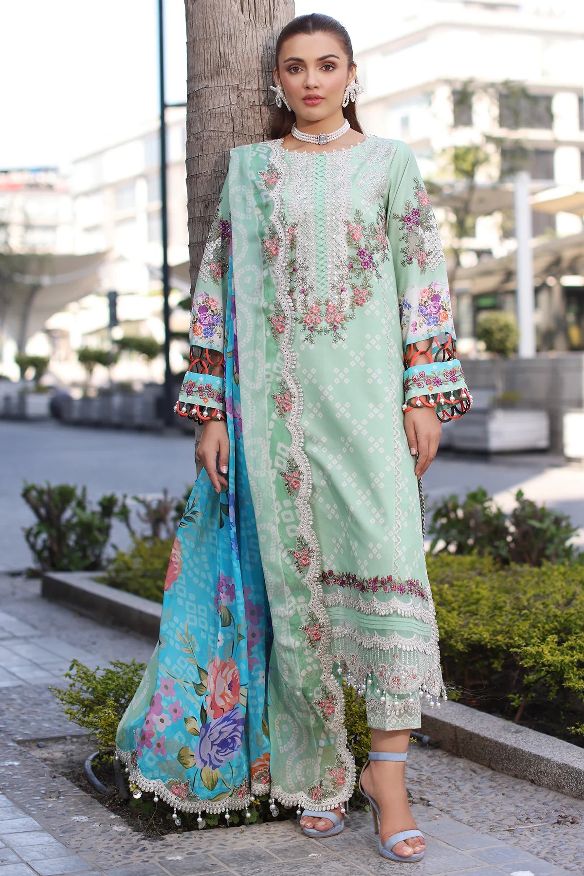 Summary: The Charizma Swissmiss Swiss Voil Lawn suit in a refreshing sea green hue is a perfect blend of comfort and style. This unstitched three-piece ensemble offers endless possibilities for creating a personalized look. Crafted from high-quality Swiss voile, the shirt fabric drapes beautifully and promises a comfortable feel, making it ideal for everyday wear. The shirt fabric comes with 1.25 meters for the front and back, 26 inches for the sleeves, and additional embroidered pieces for the neckline, back, sleeves, and trouser embellishments. The accompanying chiffon dupatta adds a touch of elegance with its lightweight, flowy texture and vibrant printed design measuring 2.50 meters. The dupatta also features delicate embroidered borders. The dyed cotton trouser fabric provides a comfortable and breathable base for the outfit, completing the ensemble. With 2.5 meters of dyed cotton fabric for trousers, you have ample material for tailoring. This Pakistani suit is perfect for casual gatherings and daytime events where you want to make a statement with your style. Create a look that reflects your personality by pairing this unstitched marvel with your choice of embellishments and stitching style.