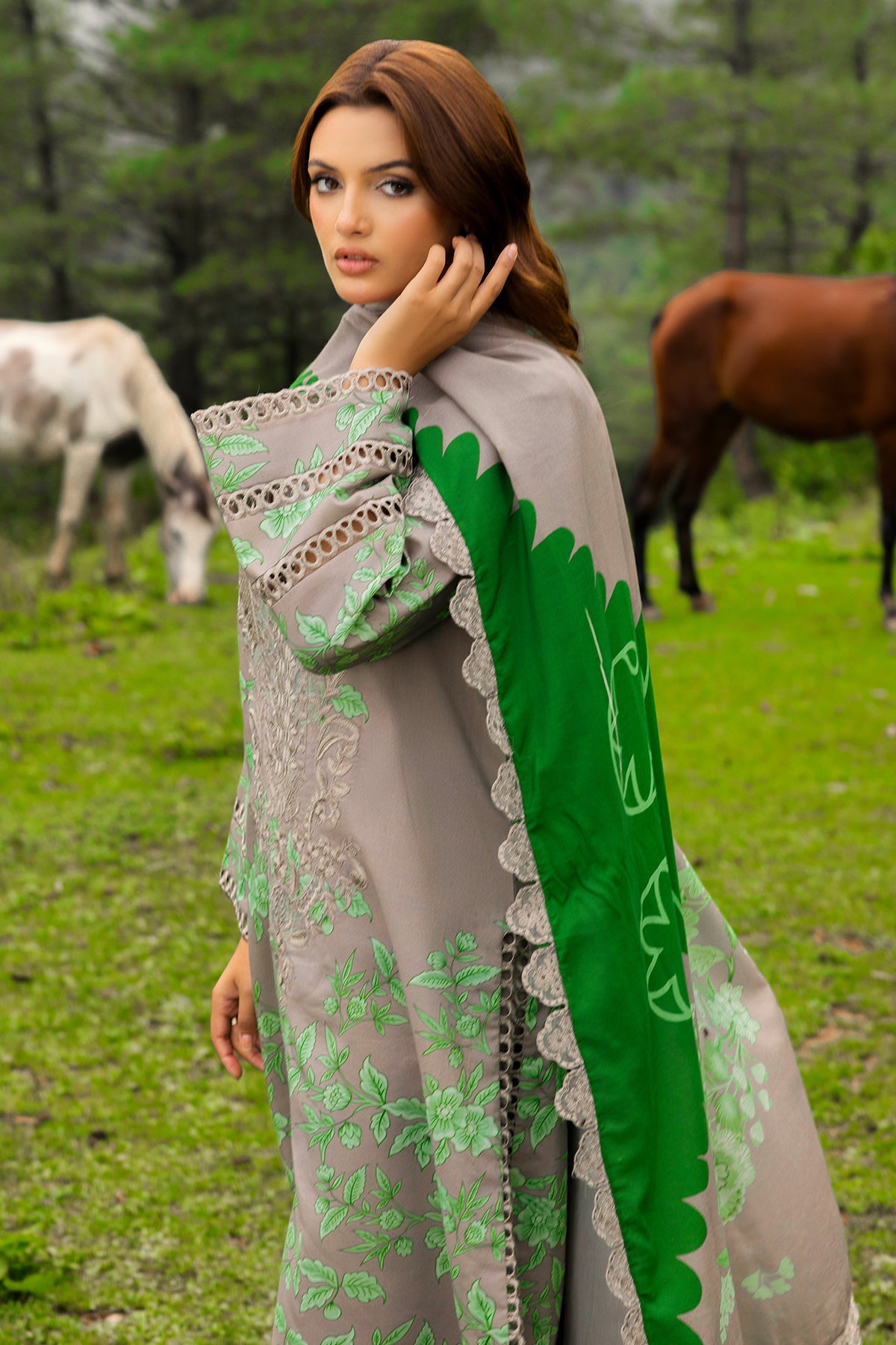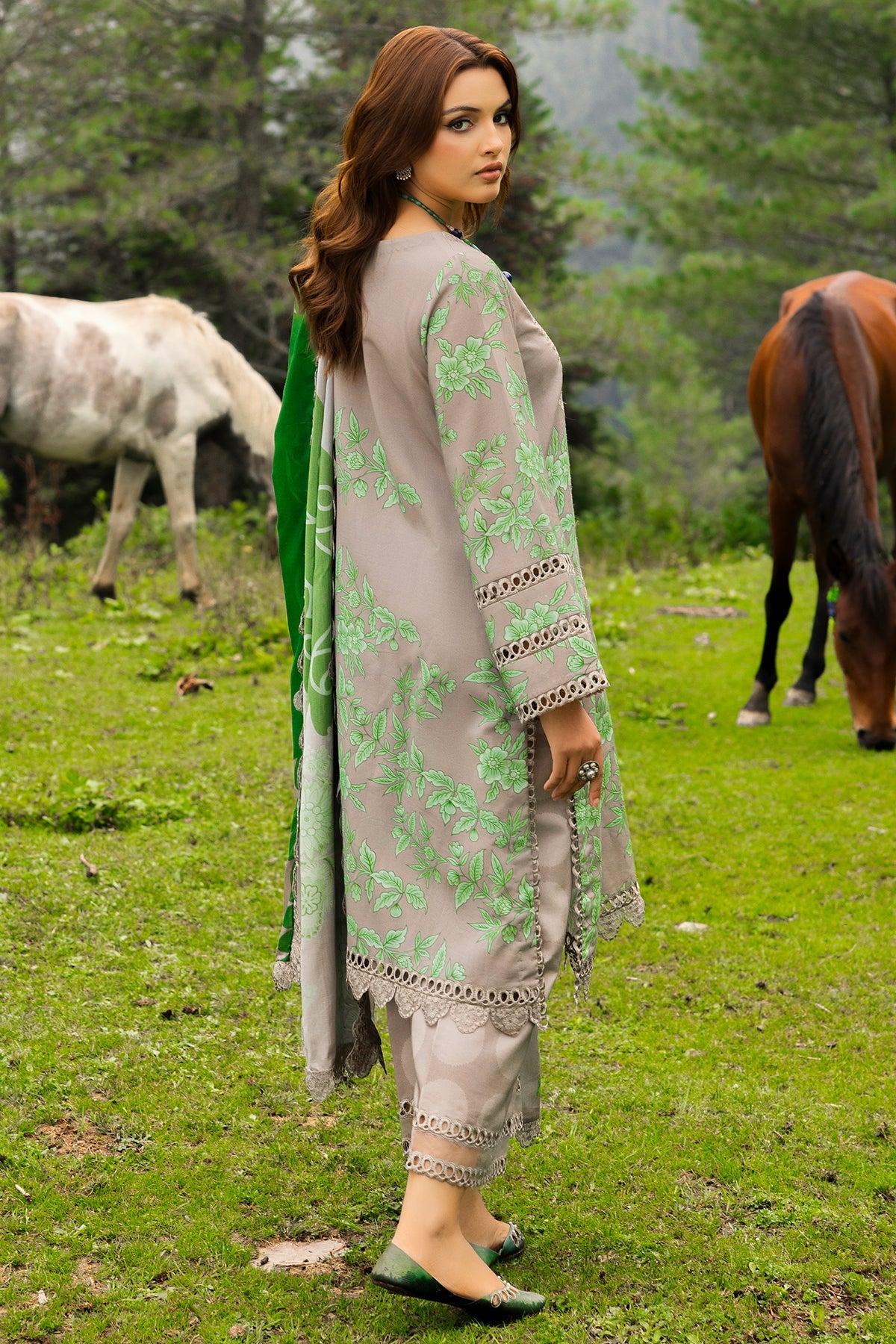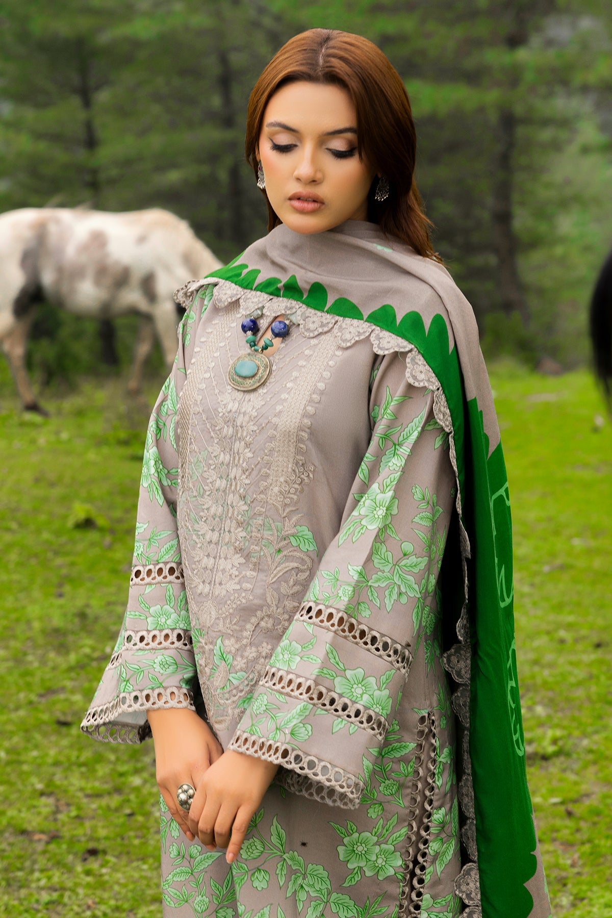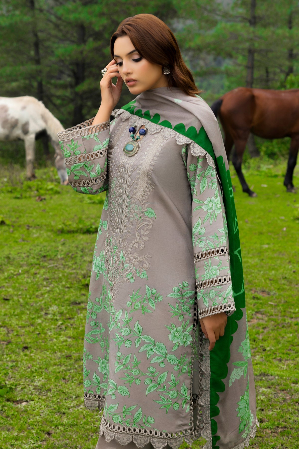 Fabric: Embroidered Printed Staple Front 1.25MTR Printed Staple Back+Sleeves 2MTR Embroidered Front +Back Daman Patti 1.5MTR Embroidered Sleeves +Side Slit+Trouser Patti 8MTR Printed Staple Trouser 2.5MTR Embroidered Shawl Pallu Patti 2.25MTR Embroidered Printed Staple Shawl 2.5MTR |