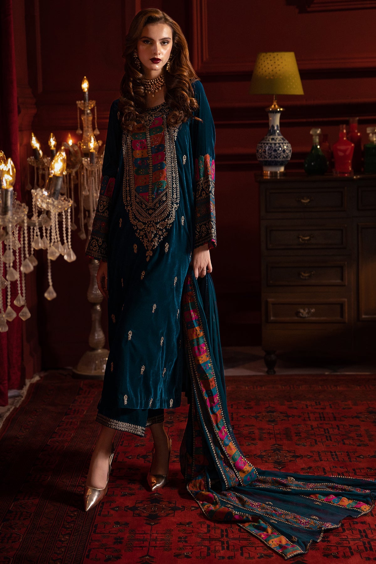 Fabric: Embroidery Dyed Velvet Front 1.25 MTR Embroidery Dyed Velvet Sleeves 26 inch Dyed Velvet Back 1.25 MTR Embroidery Trouser Patti 1.25 MTR Dyed Velvet Trouser 2.50 MTR Embroidery Dupatta Pallu Patti 2.50 MTR Embroidery Dyed Chiffon Dupatta 2.50 MTR Printed Dupatta Patti 13 MTR |