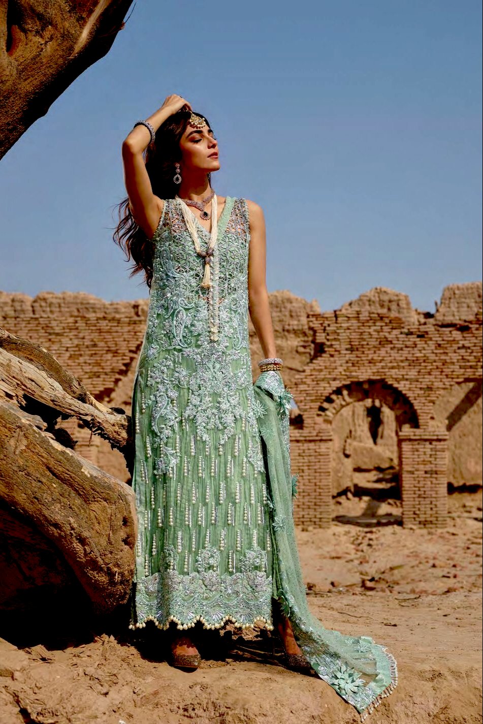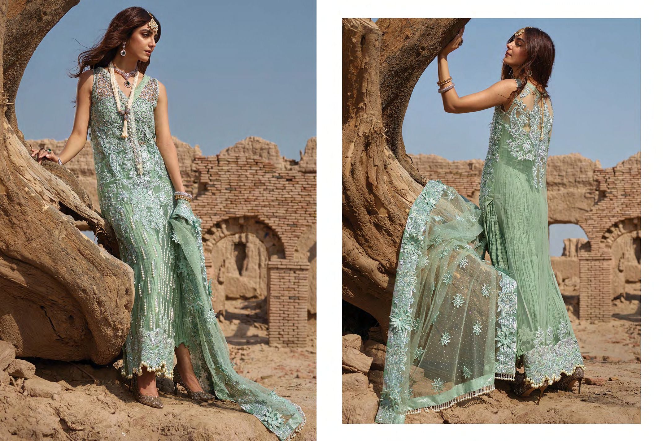 Fabric: 1. 0.67 meters Embroidered and Sequined Front on Net 2. 0.67 meters Embroidered and Sequined Back on Net 3. 1.6 meters Embroidered and Sequined Sleeve Border on Net 4. 0.33 meters Solid Dyed Net 5. Cutwork Sequined Neckline 6. 1 meter Hand Worked Pearl and Sequins Spray 7. 1 3D Embellished Ada Patti 8. 2.5 meters Crystal Encrusted Net Dupatta with 3D Flower Spray and Border 9. 2.5 meters Solid Dyed Cotton Silk Lining 10. 2.5 meters Solid Dyed Rawsilk Pant |