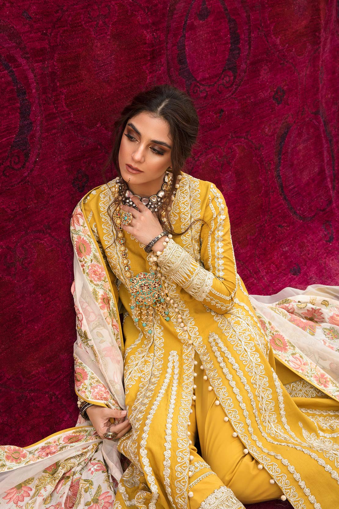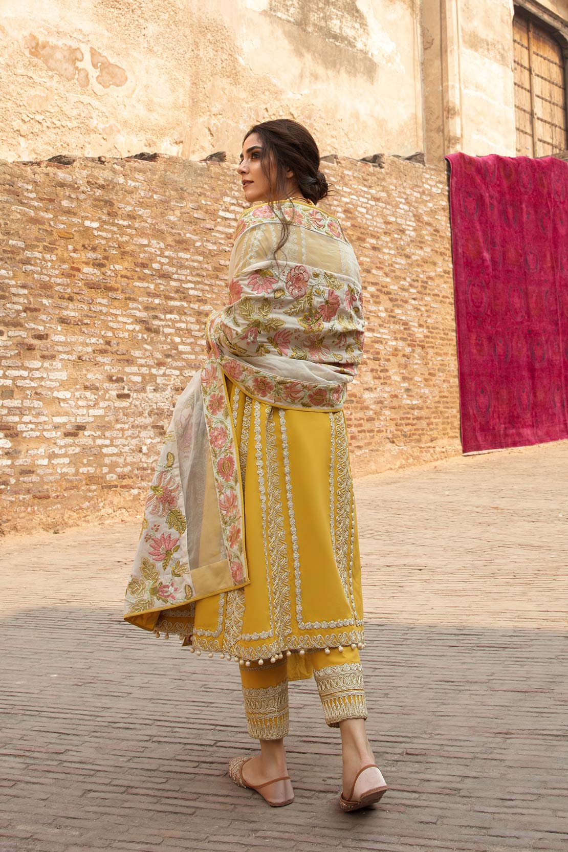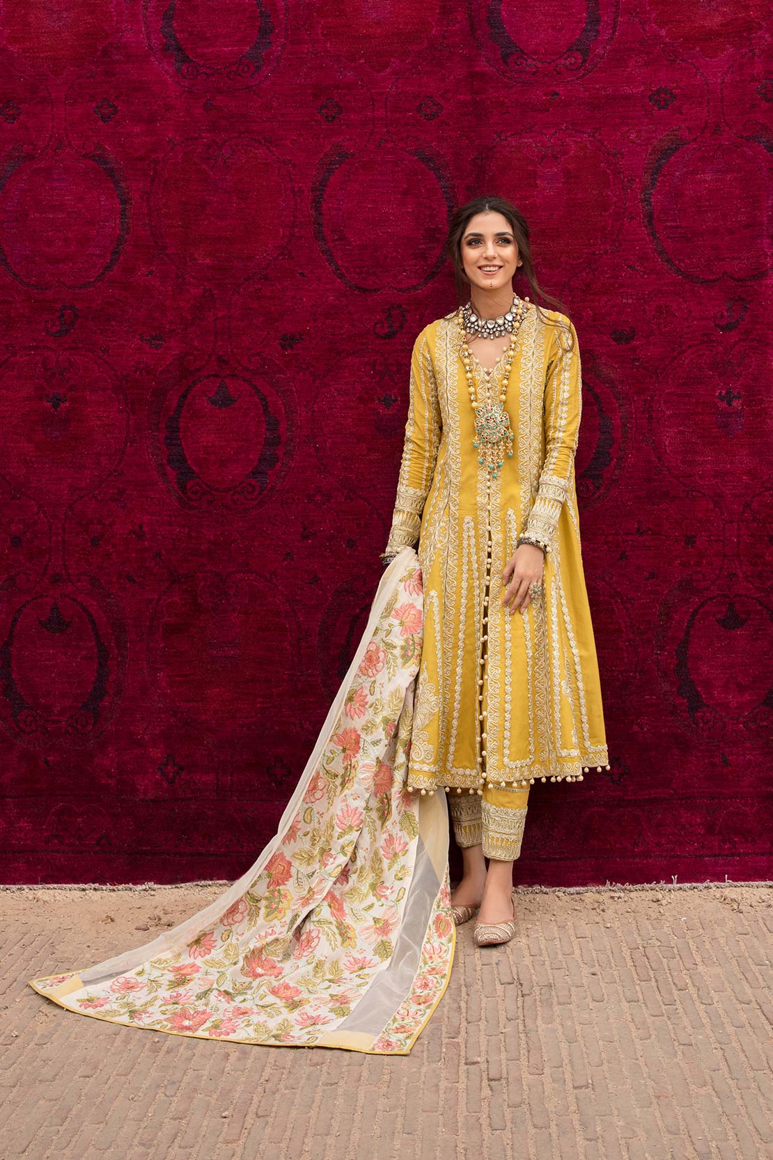 Fabric: 2 Marori Embroidered Center Panels on Khaddar 2 Marori Embroidered Side Panels on Khaddar 2 Marori Embroidered Godet on Khaddar 0.65 meters Marori Embroidered Sleeves on Khaddar 1.1 meter Marori Embroidered Back on Khaddar 0.70 meters Patti for Back Daman 1.1 meters Marori Embroidered Pant Border 2.5 meters Embroidered Wool Shawl with Border 2.5 meters Solid Dyed Cambric Pant |