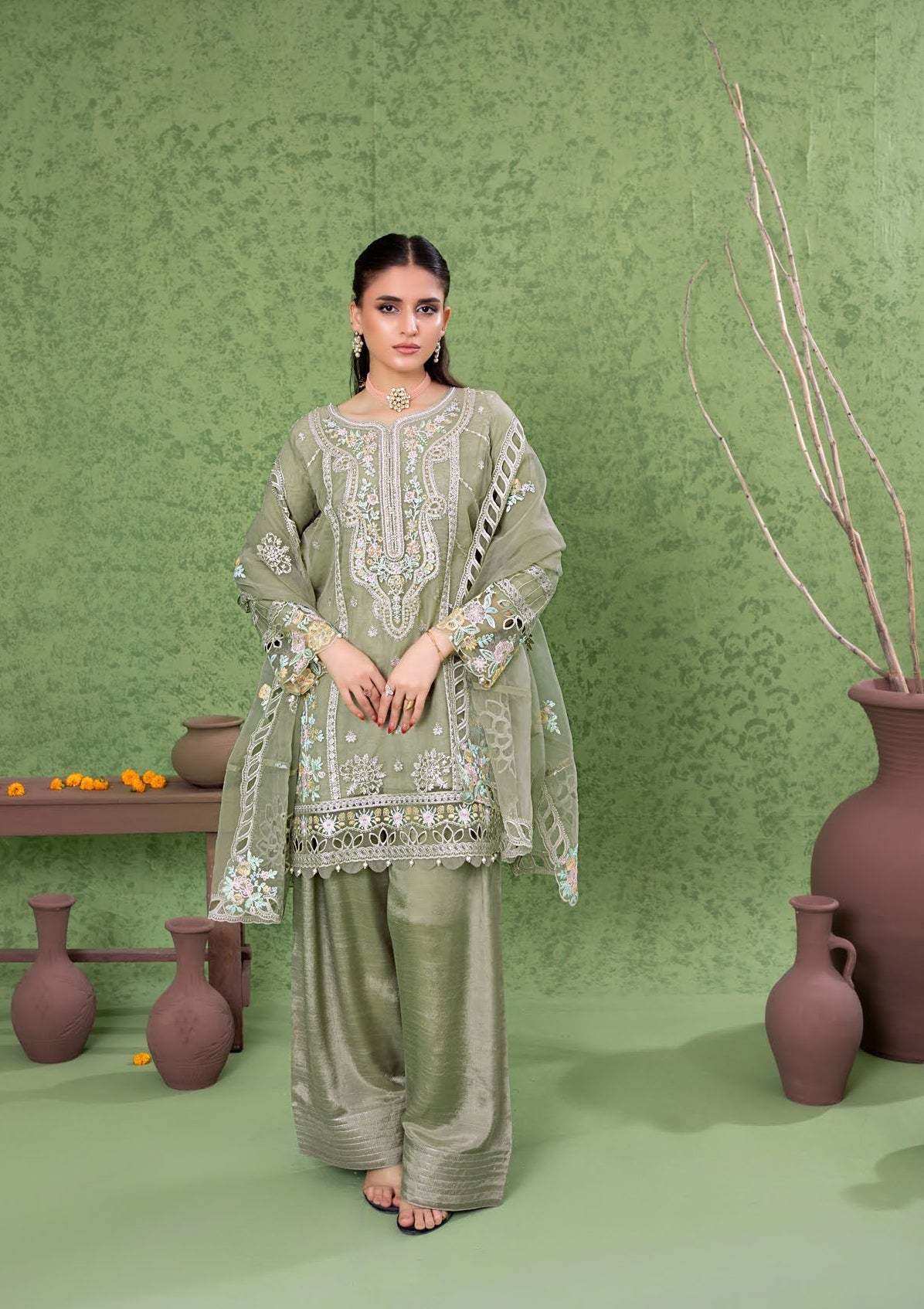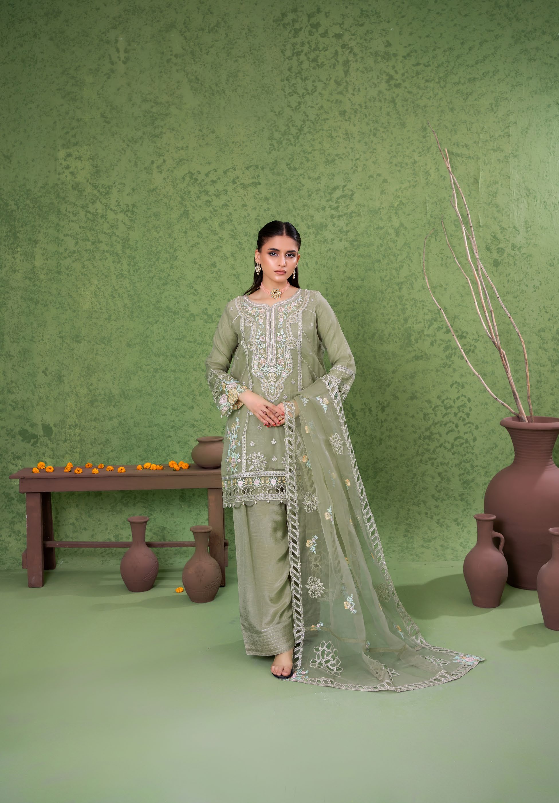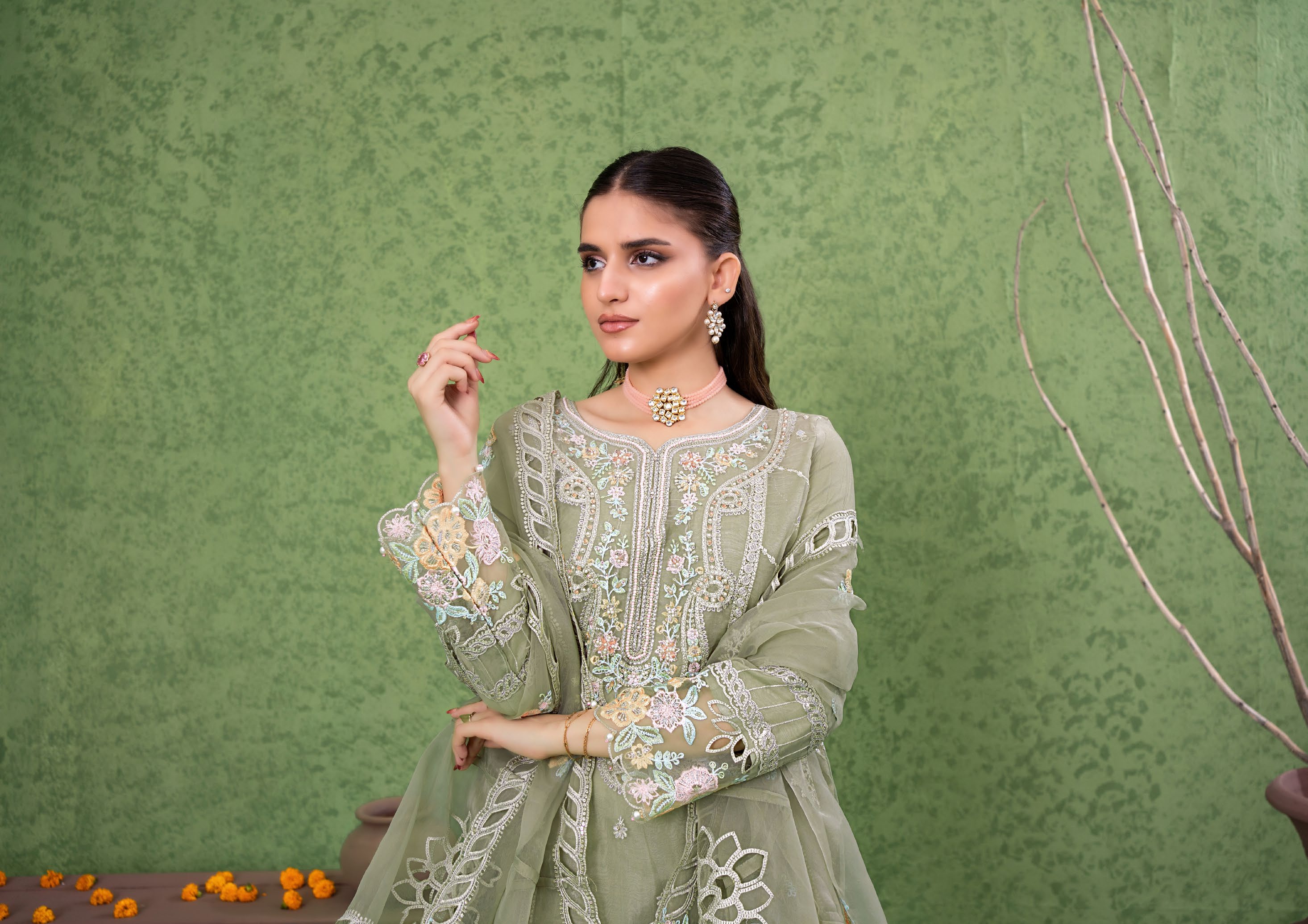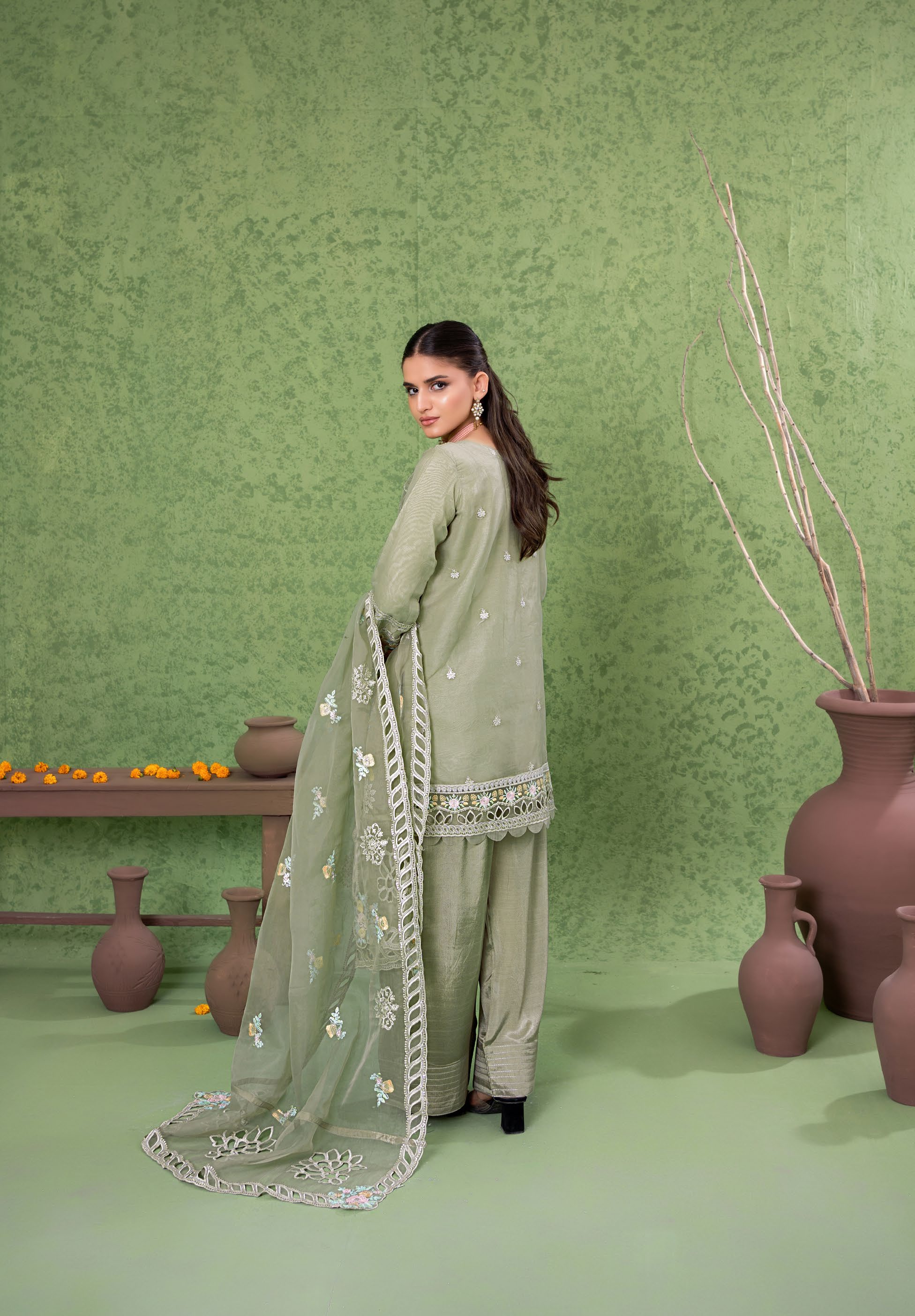 Summary: Discover the epitome of elegance with this green organza Pakistani suit, perfectly tailored for summer festive wear. This ready-to-wear 3-piece ethnic wear ensemble features a beautifully embroidered short-length kameez, beautifully paired with a traditional farshi shalwar. The breathable, sheer organza fabric makes it an ideal Pakistani summer dress for warm-weather celebrations. Highlighted by its refreshing green shade, this outfit is a highly sought-after choice for Mehndi ceremonies and formal gatherings. Buy this exquisite Pakistani dress online to upgrade your formal wear collection, offering a flawless look for Eid festivities or attending wedding events.