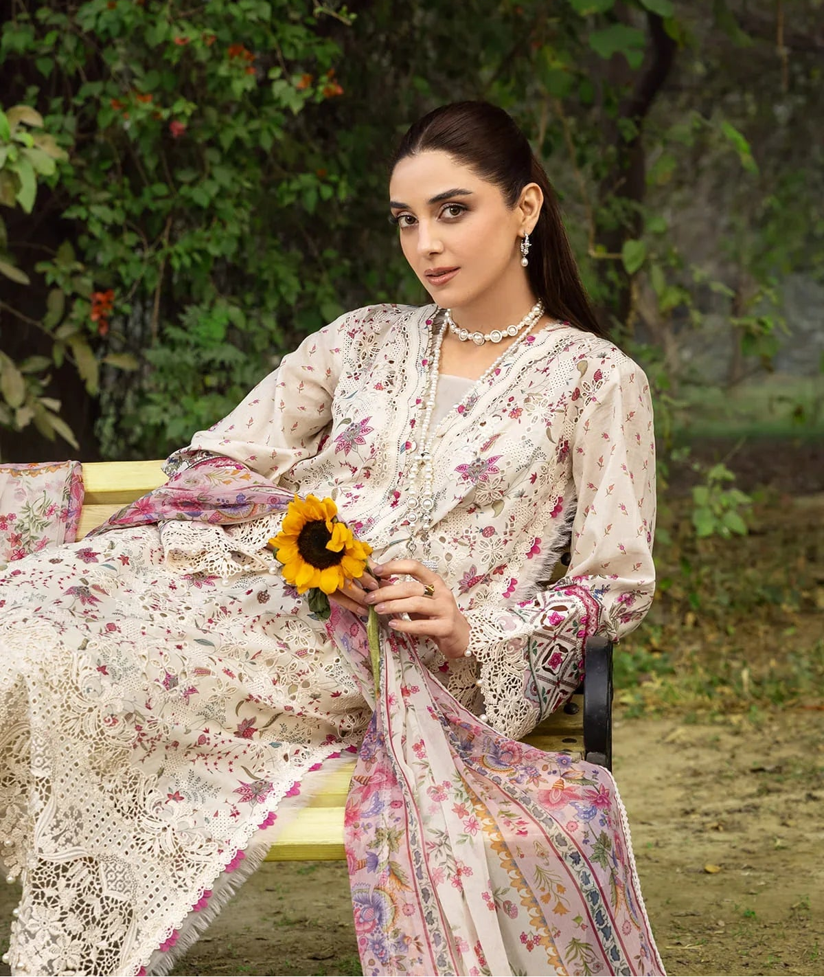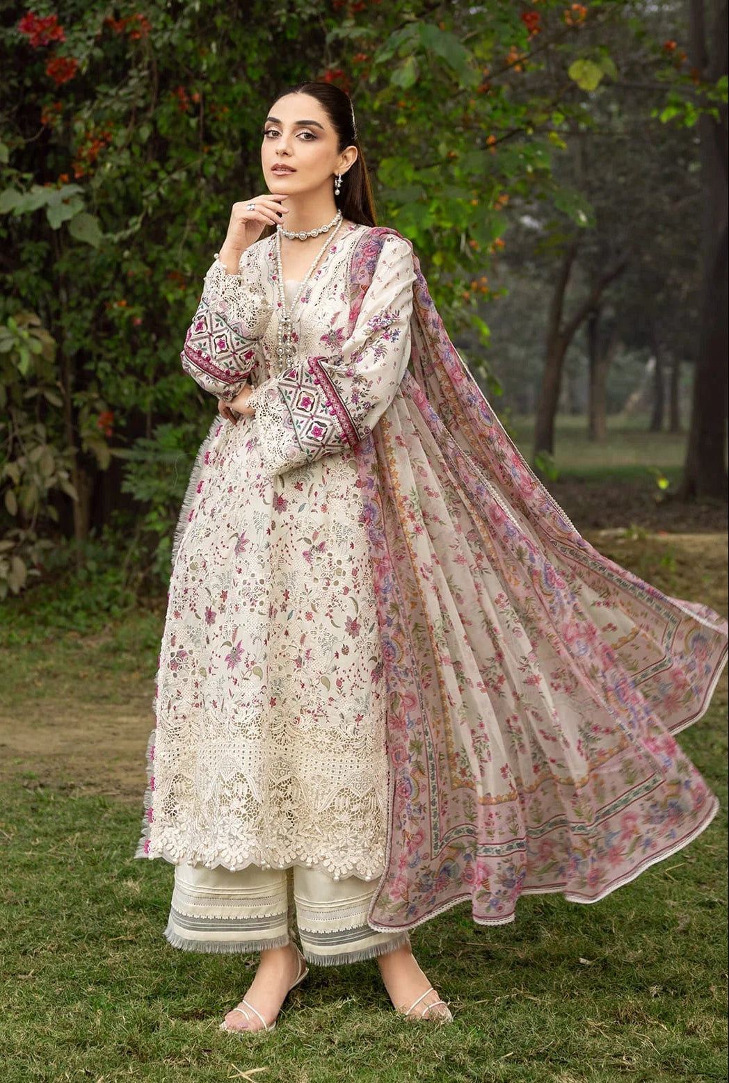 Summary: Embrace timeless elegance with this off-white Pakistani lawn suit from Elaf's 'MEHR' collection. The kameez, crafted from breathable lawn fabric, is perfect for the Spring/Summer season. It features a delicate digital floral print with exquisite Chikankari work on the front, complemented by intricately embroidered organza borders on the hemline and sleeves. This unstitched ethnic wear offers a sophisticated look, making it a versatile choice for daytime events and festive gatherings. A quintessential Pakistani summer dress, it provides both comfort and style, making it an ideal outfit for Eid or any special formal occasion.