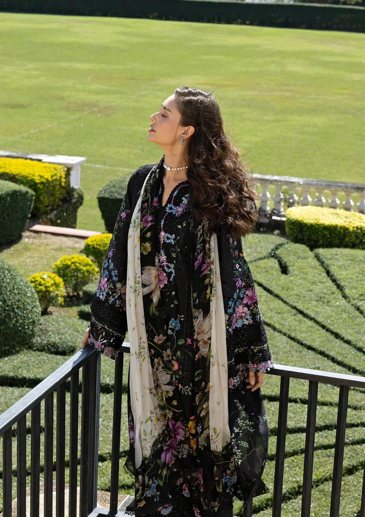 Summary: Embrace timeless elegance with the Elaf 'Black Throne' Pakistani Suit. This exquisite piece features a deep black lawn kameez, serving as a dramatic canvas for vibrant digital floral prints. Crafted from light and breathable lawn fabric, it's a perfect choice for Spring/Summer comfort. The design is elevated with intricate organza embroidery on the neckline and daman, adding a touch of formal grace. As a standout piece of ethnic wear, this Pakistani lawn dress is ideal for evening functions, festive parties, or sophisticated daytime events, offering a blend of modern style and classic charm.