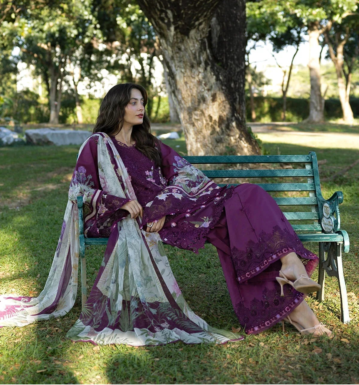 Summary: Embrace elegance with the Elaf Signature 'Darling Plum' Pakistani Suit. Crafted from premium lawn, this unstitched ethnic wear is perfect for the Spring/Summer season, offering breathable comfort. The kameez features a rich digital print on a deep plum base, beautifully enhanced with intricate embroidered organza details on the neckline, front panels, and sleeves. Paired with a flowing printed chiffon dupatta, this sophisticated summer outfit is a prime example of Pakistani formal wear. Ideal for Eid, festive gatherings, or any special occasion, this dress offers a blend of tradition and contemporary style.