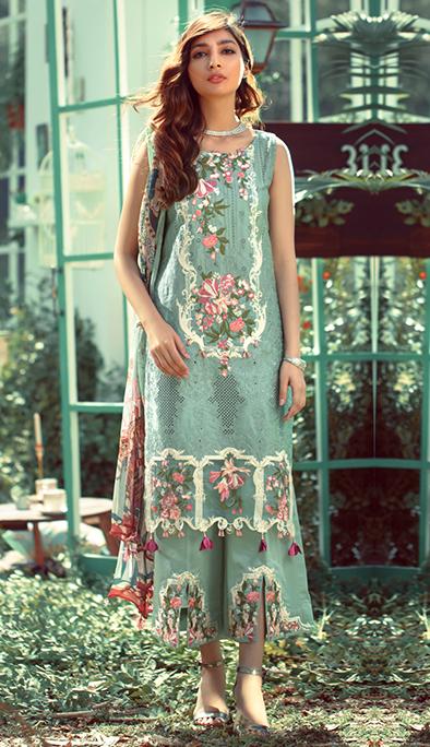 Fabric: Schiffli Embroidered Lawn Front 0.86 Mtr Schiffli Embroidered Lawn Back 0.86 Mtr Schiffli Embroidered Lawn Sleeves 0.53 Mtr Dyed Cotton Trouser 2.5 Mtr Pure Chiffon Digital Printed Dupatta 2.5 Mtr Embroidered Neckline on Organza Embroidered Ghera Border on Organza 0.86 Mtr 4 Embroidered Trouser Patches on Organza |