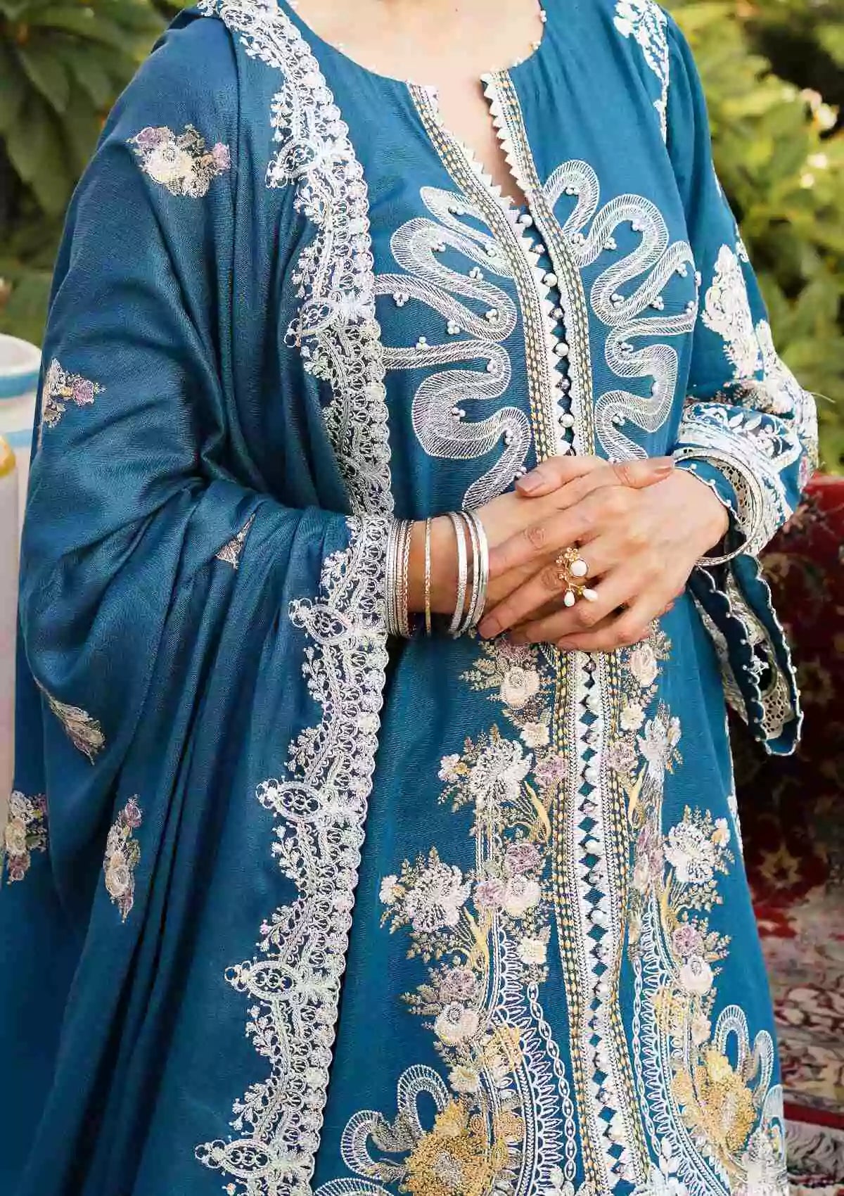Summary: Wrap yourself in luxury with the Elaf Luxury Winter Collection EKW-07 - FALAK, a stunning teal Pakistani suit designed for the discerning woman. This unstitched three-piece suit features a rich, teal-colored khaddar shirt, promising both warmth and style for the winter season. The front of the shirt showcases intricate embroidery, adding a touch of traditional charm, while the back is a solid dyed soft khaddar, providing a clean and elegant canvas. The accompanying sleeves also feature exquisite embroidery work, further elevating the overall design. Adding a touch of shimmer and grace, the outfit includes an embroidered viscose shawl. This beautiful shawl drapes effortlessly, complementing the teal khaddar shirt perfectly. Completing the ensemble is a pair of solid dyed khaddar trousers, providing both comfort and a polished look. This Elaf suit is perfect for party wear, making you the center of attention with its intricate details and rich teal hue. The unstitched nature of the suit allows you to tailor it to your exact measurements and preferred style, ensuring a perfect fit and allowing for personalized expression. The product comes with detailed measurements for each component: Embroidered Soft Khaddar Front (1 piece), Solid Dyed Soft Khaddar Back (1.25 meters), Embroidered Khaddar Sleeves (1 pair), Embroidered Organza Front Side Border (2.25 meters), Embroidered Organza Front & Back Daman Border (1.60 meters), Embroidered Organza Sleeves Border (1 meter), Embroidered Organza Shawl Pallu Border (1.90 meters x 3 pieces), Embroidered Viscose Shawl (2.25 meters), and Solid Dyed Khaddar Trouser (2.5 meters). Please note that the actual product color may slightly vary due to screen differences.