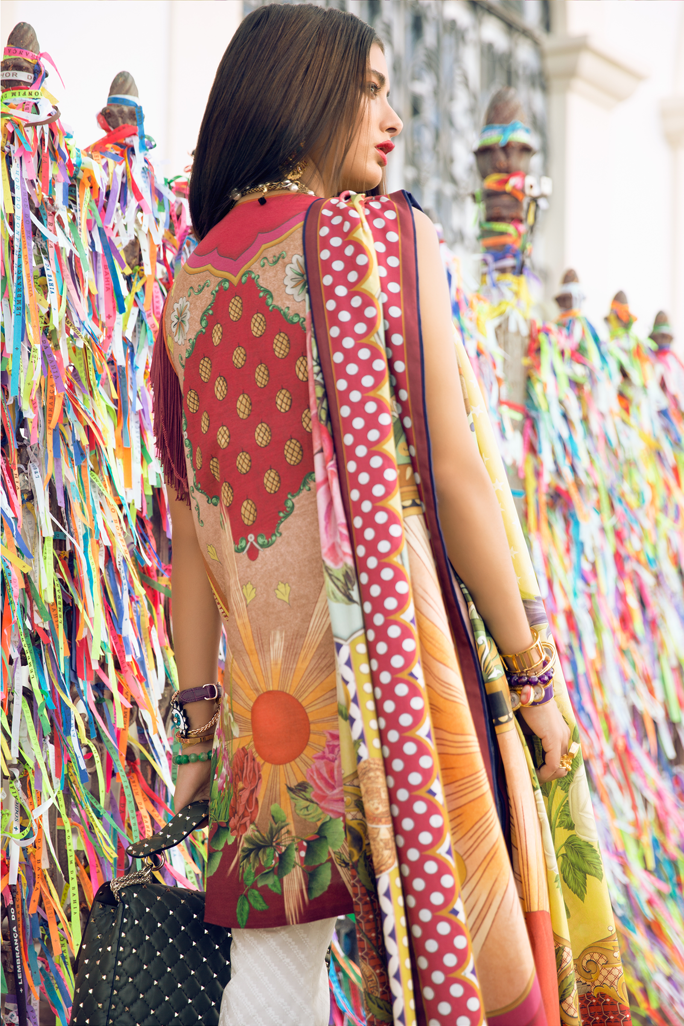 Fabric: Printed Dupatta (Pure Silk) 2.50 Meters embroidered Shirt Front (Pima Lawn) 1.30 Meters printed Shirt Back (Pima Lawn) 1.30 Meters embroidered Sleeves (Pima Lawn) 0.65 Meters printed Trouser (Pima Cotton) 2.50 Meters |