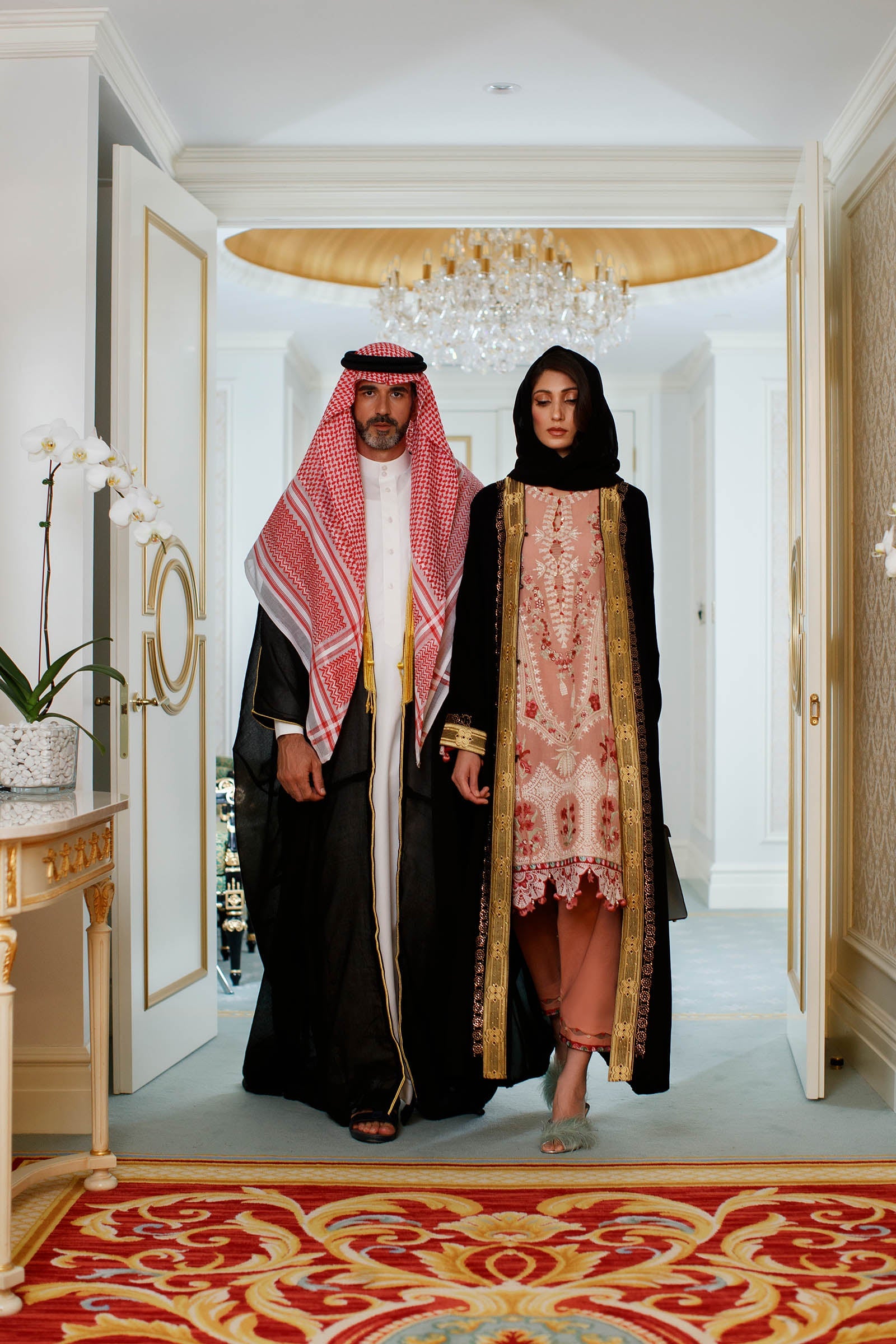 An incandescent, richly embroidered design ‘Lara’ features delicate yet elaborate embroideries in shades of watermelon, rosewood, Bordeaux, ivory and moss laid on the soft, salmon canvas. The shirt is accompanied by sumptuous satin borders with eyelet embroideries creating an exuberance of luxury. Paired with a diaphanous, fully embroidered organza dupatta, this mesmerising design is nothing short of being a show stopper.