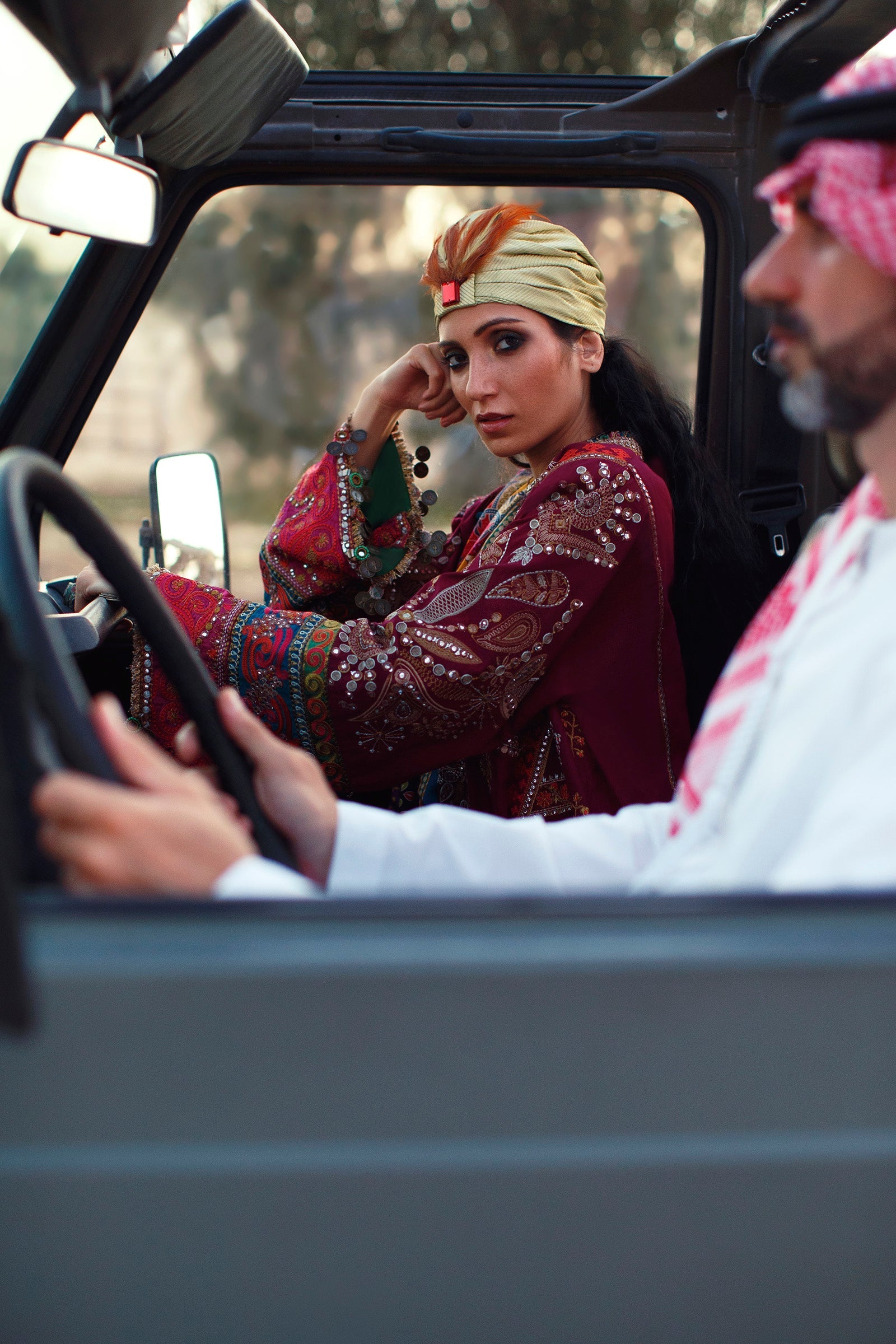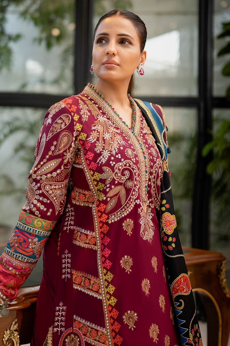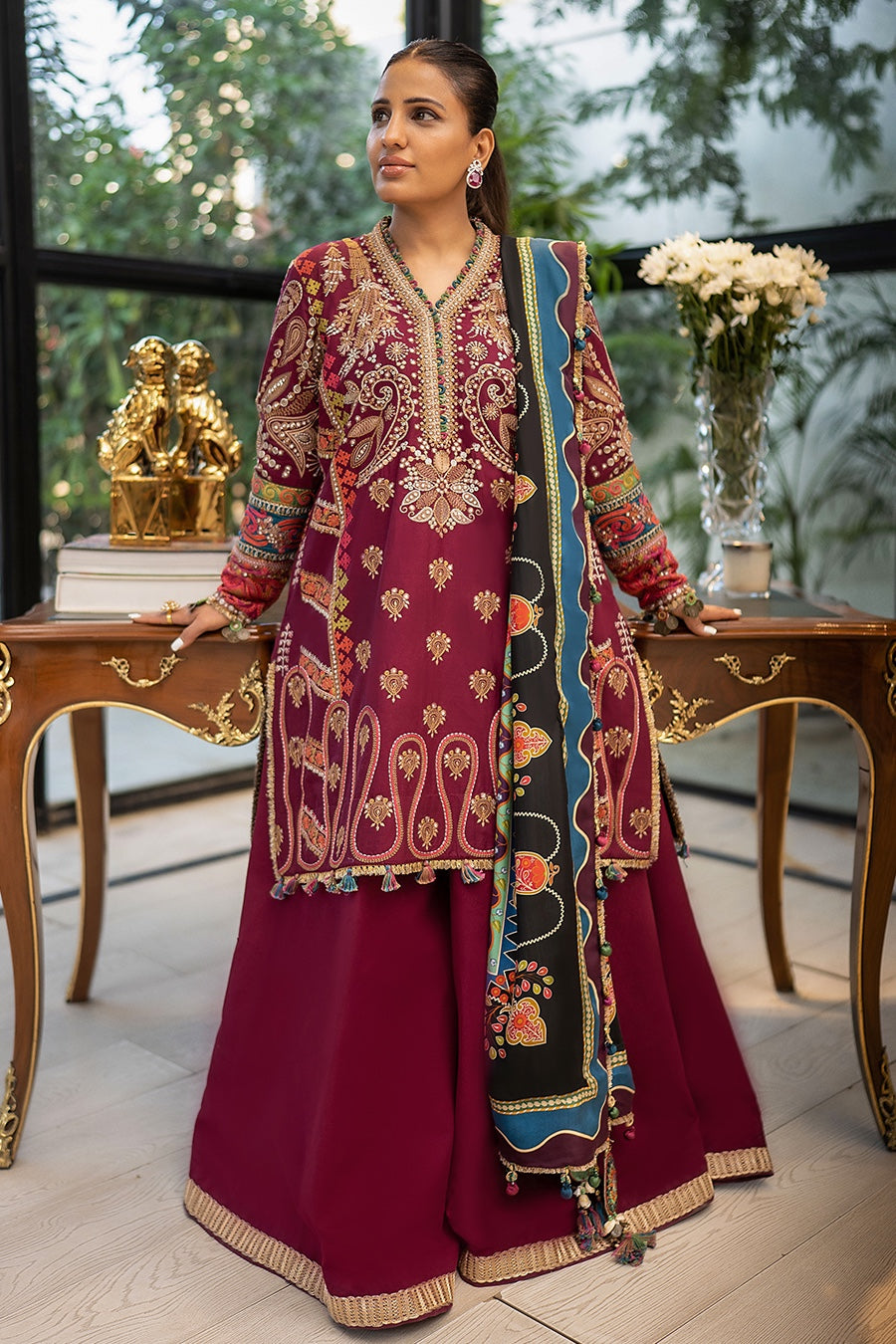 A deep cherry canvas; ‘Mahrosh' is set off with tribal elements laid in alluring hues of oat gold and silver tinsel with bright tinges of cerulean, carmine and lime. Inspired by the captivating Bedouin culture the design comes with an array of borders layered with a range of embellishments from multi-hued threadwork to delicate mirrors sewn together in shimmering cascade. Paired with a sumptuous pure silk dupatta blooming with an impressive folk art tapestry, this stunning look is infinitely chic and impactful.