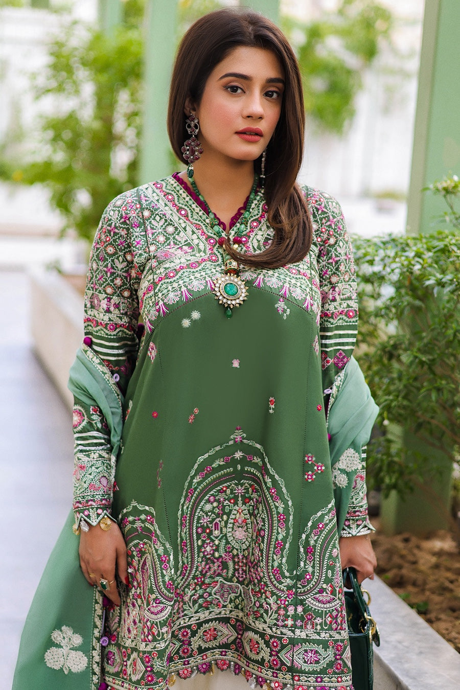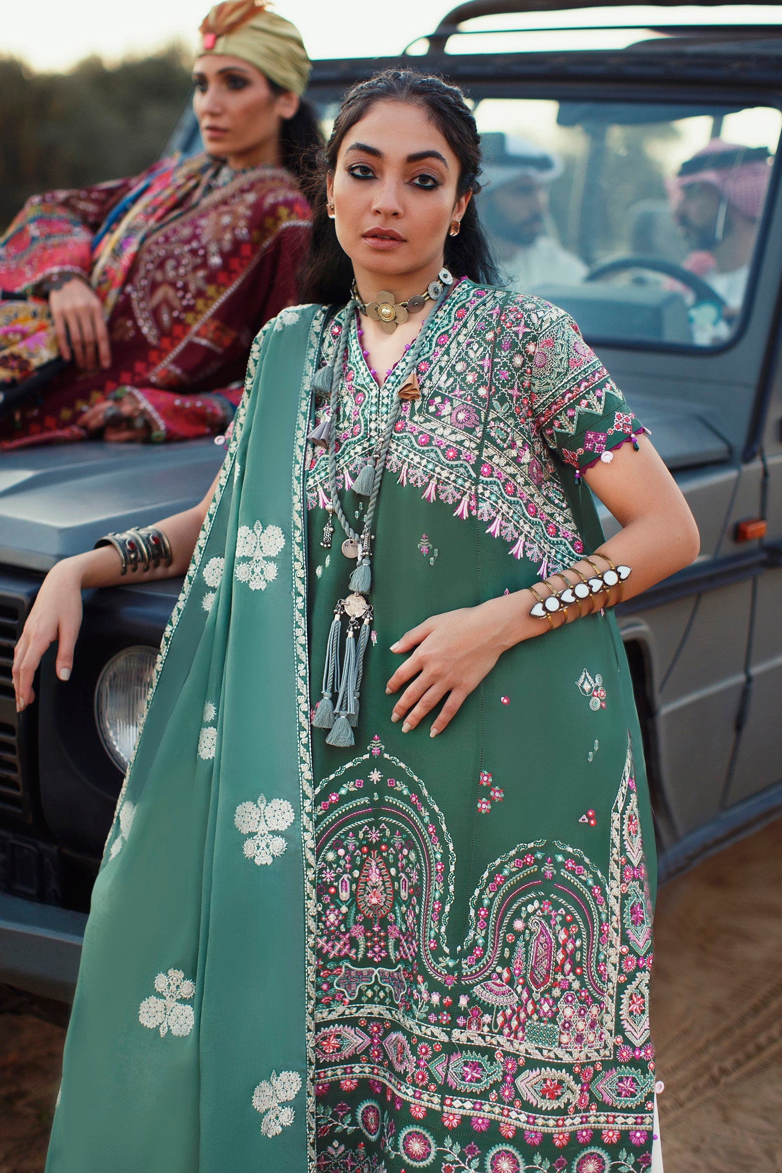 Fabric: A placid beguiling sage hued lawn is adorned with minutely detailed taankas in shades of cream, periwinkle, mauve and cranberry. Beautifuly sewn with mirrors that glisten to create a festive composition; Zeina is Inspired by rich Bedouin tradition and is paired with a heritage dupatta artistically sewn stitch by stitch with indigenous tribal elements. The nuanced and culturally rich design is a timeless classic, that shall make its grand debut this Eid. Embroidered Front Center Panel (Lawn) 1 Piece Embroidered Front Left Panel (Lawn) 1 Piece Embroidered Front Right Panel (Lawn) 1 Piece Dyed Back (Lawn) 1 Piece Embroidered Sleeves Left+ Right (Lawn) 1 Pair Embroidered Dupatta (Voile) 2.5 Meters Embroidered Dupatta Patti (Satin) 5.25 Meters Embroidered Dupatta Pallu Patti (Satin) 2.25 Meters Dyed Trouser (Cambric) 2.5 Meters |