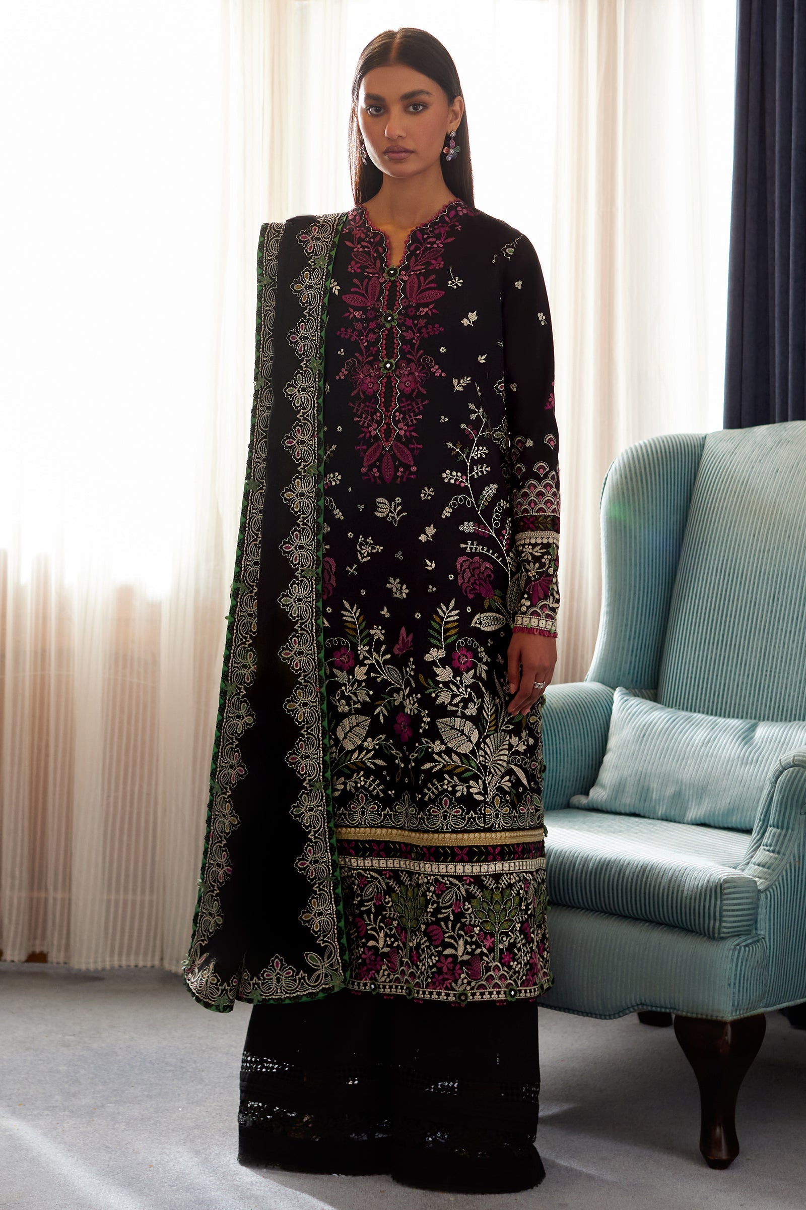 Fabric: Introducing ""Qistina,"" a variant featuring an obsidian black canvas adorned with exquisite embroidery in ivory, sage, olive, and moss, highlighted with touches of scarlet. The delicate taankas intricately weave folk tribal motifs, exuding sophistication and refinement while celebrating traditional craftsmanship with a contemporary twist. Accompanied by a dupatta seamlessly blending vibrant flora with quirky tribal prints, the ensemble is a celebration of textures and prints, prioritizing women's comfort while exuding elevated elegance. This fusion of intricate embroidery and vibrant motifs creates a captivating look that embodies both timeless charm and modern confidence, offering a unique expression of style and sophistication in ""Qistina."" QISTINA (EL24-03 B) - 3 Pc - Unstitched Embroidered Front Center Panel (Elan) 1 Piece Embroidered Front Left Side Panel (Elan) 1 Piece Embroidered Front Right Side Panel (Elan) 1 Piece Dyed Back (Elan) 1 Piece Embroidered Sleeves Left + Right (Elan) 1 Pair Embroidered Sleeves Border (Satin) 1 Meter Embroidered Hem Border (Satin) 1 Meter Embroidered Front + Back Hem Border (Satin) 2 Meters Embroidered Duppata Centre (Voile) 2 Meters Embroidered Duppata Left+Right Pallu (Voile) 1 Pair Dyed Trouser (Cambric) 2 Meters Fabric details: Elan, Satin, Organza, Voile, Cambric |