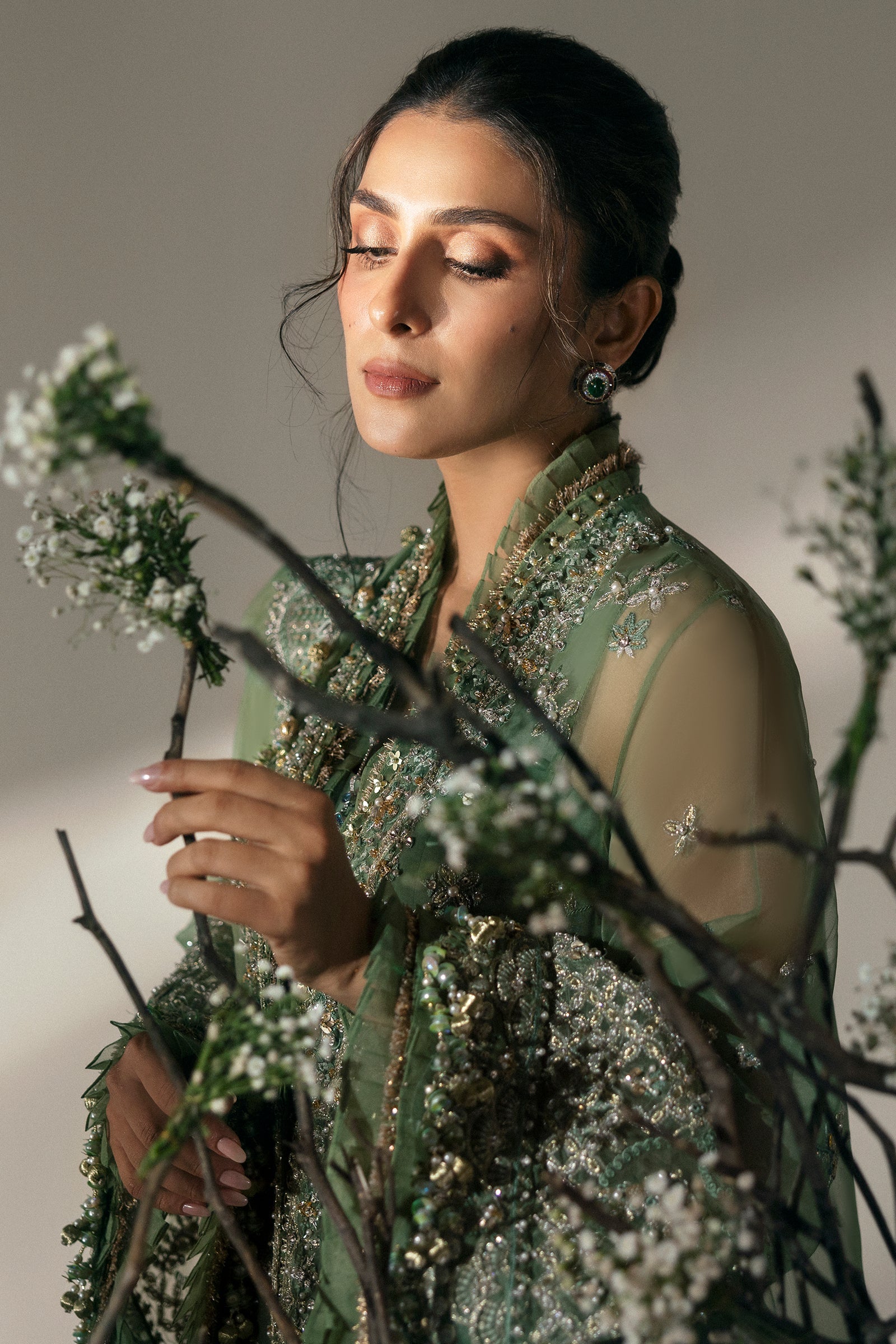 Radiant gold accents glimmer like sunlight filtering through lush palm fronds, with every detail meticulously crafted. Delicate floral vines cascade gracefully along the stole, weaving a narrative of nature's artistry.Exuding supreme elegance, ‘Twilight Teal’ is a definitive statement of sophistication, destined to leave a lasting impression at any festive occasion. Ayeza, embodying grace and allure, enchants all who behold her. Élan's artistry intertwines tradition and modernity into an enduring masterpiece, where timeless charm and luxurious allure converge effortlessly.