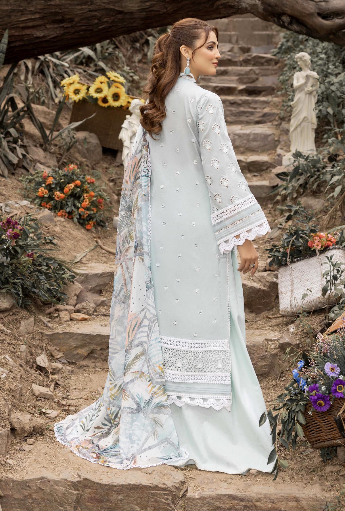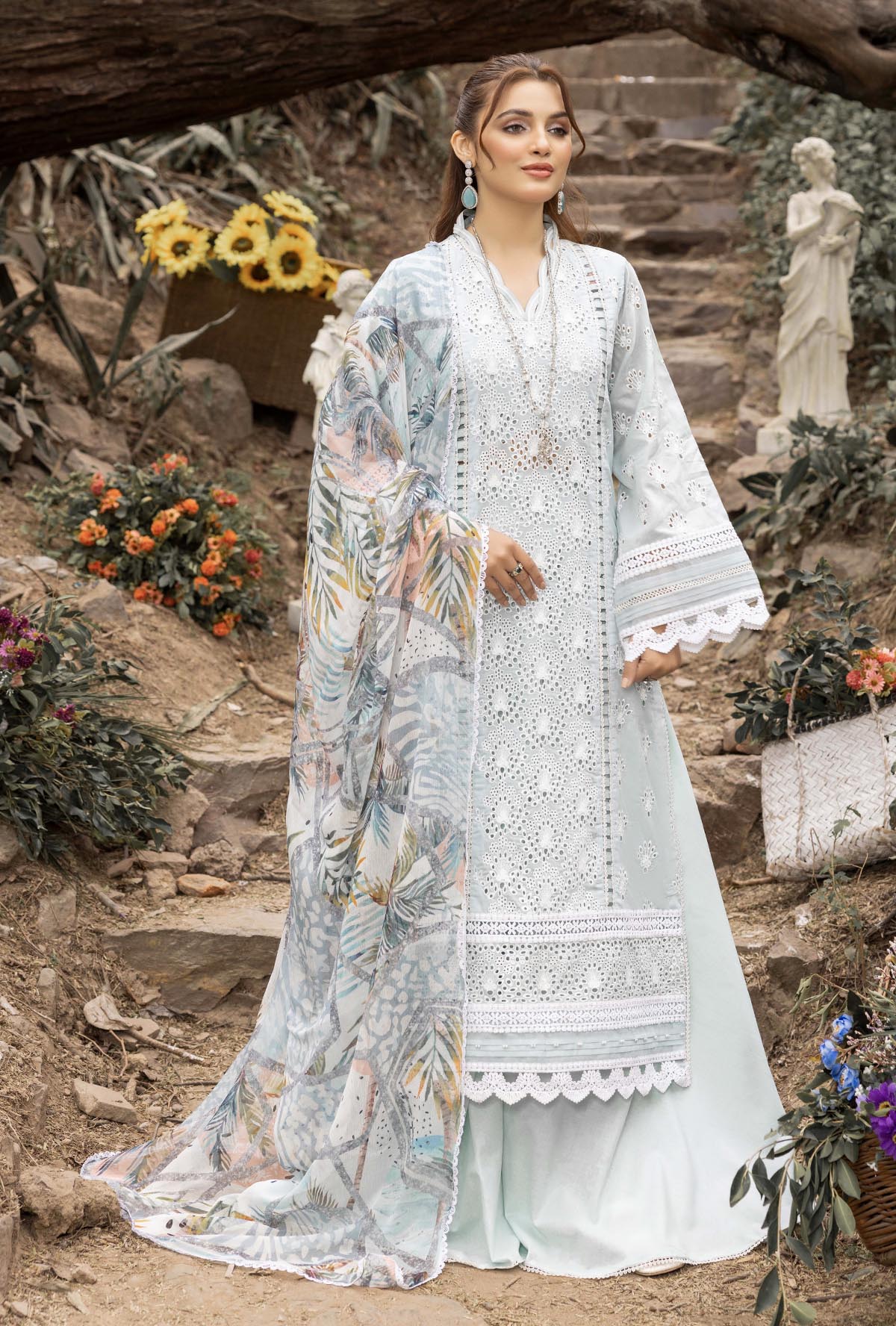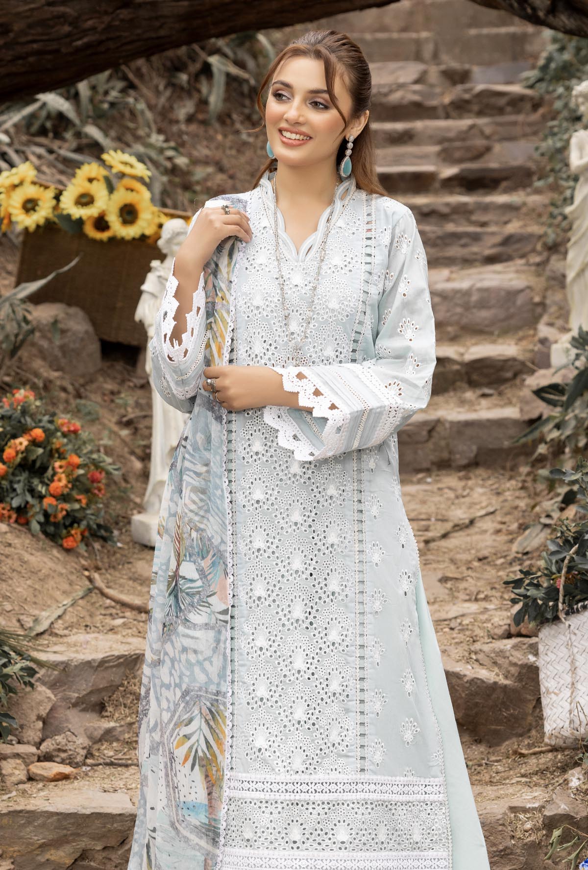 Fabric: Schiffli Embroidered Lawn Front 1.2 MTR Schiffli Embroidered Lawn Back 1.2 MTR Schiffli Embroidered Lawn Sleeves 0.66 MTR Dyed Cotton Trouser 2.5 Yard Digitally Printed Chiffon Dupatta 2.5 Yard |