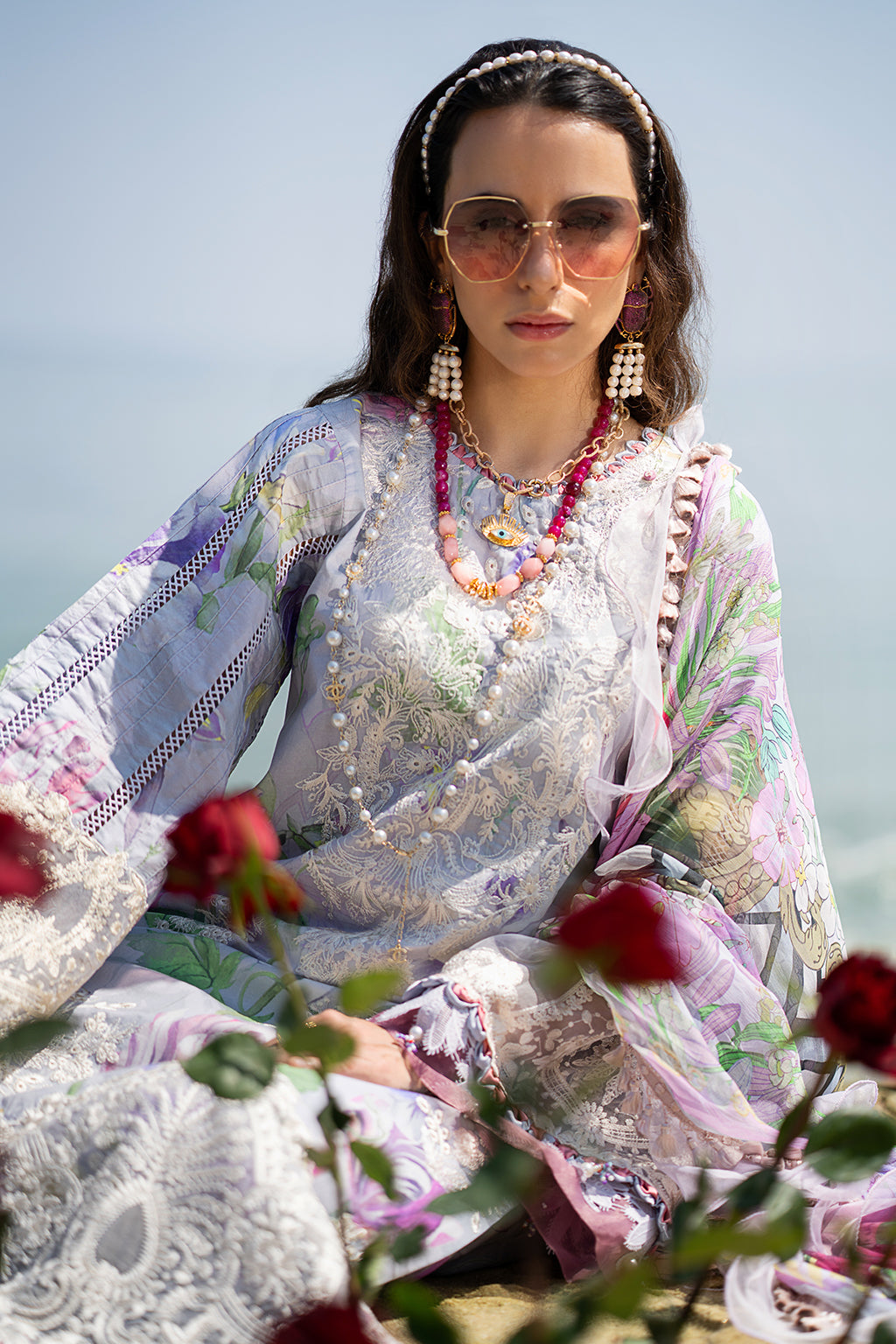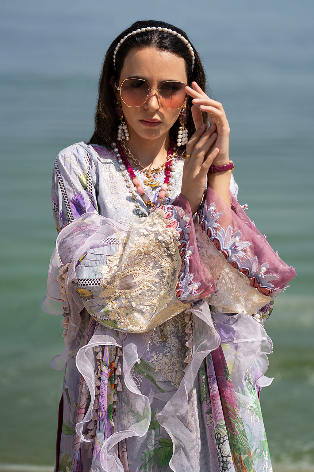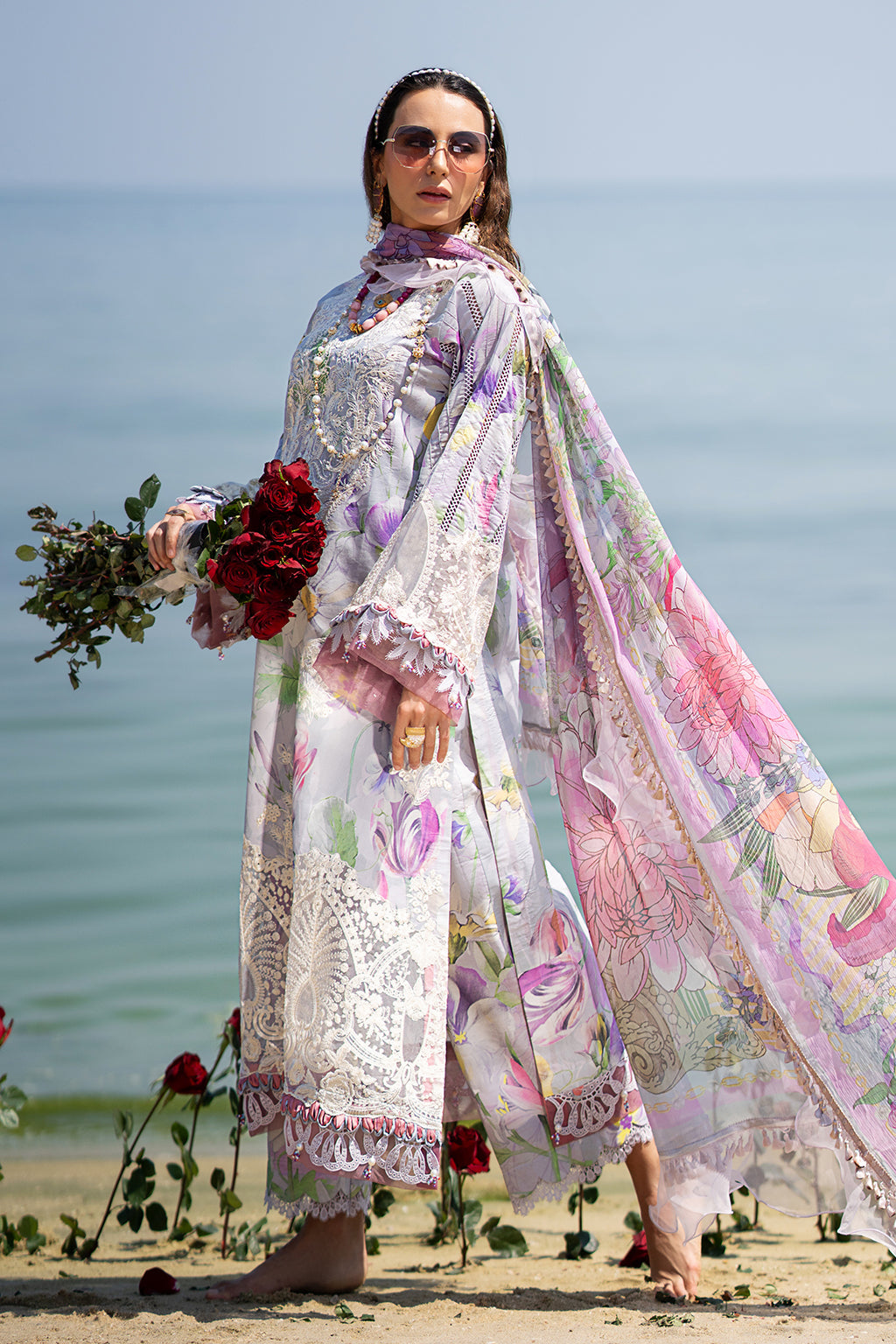 Fabric: Embroidered and printed lawn front centre panel Embroidered and prinred lawn front right panel Embroidered and printed lawn front left panel Embroidered organza front daman Printed lawn fabric for back and sleeves Embroidered organza sleeves border Printed cambric trousers fabric Printed chiffon dupatta |