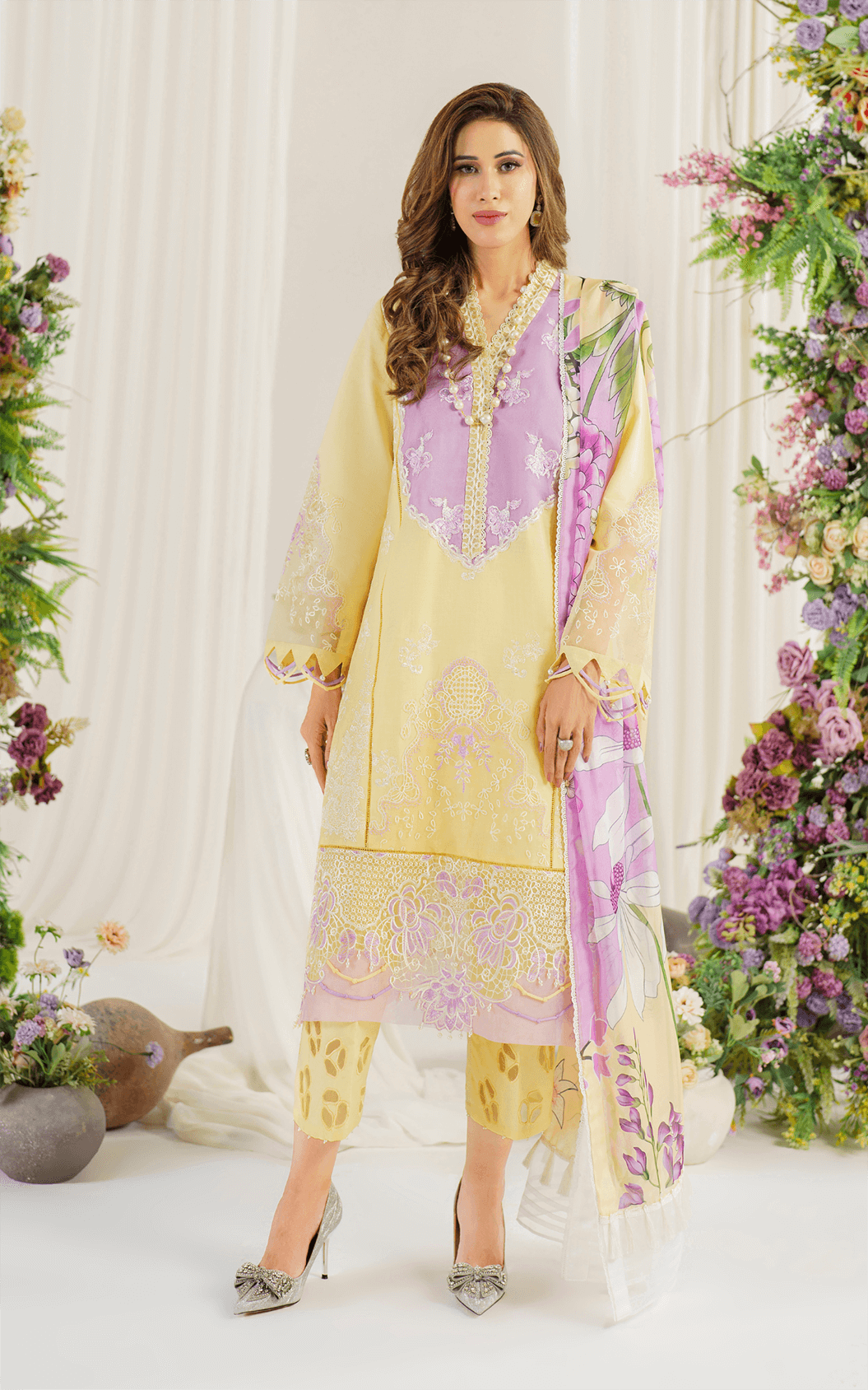 Embroidered daman border for front and back on organza.