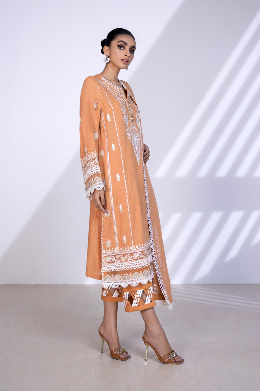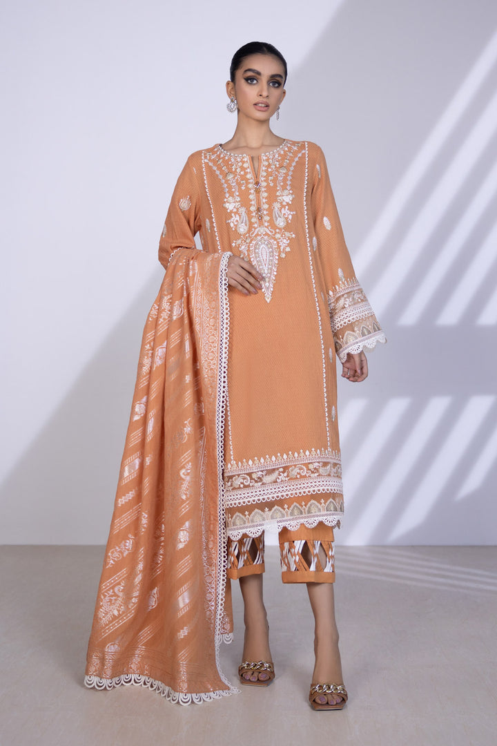 Summary: Introducing the Sapphire Reeds - 02DESRN22V11, a stunning peach-colored Pakistani suit perfect for making a statement at your next event. This unstitched three-piece ensemble features a beautifully crafted Jacquard shirt, adorned with intricate embroidery that adds a touch of glamour to the overall look. The accompanying Jacquard dupatta complements the shirt's design, enhancing the elegance of the outfit. This suit is ideal for spring or summer occasions, offering both comfort and style. The rich peach hue exudes warmth and sophistication, perfect for adding a pop of color to your wardrobe. The high-quality Jacquard fabric drapes gracefully and ensures breathability, making it perfect for warmer weather. Whether it's a wedding reception or a festive celebration, this versatile suit is sure to turn heads. Customize the stitching to your liking and create a unique look that reflects your personal style. The Sapphire Reeds - 02DESRN22V11 is more than just an outfit; it's an expression of elegance and charm. Order yours today and experience the perfect blend of traditional craftsmanship and contemporary design.