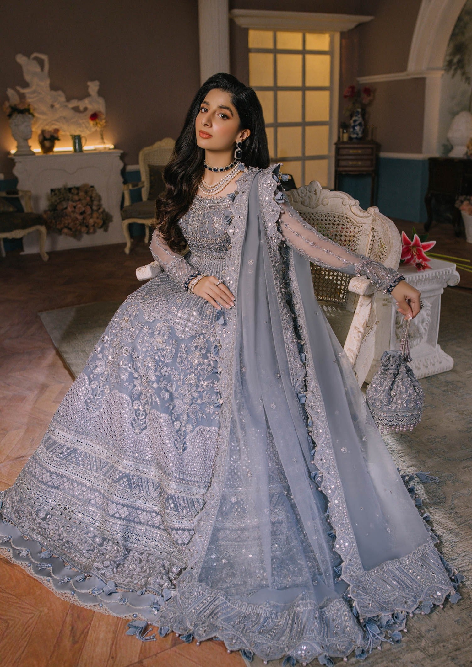 Fabric: In an exquisite ode to tradition, our celestially crafted pishwas, ‘Nazik’ is rendered in jewelled ice blue. The grand twelve panelled kalidar is intricately hand embellished in accordance with quintessential Élan workmanship with sitaras, scintillating stones, and gotta and sheathed with iridescent crystalline emblazonry. Paired with a diaphanous organza dupatta with elaborately embroidered borders and pallus, this ethereal silhouette is simply divine. Embellished+Embroidered Front Body (Organza) 1 Piece Embellished+Embroidered Front Kali (Organza) 6 Piece Embroidered Back Body (Organza) 1 Piece Embroidered Back Kali (Organza) 6 Piece Embellished+Embroidered Sleeve Left+Right (Organza) 1 Pair Embellished+Embroidered Sleeve Patti (Organza) 1 Meter Embellished+Embroidered Front Border (Organza) 1.85 Meters Embroidered Back Border (Organza) 1.85 Meters Embroidered Dupatta Centre (Organza) 2 Meters Embroidered Dupatta Left Pallu (Organza) 1 Piece Embroidered Dupatta Right Pallu (Organza) 1 Piece Dyed Slip (Raw Silk) 2.5 Meters Dyed Trouser (Raw Silk) 2.5 Meters Fabric details: Poly Organza, Raw Silk Note: Only Dry Clean This is an unstitched article Disclaimer: Please note that the color of the item you receive may vary slightly from that shown in the product shoot. This can happen due to the variation in light at the time of product and fashion shoot. This is a concept stitched article and may not contain certain embellishments. |