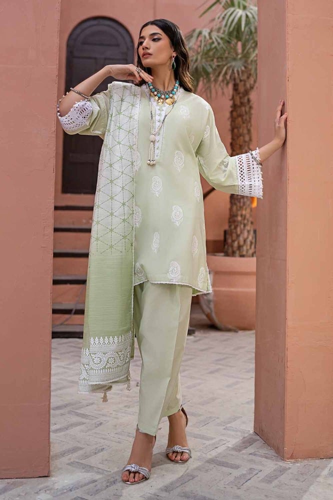 Fabric: Lacquer Printed Paper Cotton Dupatta with Croatia Lace - 2.50 Meters Lacquer Printed Lawn Shirt with Schiffli Embroidered Borders for Neckline & Shirt Front - 1.75 Meters Dyed Trouser – 2.00 Meters |