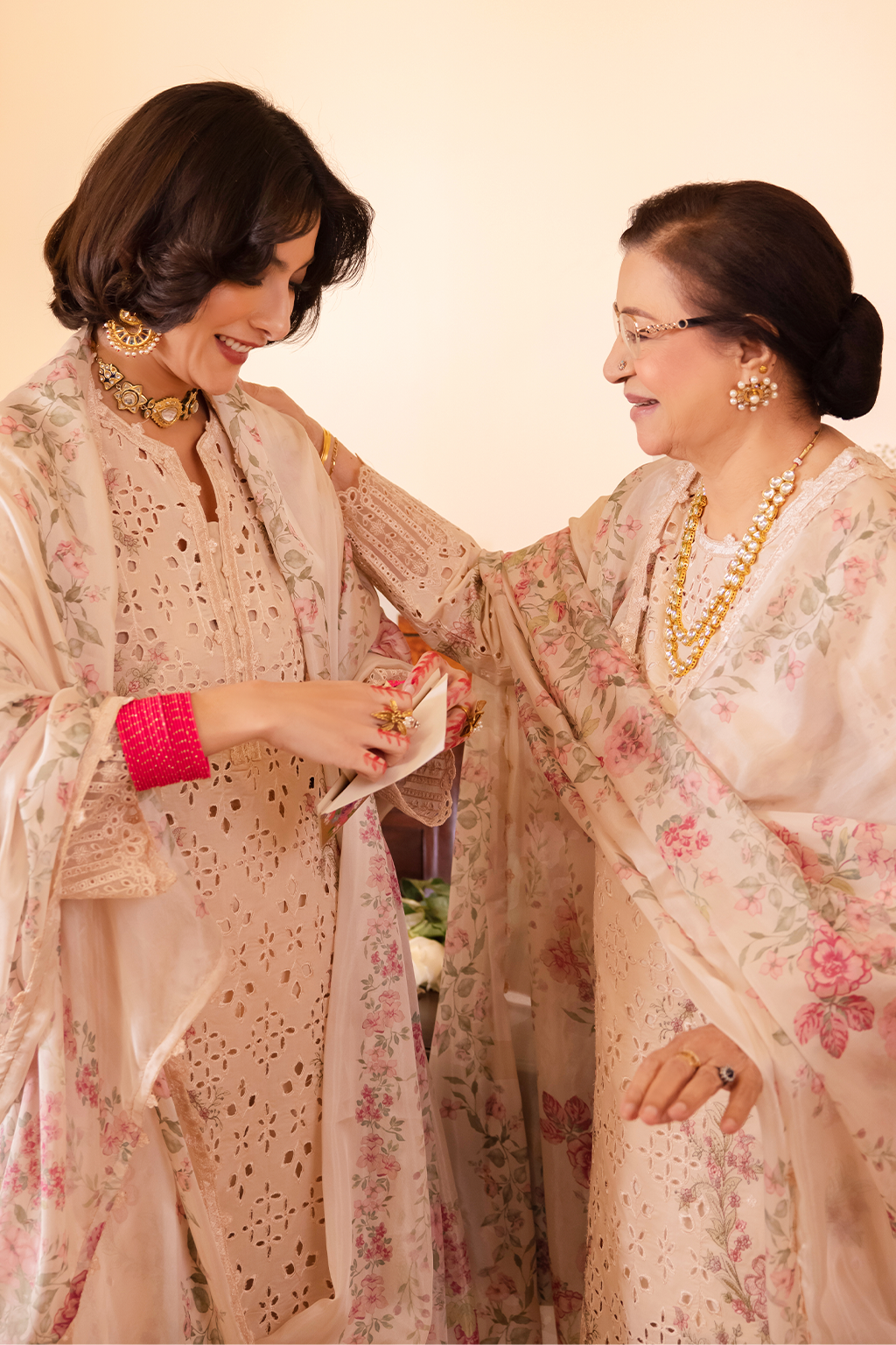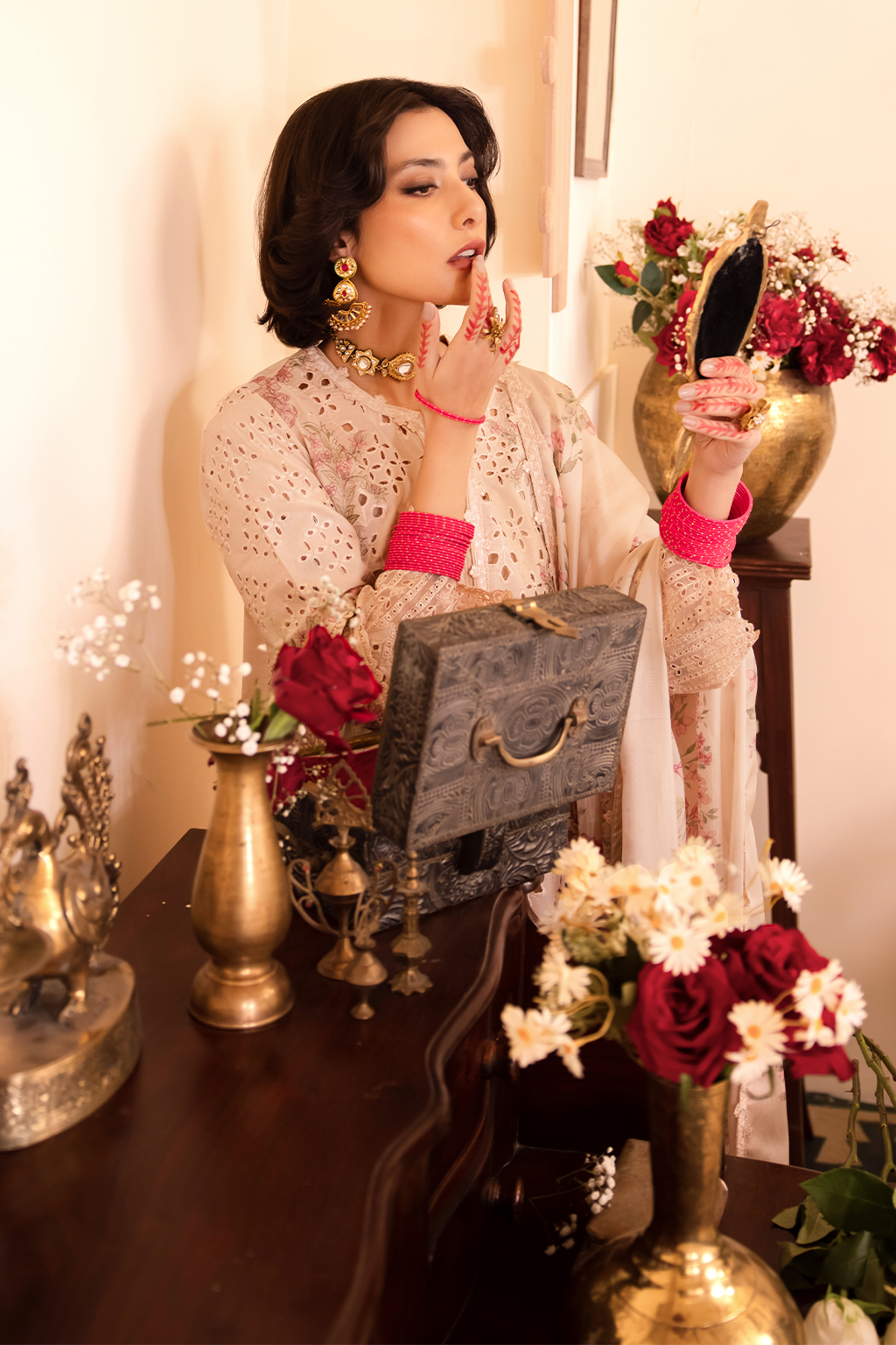 Summary: Celebrate Eid in style with the Iznik Nani Ka Ghar Eid Lawn Collection NKG-12. This stunning off-white Pakistani suit is crafted from high-quality borer embroidered lawn, featuring delicate floral patterns and intricate lace details. The shirt front showcases exquisite borer embroidery with lace, while the back is made of dyed plain lawn for a comfortable fit. The accompanying printed silk dupatta adds a touch of elegance with its vibrant hues and embroidered organza lace. Complete with dyed cambric trousers, this unstitched three-piece suit offers versatility in styling. Perfect for Eid celebrations or other festive occasions, the NKG-12 guarantees a sophisticated and graceful look. The breathable lawn fabric ensures comfort during warmer months, making it an ideal choice for spring/summer events. This authentic Iznik creation is a must-have for those seeking a blend of traditional charm and contemporary design.
