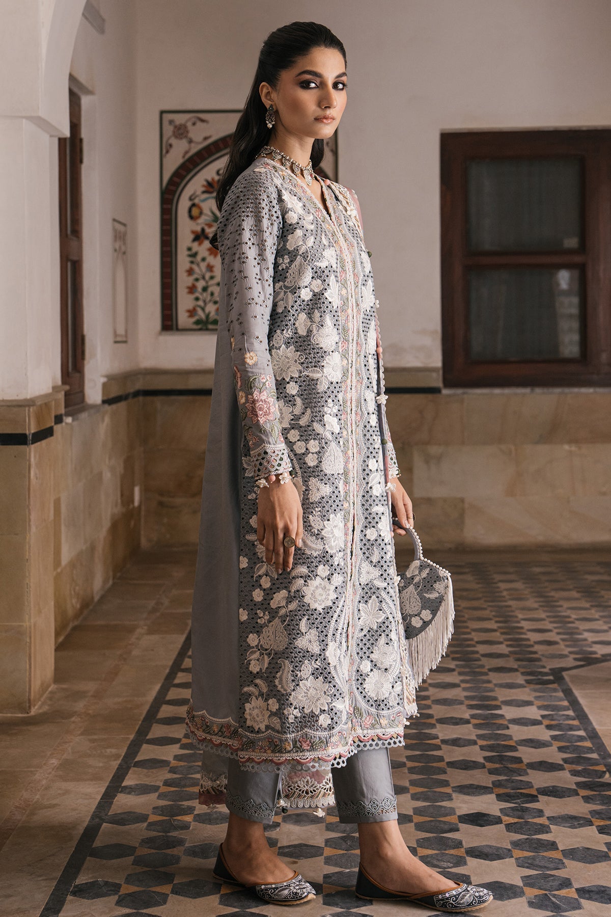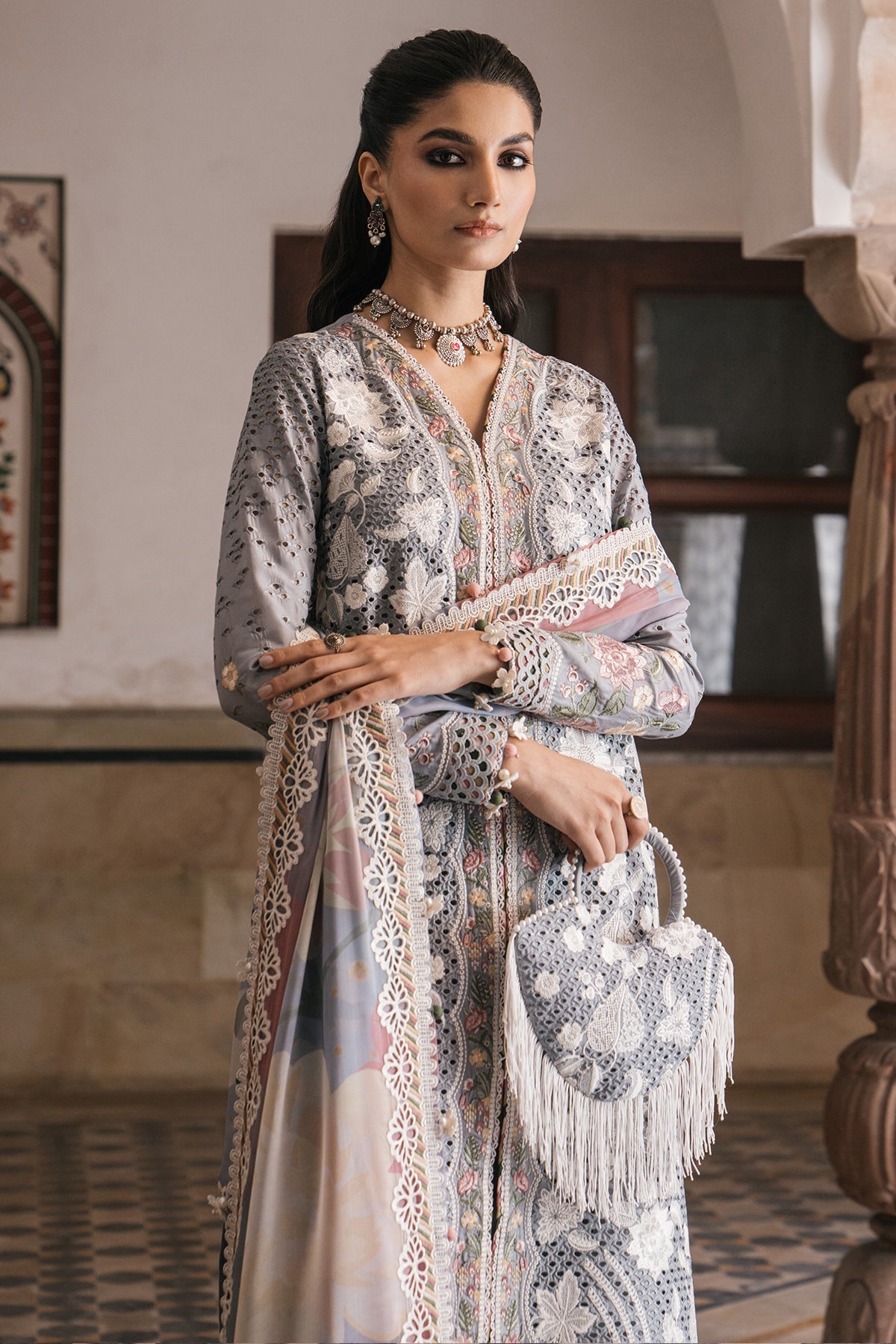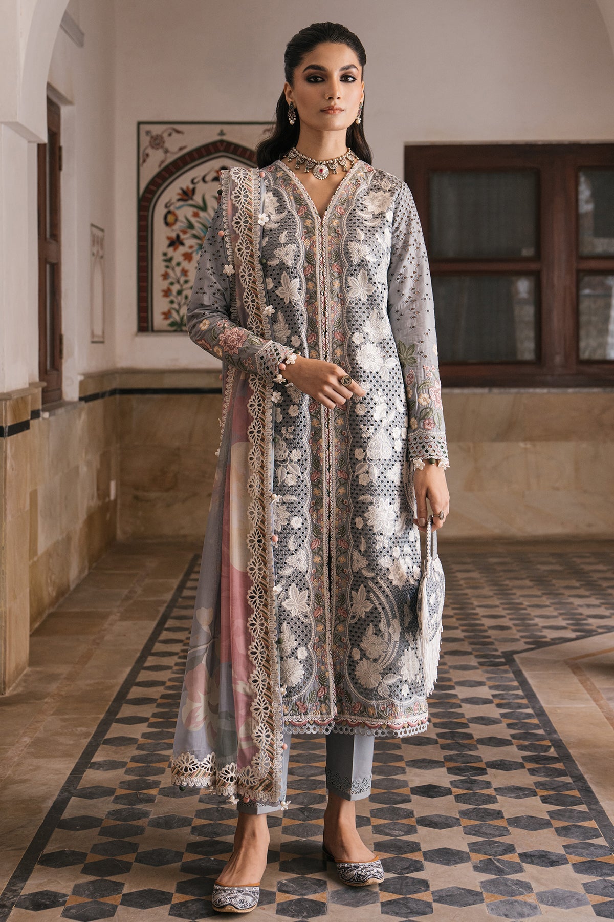 Fabric: Description: Embroidered Lawn Front Left & Right Panels with Boring Techniques Embroidered Sleeves with Boring Techniques Embroidered Front, Back and Sleeves Border Digital Printed Dupatta with Embroidered Borders Dyed Lawn Back Dyed Cambric Trouser |