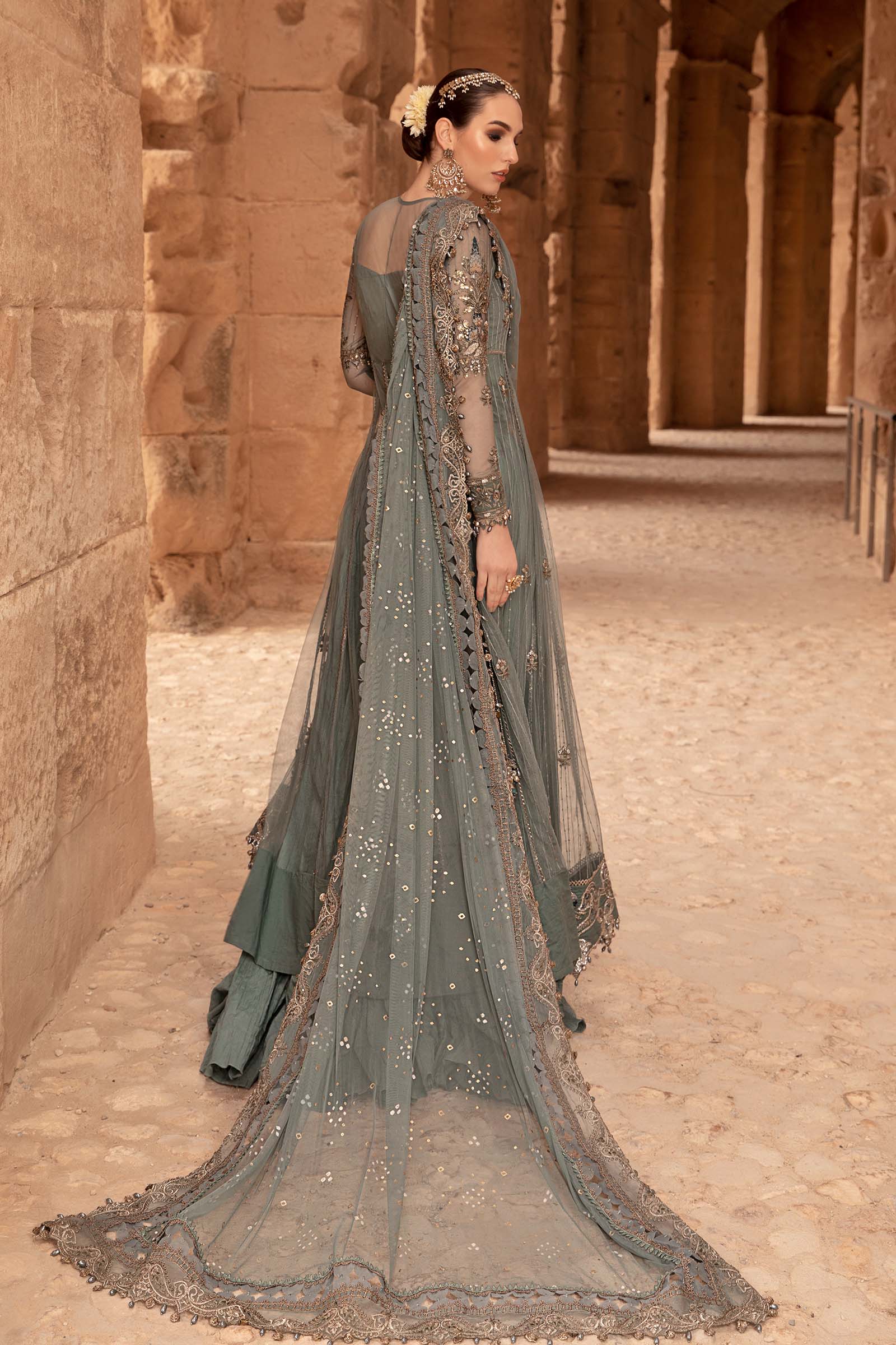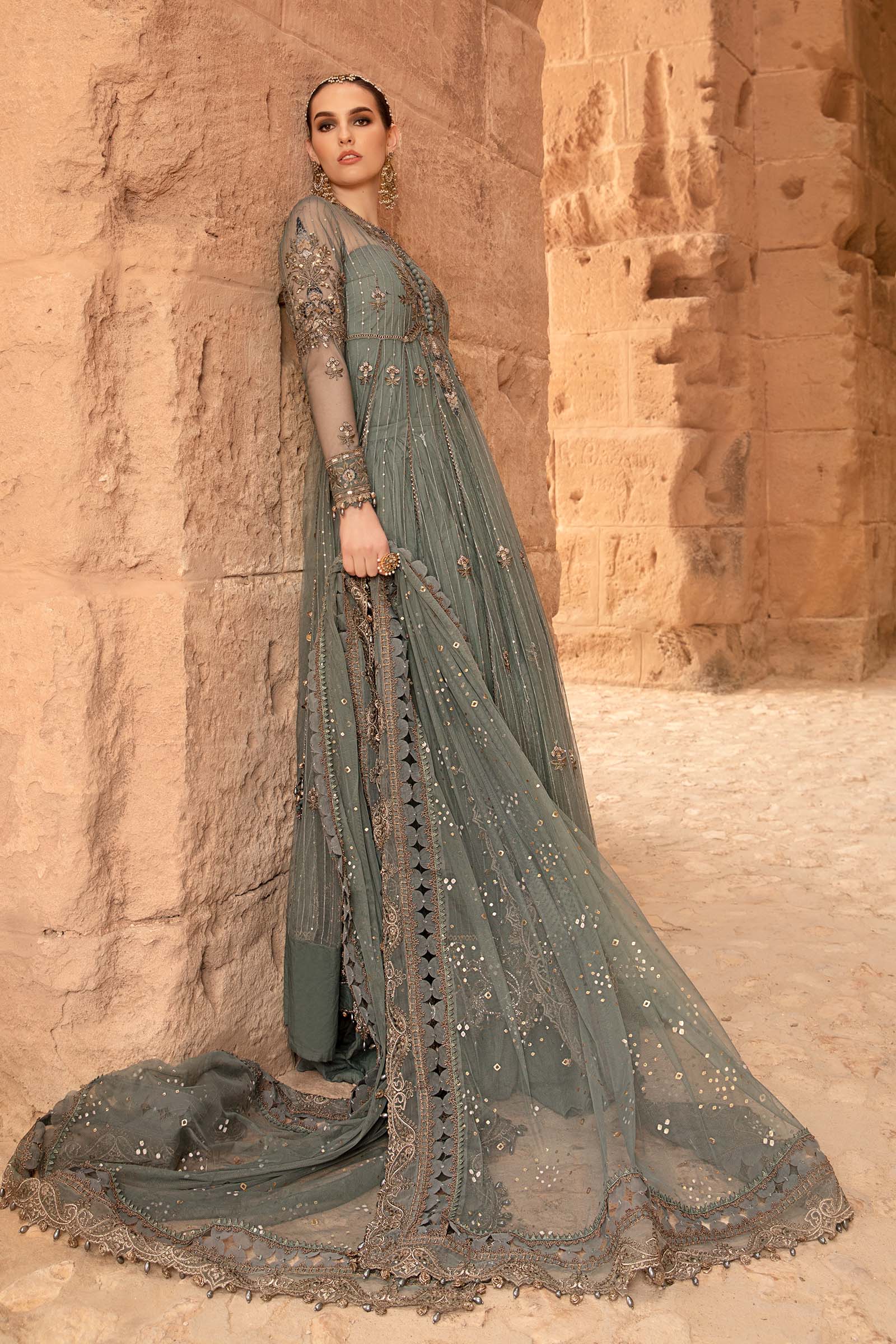 Fabric: Shirt Embroidered Net Front Bodice Embroidered Net Front Embroidered Net Sleeves Embroidered Lawn Sleeves Patti Embroidered Lawn Ghera Patti Dyed Net Back Undershirt Dyed Lawn Undershirt Dupatta Pearl Printed Net Dupatta Embroidered Organza Dupatta Patti Trousers Dyed Cambric Trouser Color: Teal |