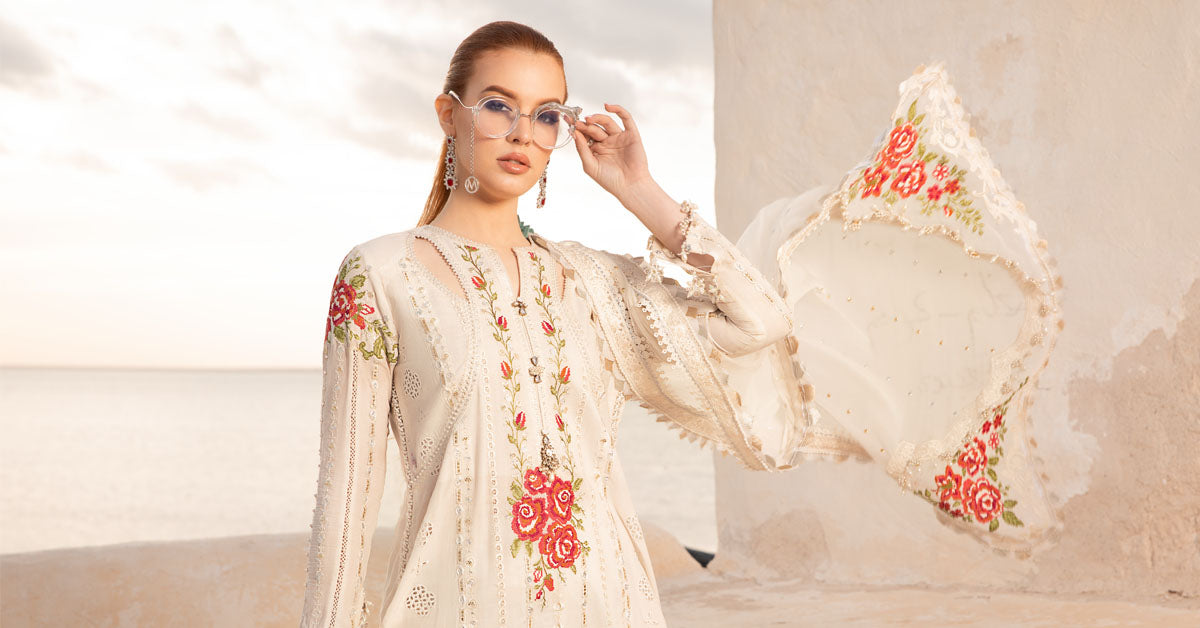 Fabric: Shirt Embroidered Lawn Center Panel Embroidered Lawn Side Panels Embroidered Lawn Sleeves Embroidered Organza Sleeves Patches Embroidered Organza Ghera Patch Embroidered Organza Ghera Lace Dyed Lawn Back Dupatta Chiffon Mukesh Dupatta Embroidered Organza Dupatta Pallu Embroidered Organza Dupatta Patti Trousers Dyed Cambric Trouser Color: Off White |
