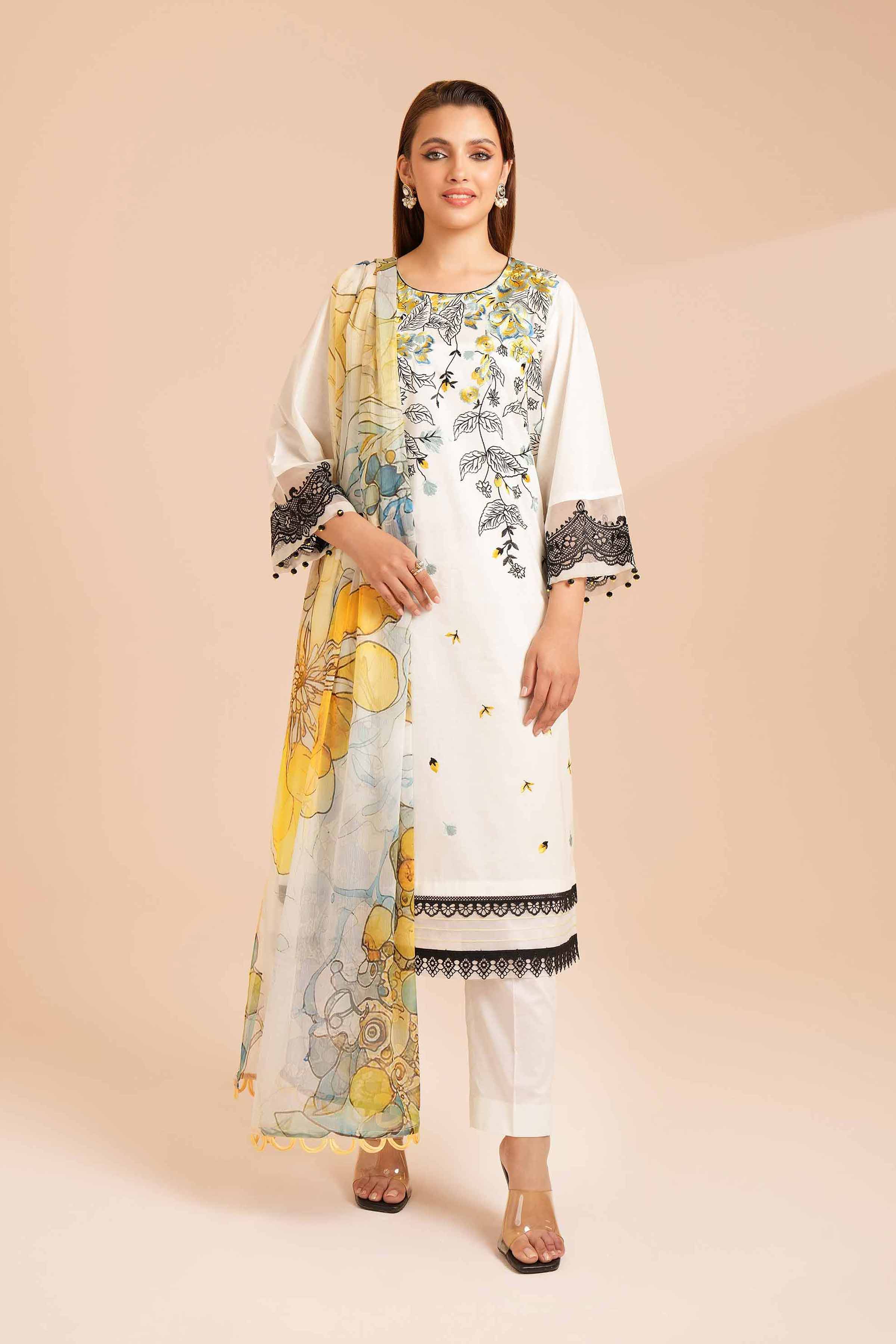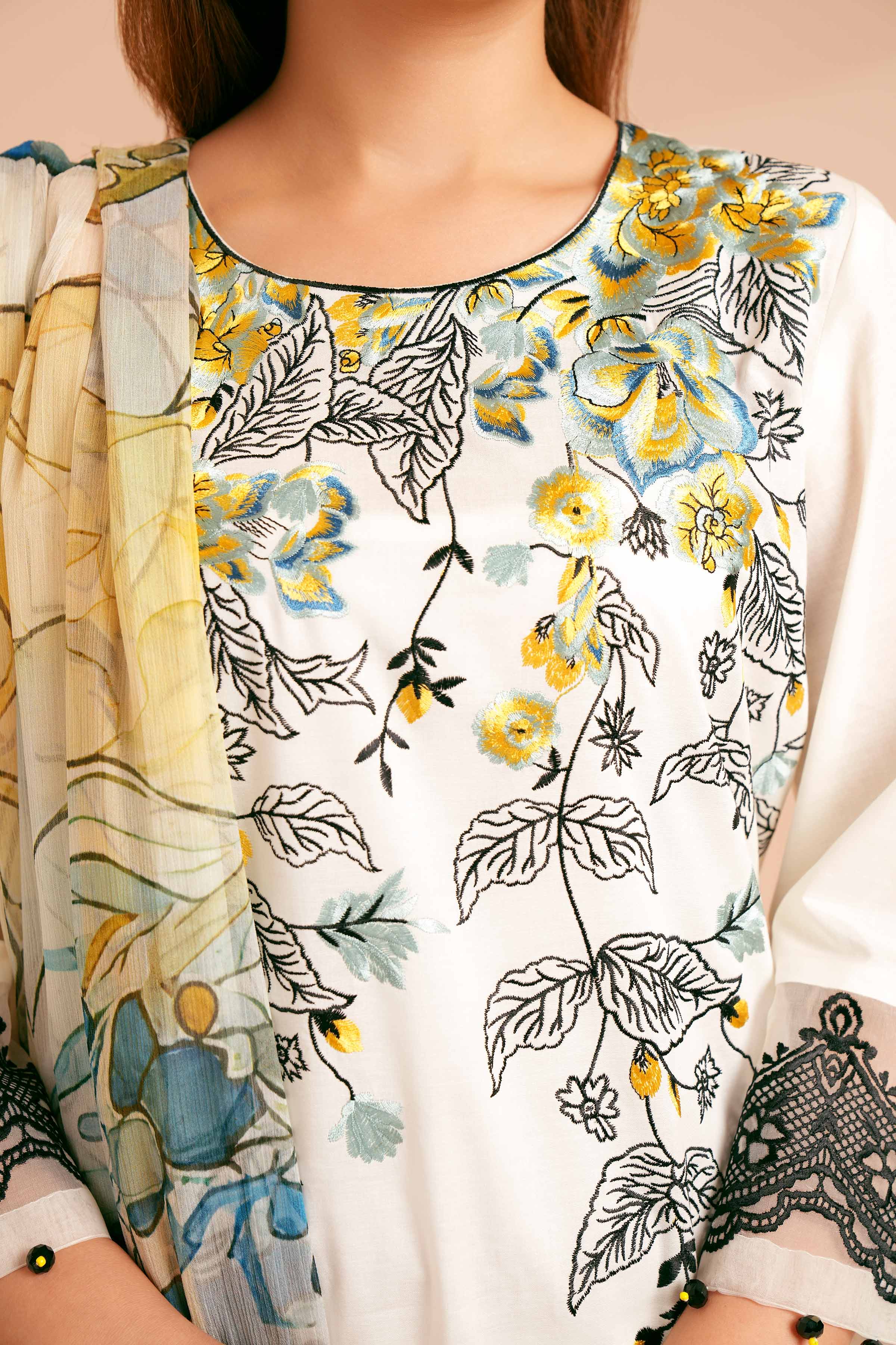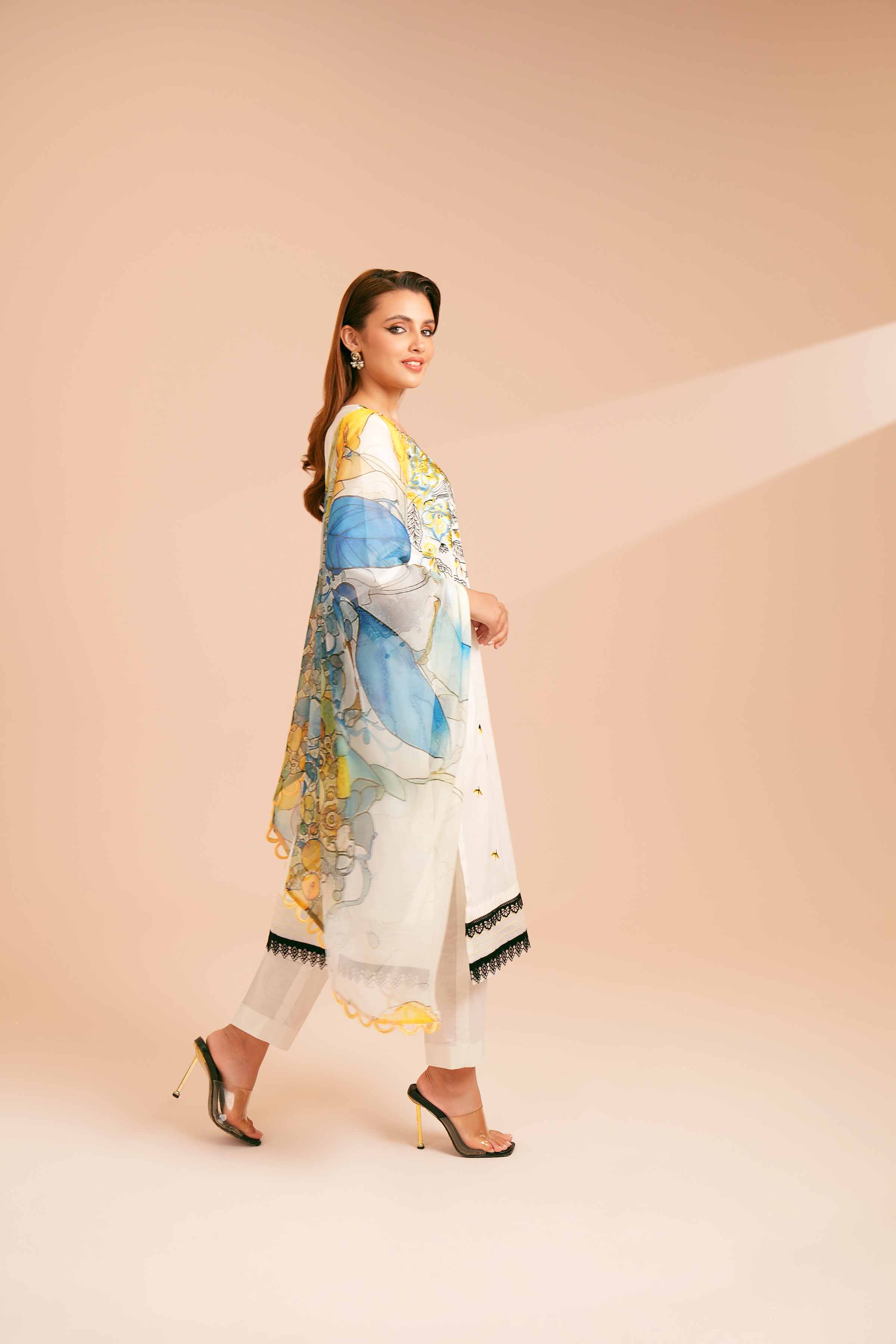 Fabric: Catch a versatile look by wearing this embroidered three-piece from the latest unstitched summer collection. Product Detail: Glass Painting Pattern Effect Style Shirt with Dupatta and Trousers SHIRT Dyed Cambric Shirt: 3 Meter Embroidered Front + Border Fabric: Cambric Color: White DUPATTA Digital Printed Crinkle Chiffon Dupatta: 2.5 Meter Fabric: Crinkle Chiffon Color: Light Yellow TROUSERS Dyed Cambric Trousers: 2.5 Meter Fabric: Cambric Color: White Note: Product color may slightly vary due to photographic lighting sources or your device settings. |