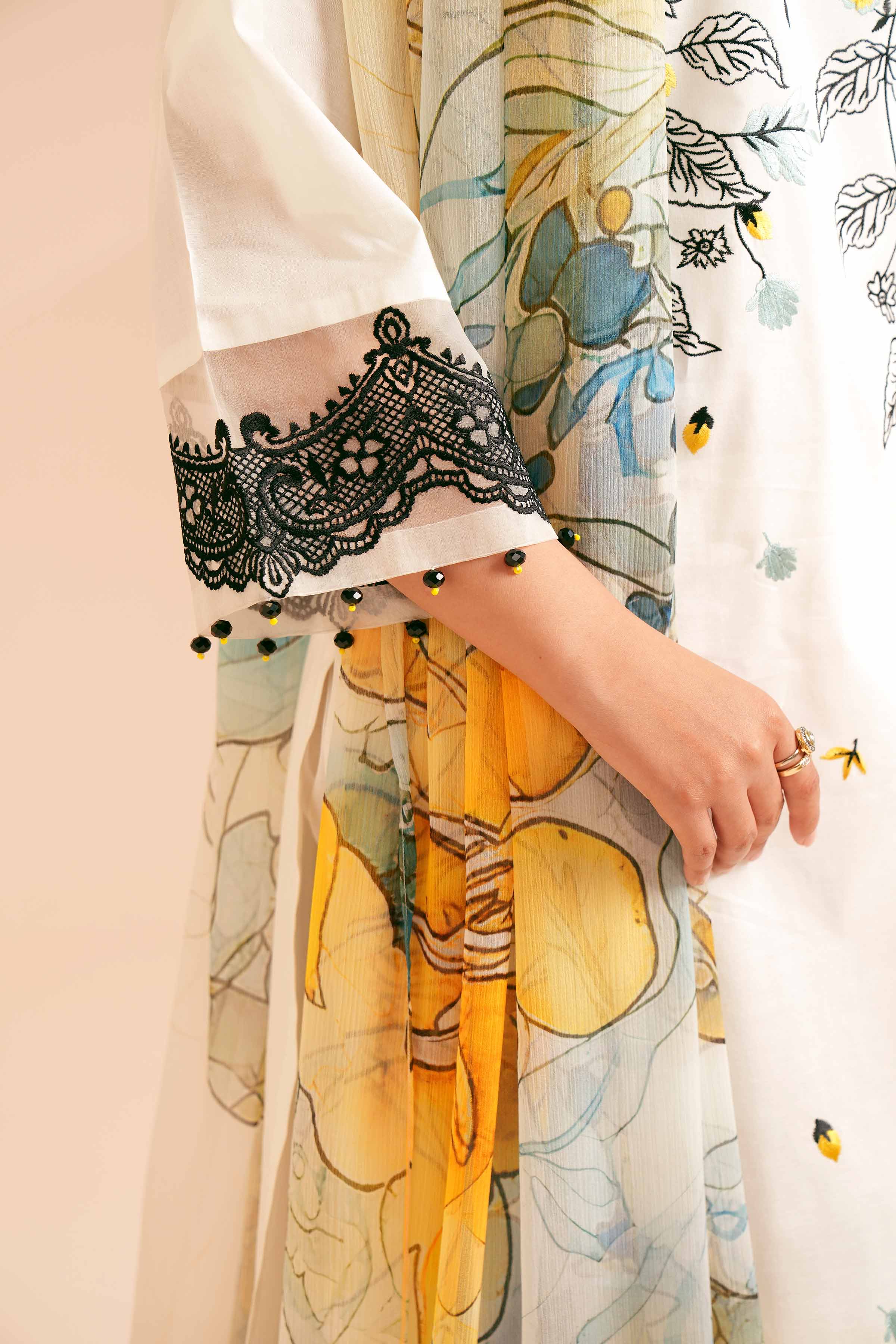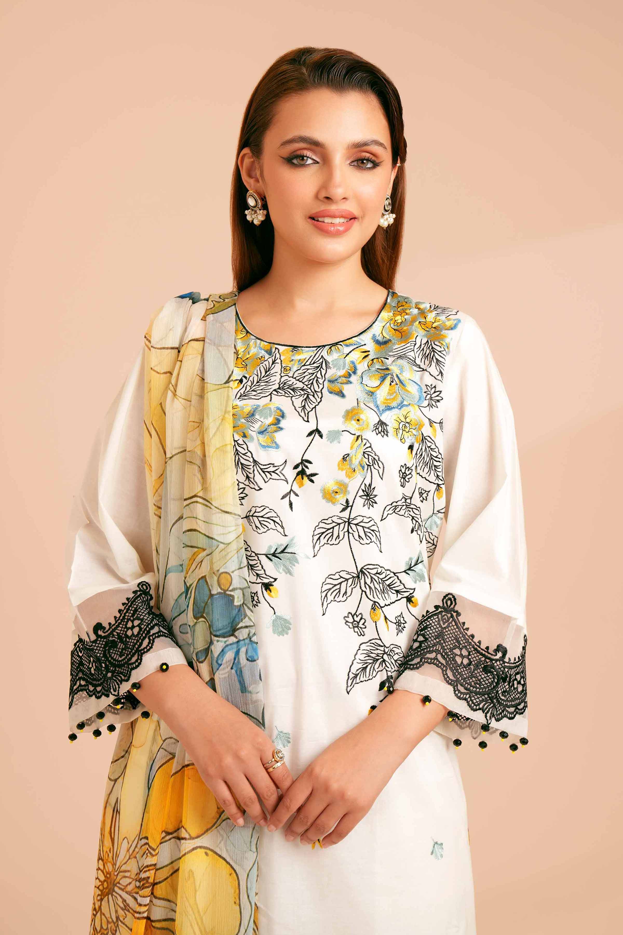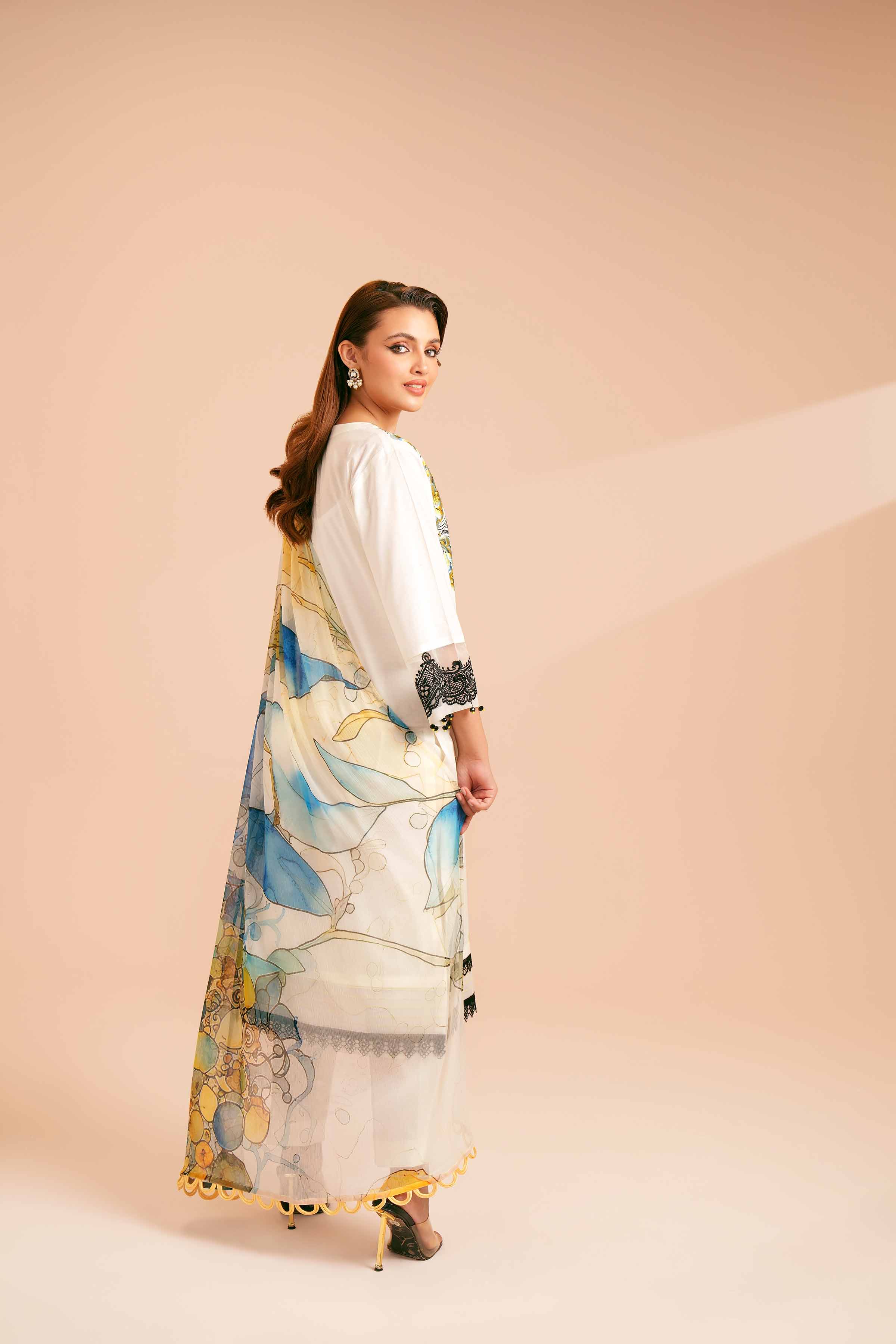 Fabric: Catch a versatile look by wearing this embroidered three-piece from the latest unstitched summer collection. Product Detail: Glass Painting Pattern Effect Style Shirt with Dupatta and Trousers SHIRT Dyed Cambric Shirt: 3 Meter Embroidered Front + Border Fabric: Cambric Color: White DUPATTA Digital Printed Crinkle Chiffon Dupatta: 2.5 Meter Fabric: Crinkle Chiffon Color: Light Yellow TROUSERS Dyed Cambric Trousers: 2.5 Meter Fabric: Cambric Color: White Note: Product color may slightly vary due to photographic lighting sources or your device settings. |