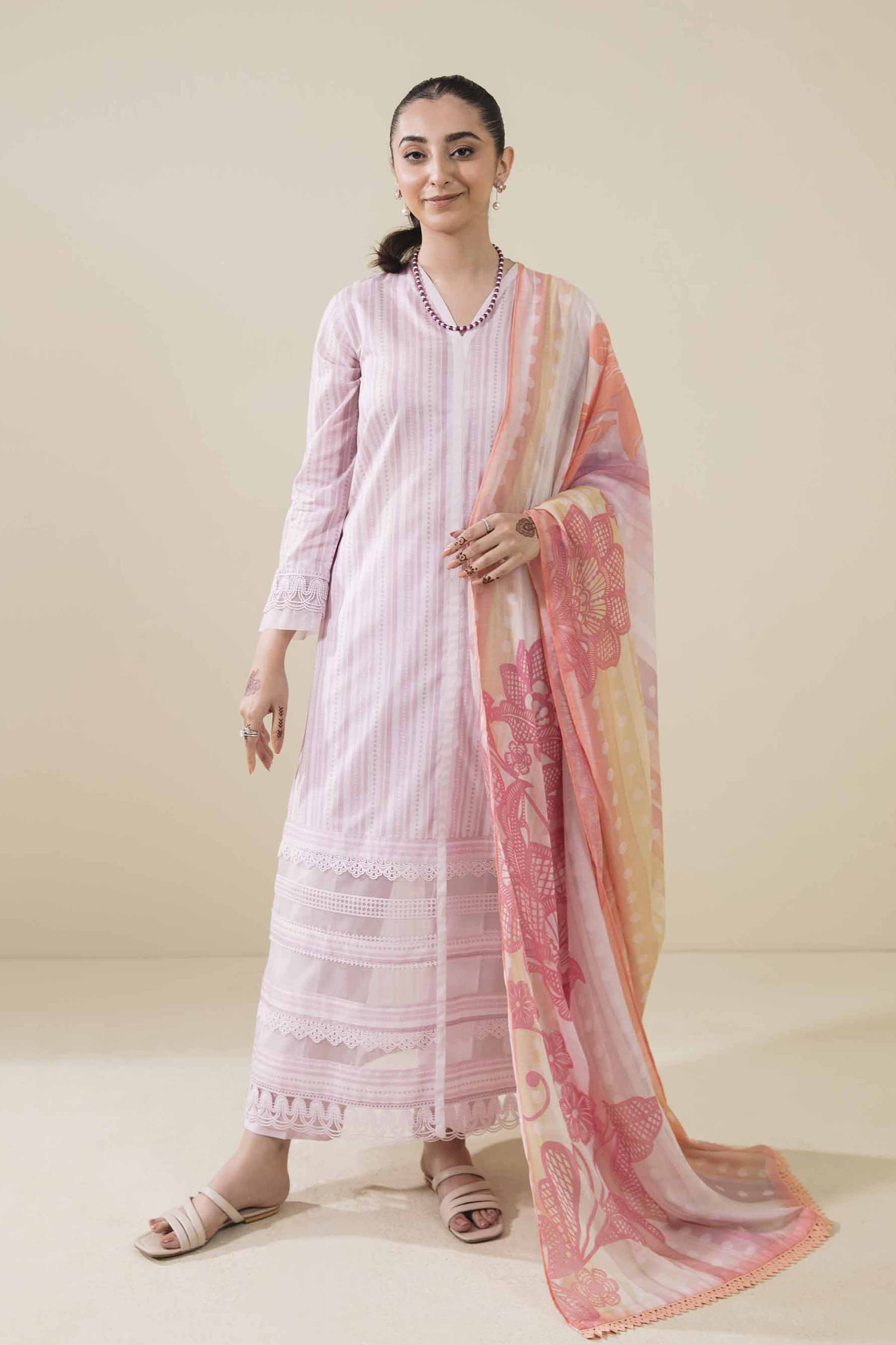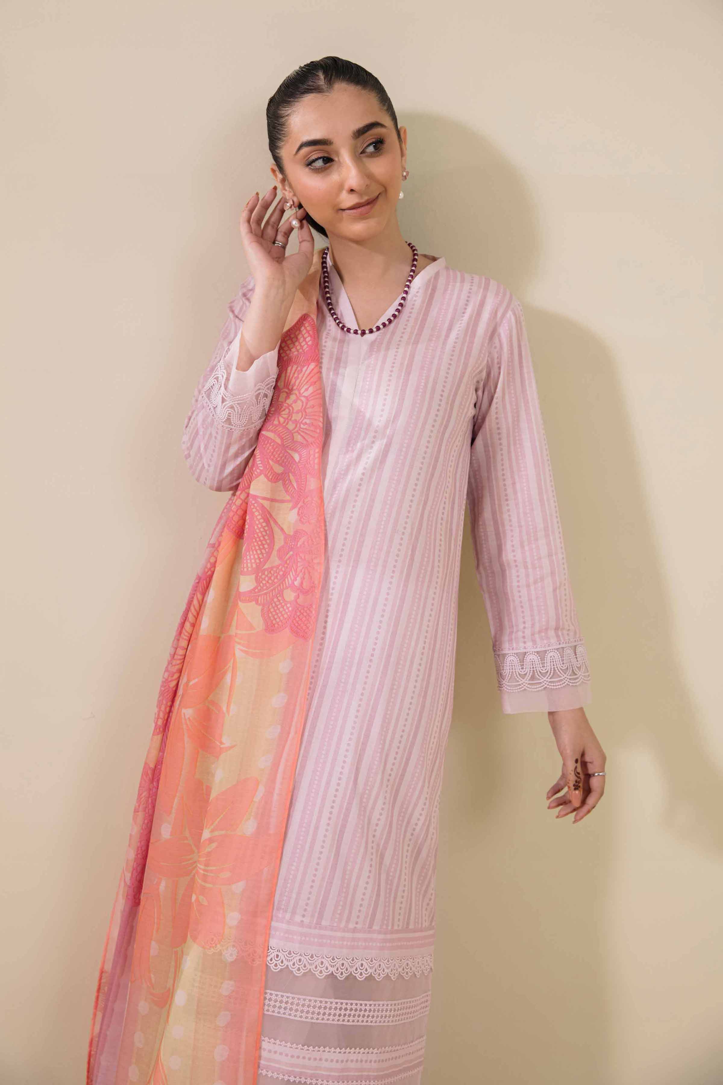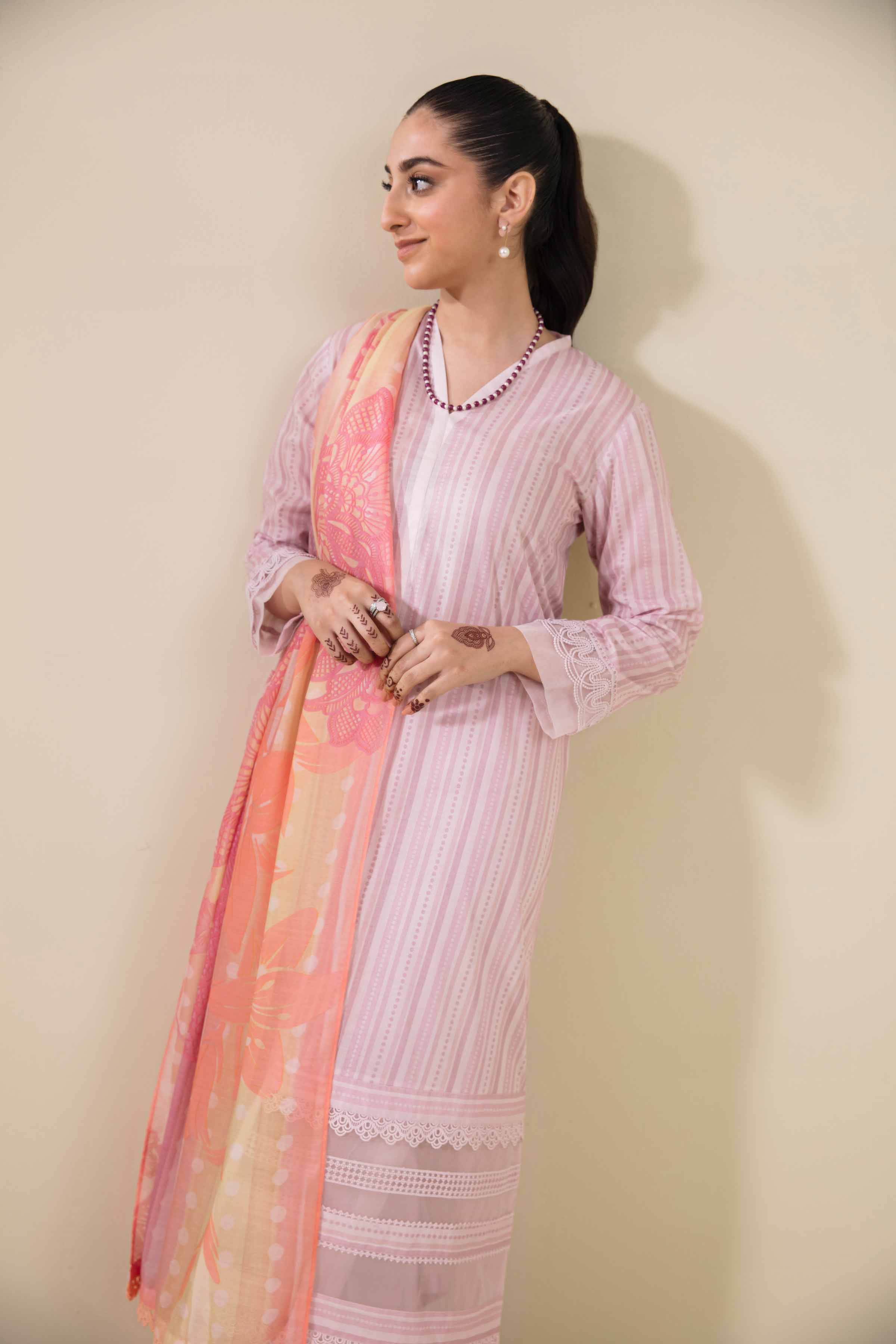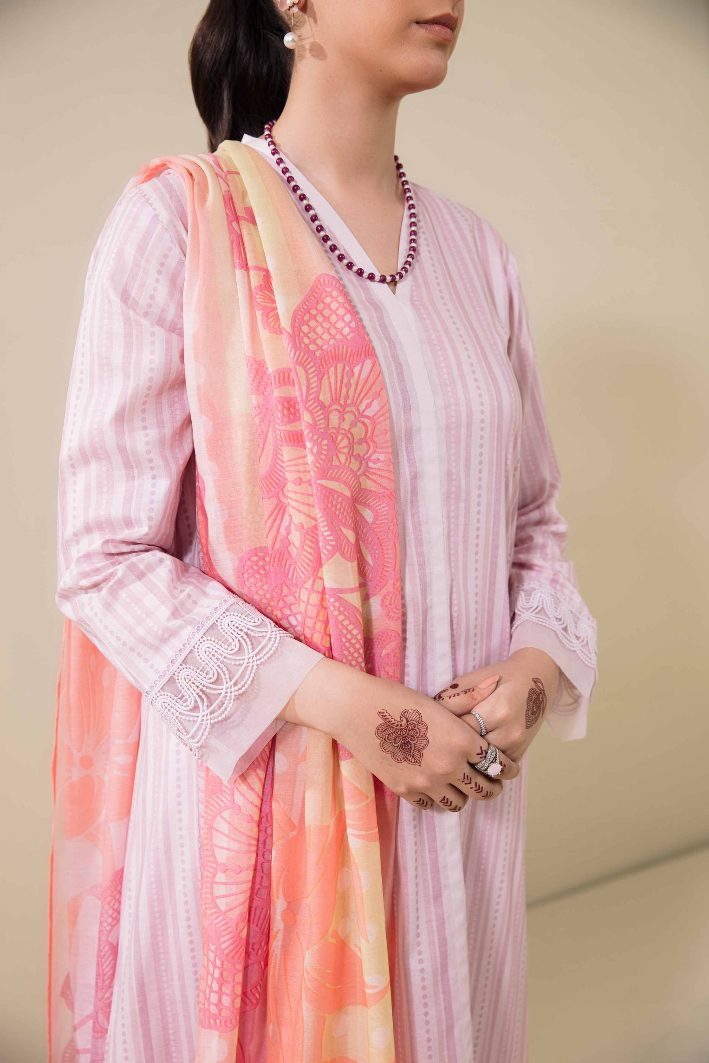 Fabric: Look gorgeous effortlessly by wearing three-piece from the latest unstitched summer collection. Product Detail: Laces With Stripes Printed Style Shirt with Dupatta and Trousers SHIRT Printed Super Fine Lawn Shirt: 3 Meter Fabric: Lawn Color: Light Pink DUPATTA Digital Printed Muzlin Dupatta: 2.5 Meter Fabric: Muzlin Color: Multi TROUSERS Dyed Cambric Trousers: 2.5 Meter Fabric: Cambric Color: Light Pink Note: Product color may slightly vary due to photographic lighting sources or your device settings. |