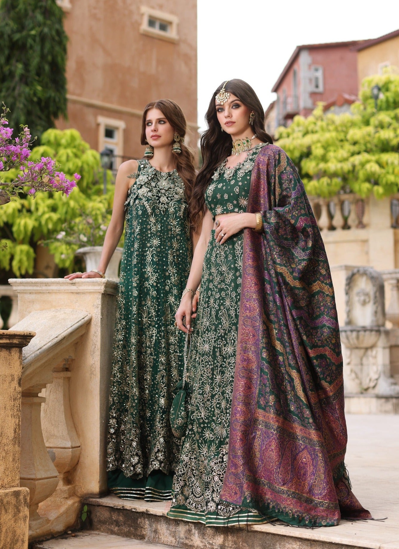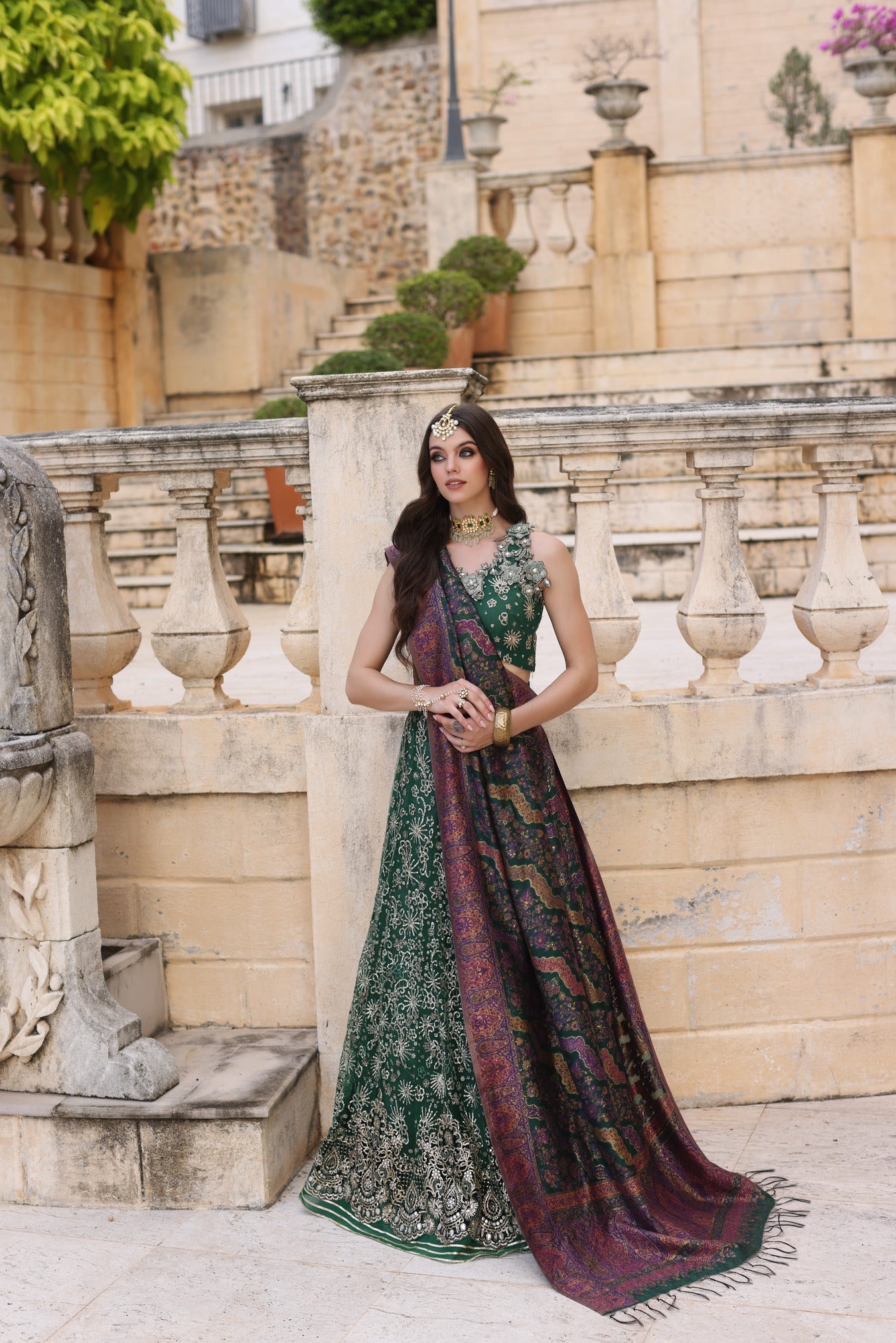 Fabric: Sequin embroidered net front panels Sequin embroidered net back panels Sequin embroidered net sleeves Dyed raw silk trouser Handwoven pure silk kaani shawl Handworked neck patches encrusted with pearls,rhinstones,naqshi & sequin Pani & sequin embroidered velvet patches for hem and sleeves |