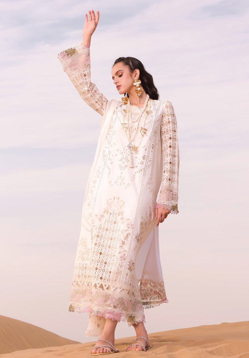 Fabric: Shirt Chikan kari Embroidered Center Panel Chikan kari Embroidered Panels (Left & Right) Embroidered Neckline (Front) Embroidered Border (Front & Back) Plain Back Embroidered Flowers Sleeves & Dupatta Pallu Chikan kari Embroidered Sleeves Embroidered Border (Sleeves) Dupatta Dyed Silk Dupatta Chikan kari Embroidered Dupatta Pallu Trouser Plain Trouser Fabric Details Shirt : Lawn Dupatta : Silk Trouser : Cotton |