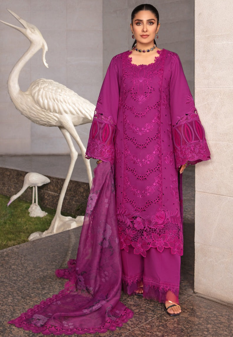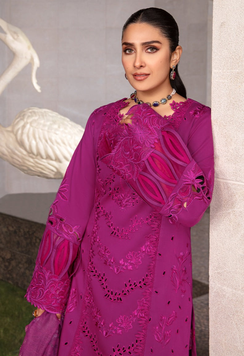 Fabric: Embroidered shirt front center panel on dyed lawn 1 pcs Embroidered shirt front left panel on dyed lawn 1 pcs Embroidered shirt front right panel on dyed lawn 1 pcs Shirt back and sleeve on dyed lawn 2 yard Embroidered shirt front border on dyed organza 33 inch Embroidered shirt sleeve border on dyed organza 45 inch Embroidered shirt sleeve motif on dyed organza 1 pair Digital printed woven dupatta 2.75 yard Dyed cotton trouser 2.75 yard |