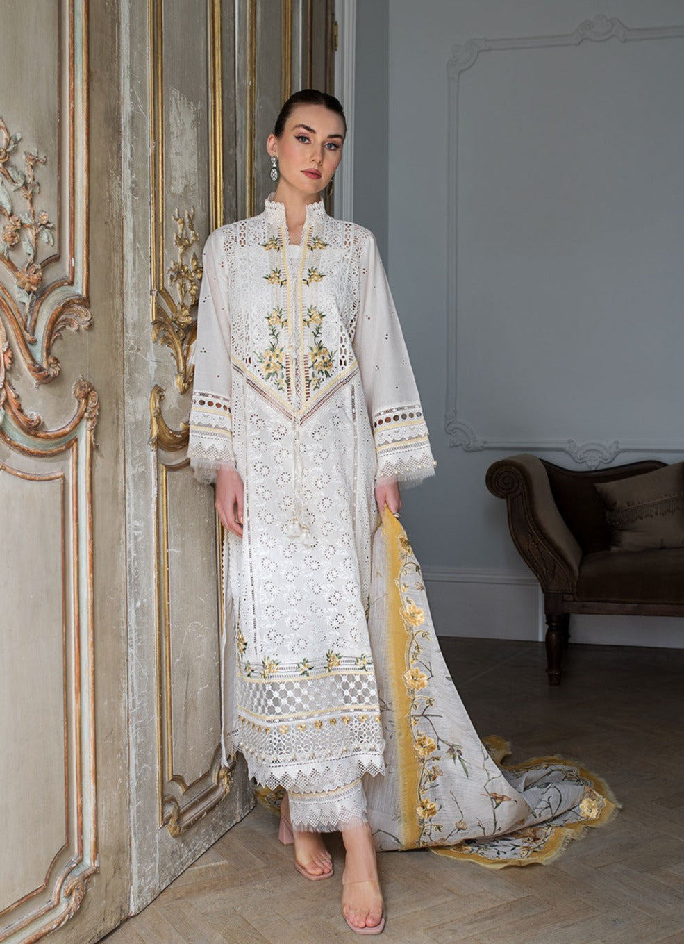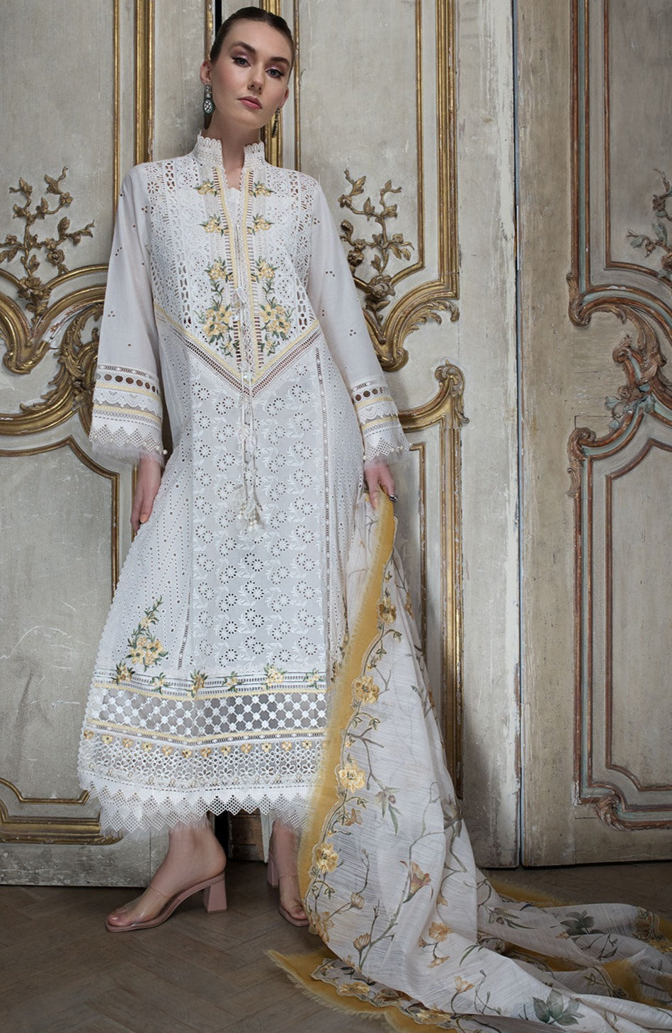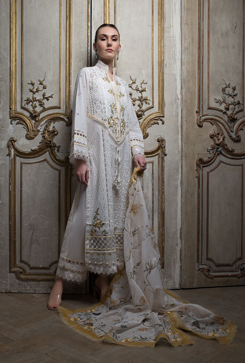 Fabric: Unstitched Suit includes: Embroidered Front Embroidered Neck Border Embroidered Sleeves Embroidered Neckline Organza Patches Embroidered Daman OrganzaPatches Embroidered Daman Border Embroidered Duppata Four Side Border Printed Slub Organza Duppata Plain Dyed Back Plain Dyed Trouser (extra laces, hangings, and accessories are not included) |